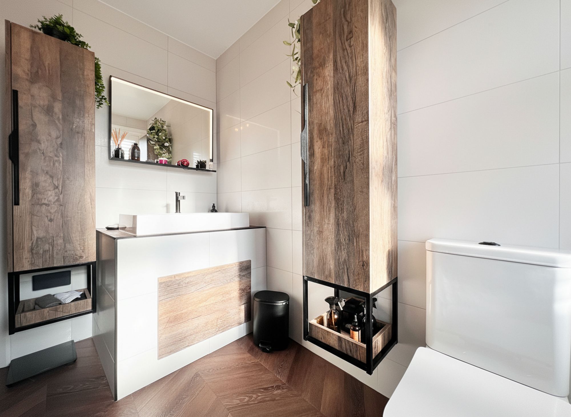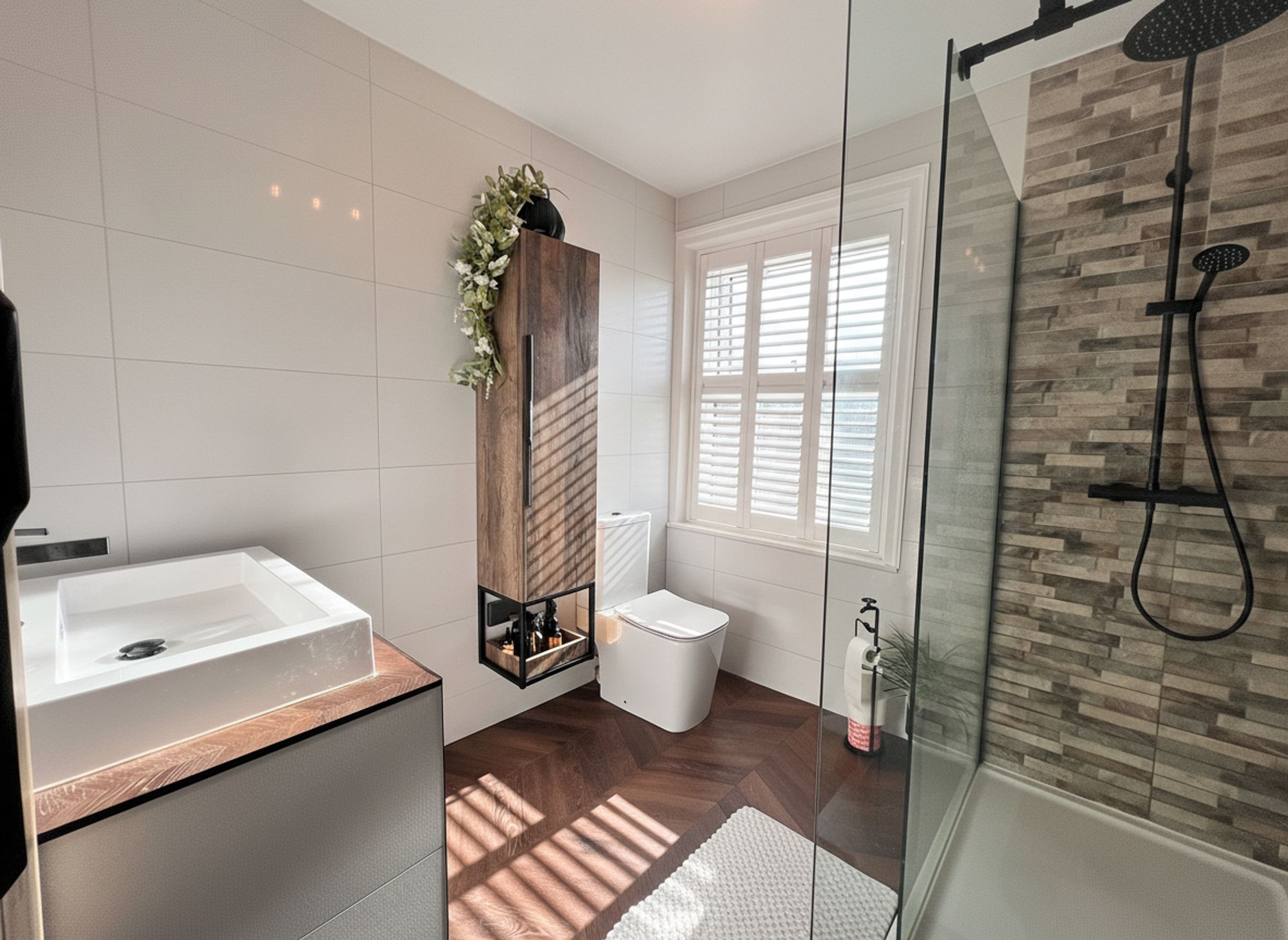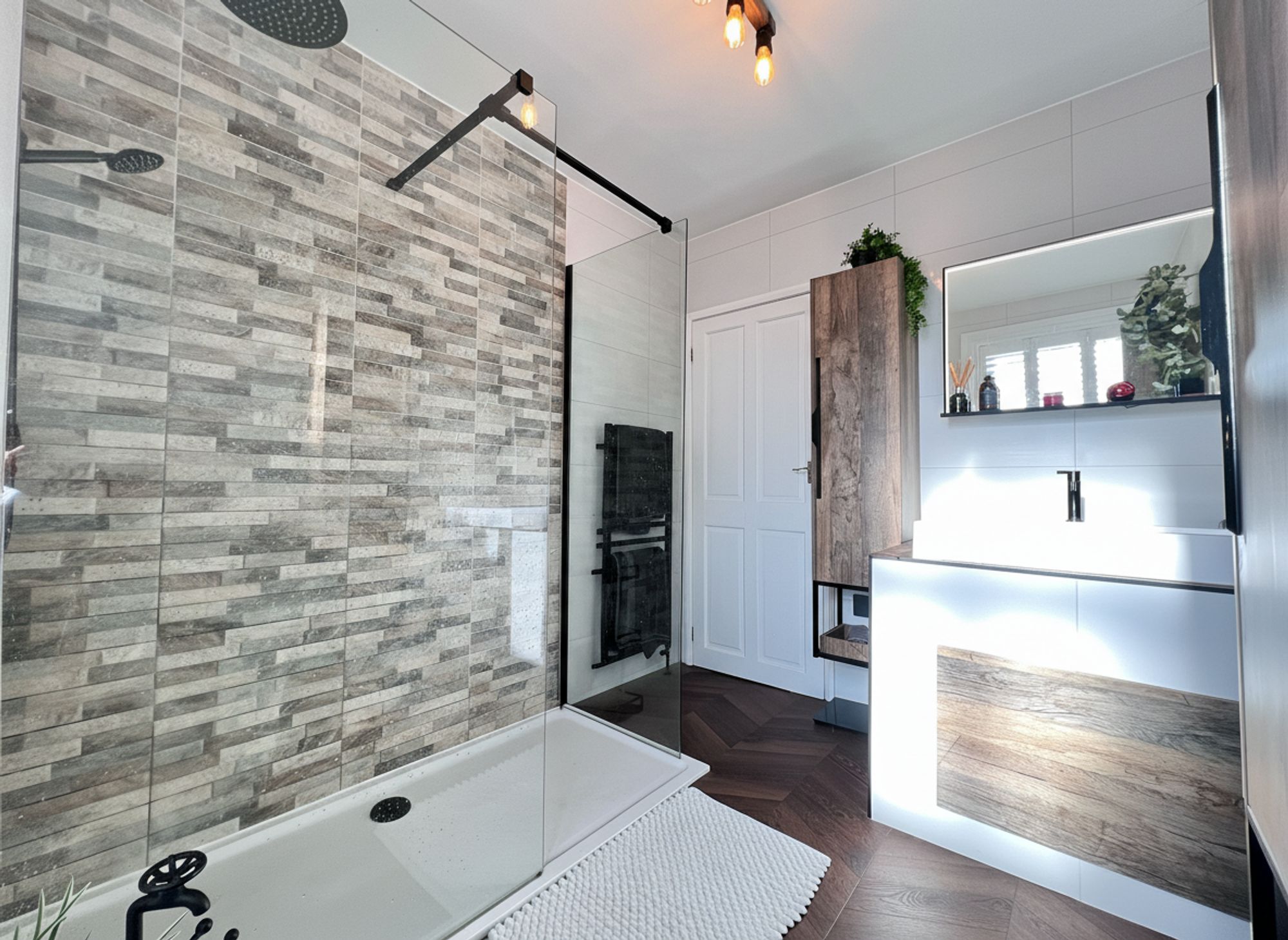 A newly installed and beautifully appointed shower room, enhanced by the comfort of underfloor heating. The space features a large walk-in shower cubicle with a rainhead shower and separate handheld attachment, complemented by sleek black accents and a contemporary glass shower screen. A stylish vanity unit incorporates the wash hand basin and WC, providing practical storage while maintaining clean, modern lines. A black heated towel rail adds both functionality and design appeal, while an illuminated mirror above completes this sophisticated and thoughtfully finished space.