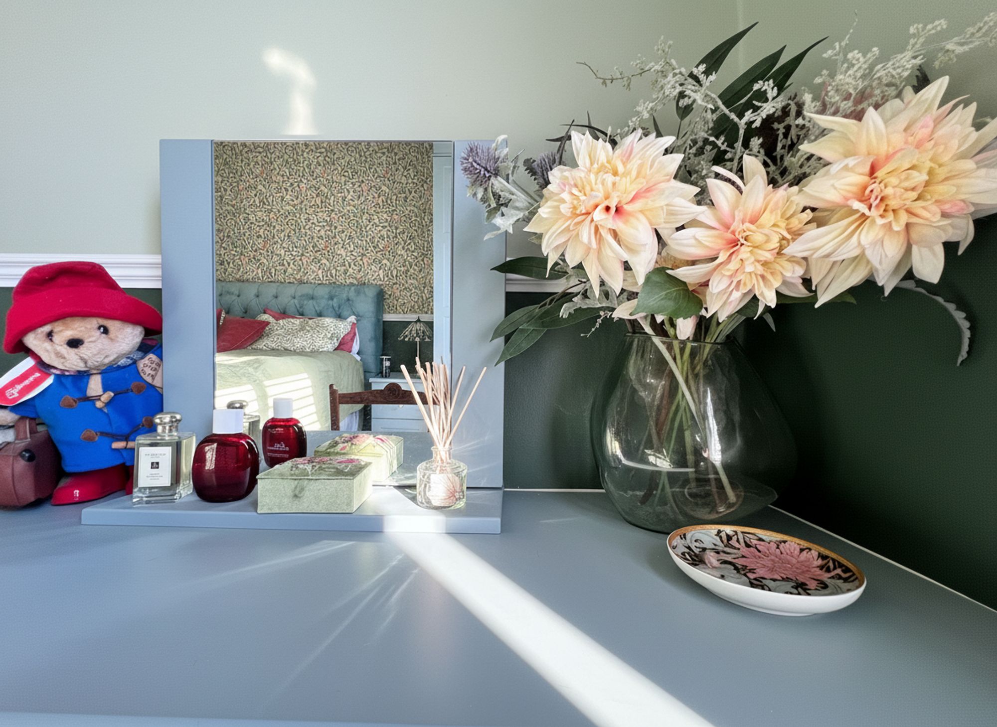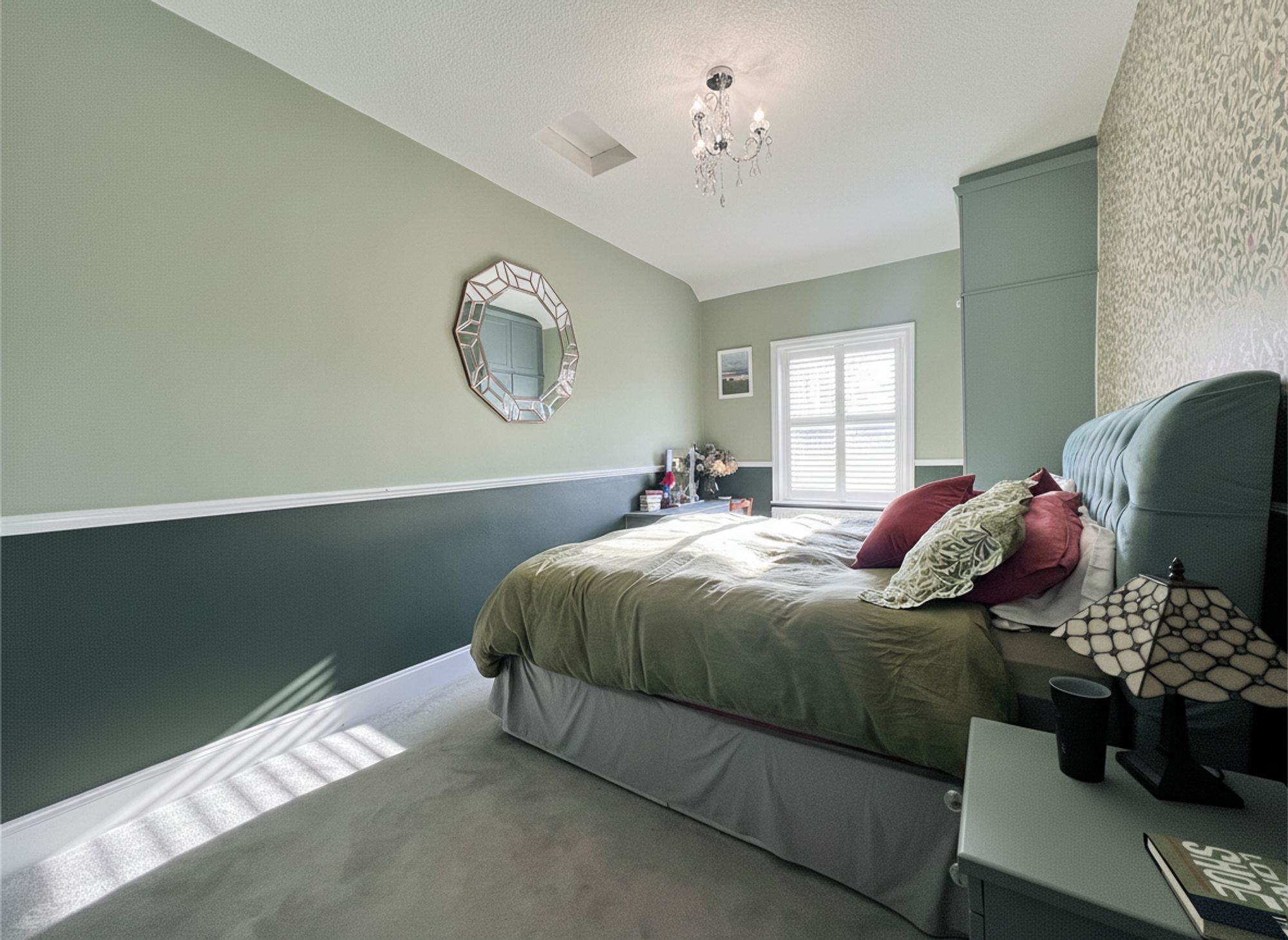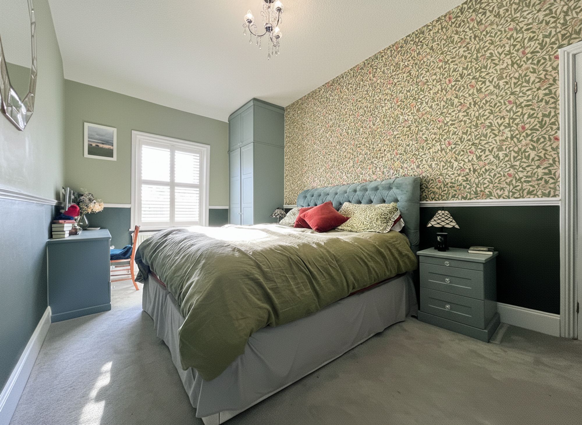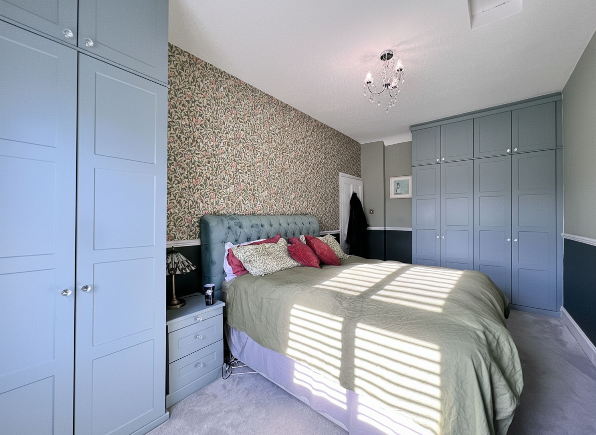 A fantastic super king-sized bedroom exuding interior design elegance, beautifully styled in rich, indulgent tones and enhanced by a striking feature wallpapered wall. Flooded with natural light courtesy of a large window, the room also enjoys far-reaching views towards the iconic Castle Hill, creating a truly captivating outlook. The space is further complemented by a comprehensive range of bespoke fitted wardrobes, in addition to a dedicated dressing area, combining refined aesthetics with excellent practicality.