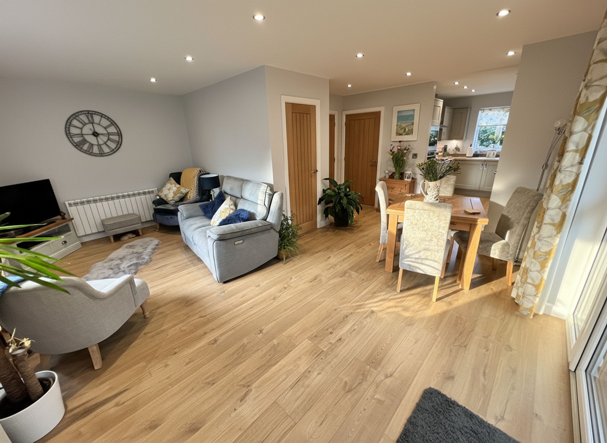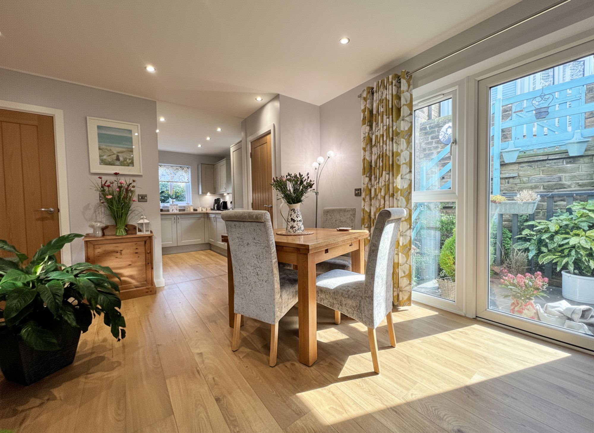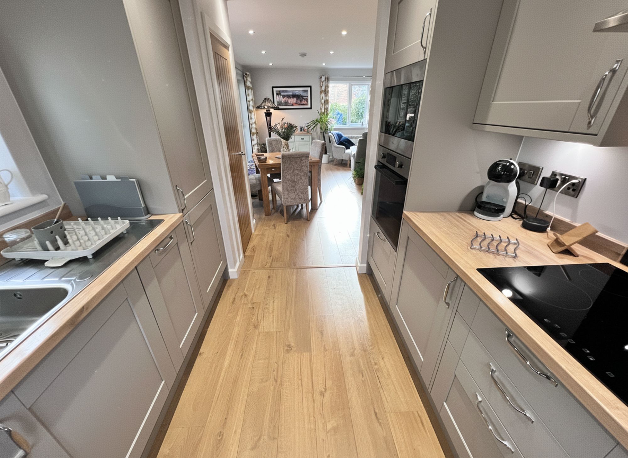 Beautifully decorated in soft grey tones and complemented by stylish wood laminate flooring, this impressive space is flooded with natural light courtesy of charming patio doors that open onto the outside decking, creating a wonderful indoor–outdoor feel. There is ample room to accommodate a family-sized dining suite, making the space both practical and sociable. The kitchen area is fitted with chic grey shaker-style units, finished with chrome handles and wood-effect laminate worktops that tie the whole aesthetic together seamlessly. Integrated appliances include a stainless steel sink with mixer tap, four-ring electric hob with electric oven and microwave above, fridge freezer, and slimline dishwasher making the annexe remarkably well equipped for independent living.