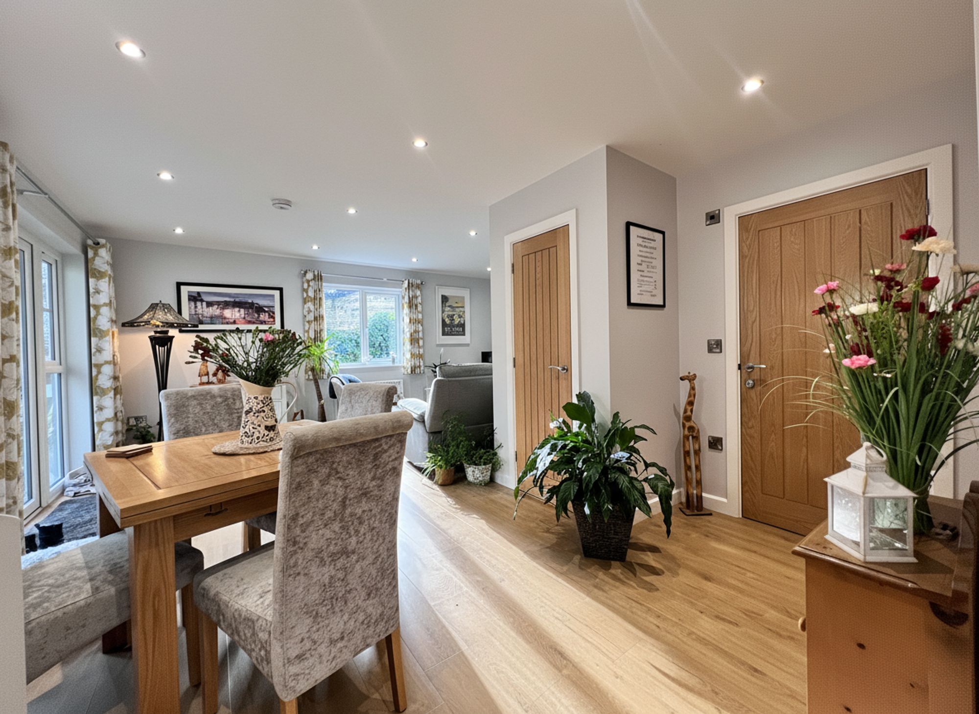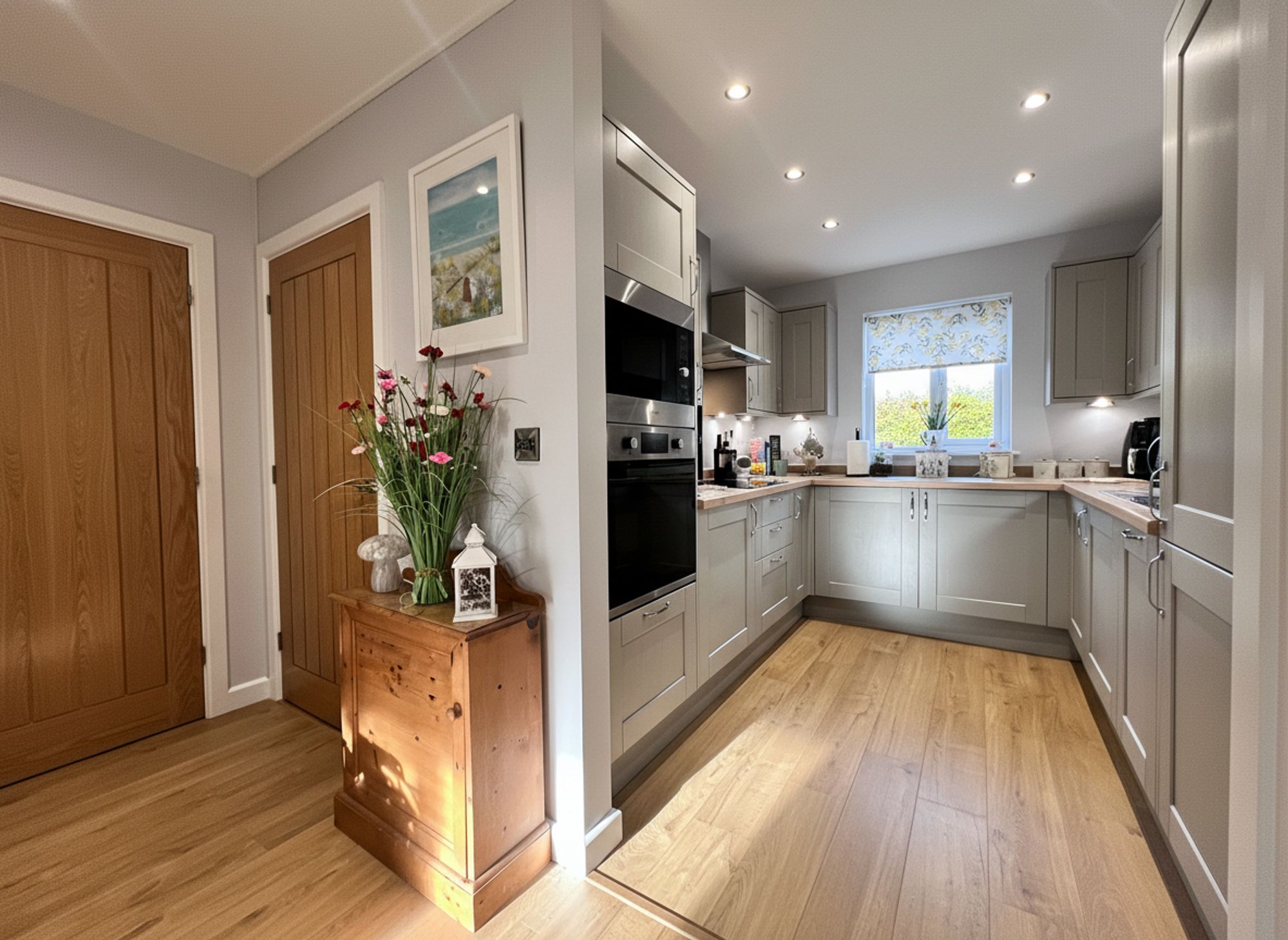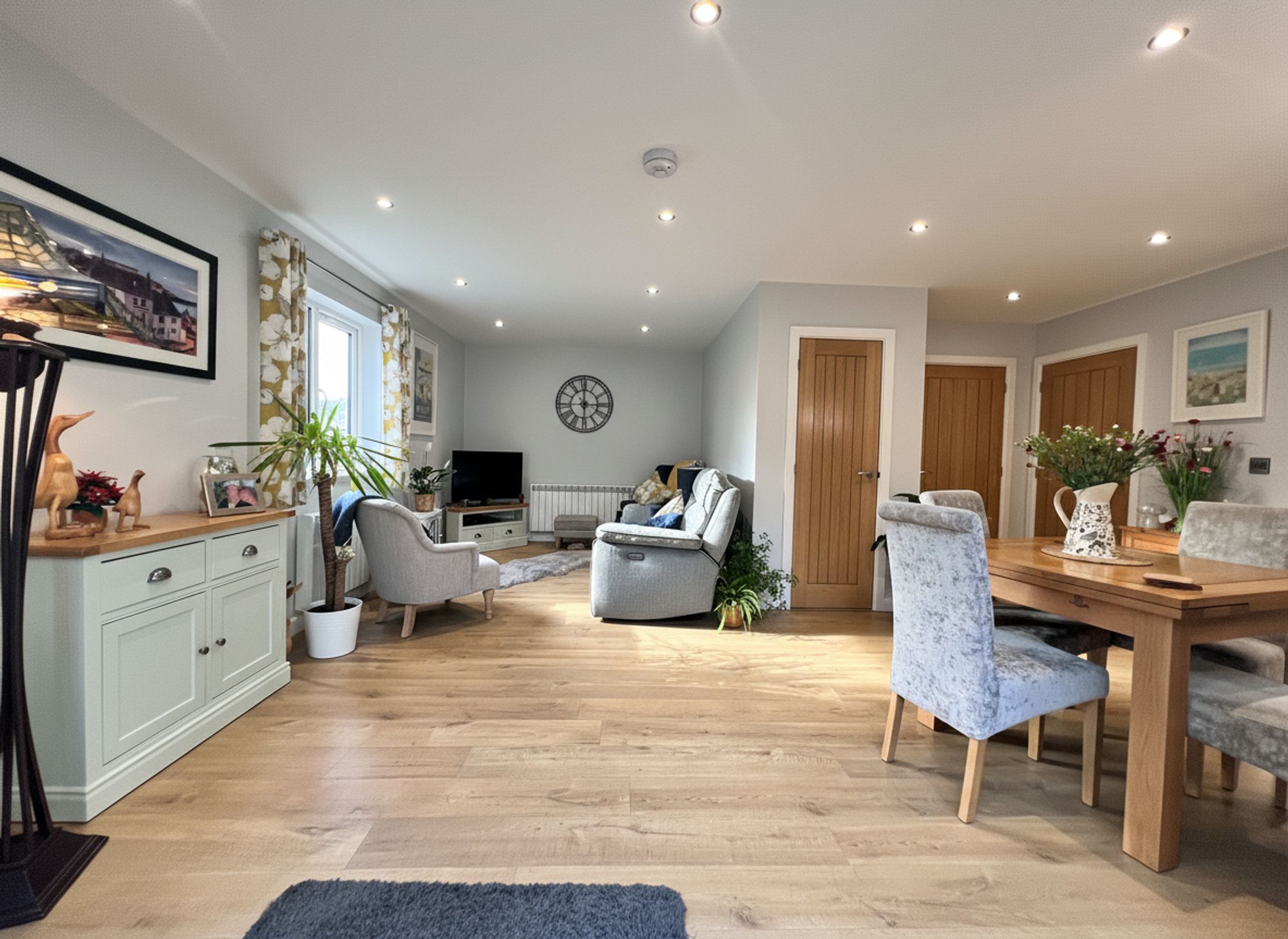 Beautifully decorated in soft grey tones and complemented by stylish wood laminate flooring, this impressive space is flooded with natural light courtesy of charming patio doors that open onto the outside decking, creating a wonderful indoor–outdoor feel. There is ample room to accommodate a family-sized dining suite, making the space both practical and sociable. The kitchen area is fitted with chic grey shaker-style units, finished with chrome handles and wood-effect laminate worktops that tie the whole aesthetic together seamlessly. Integrated appliances include a stainless steel sink with mixer tap, four-ring electric hob with electric oven and microwave above, fridge freezer, and slimline dishwasher making the annexe remarkably well equipped for independent living.