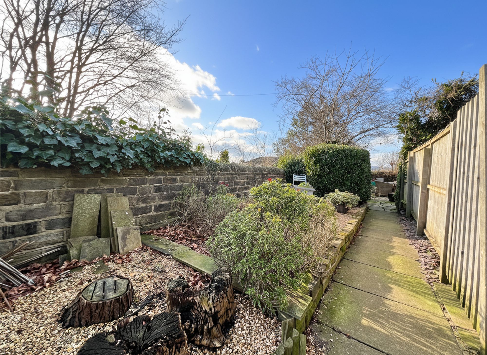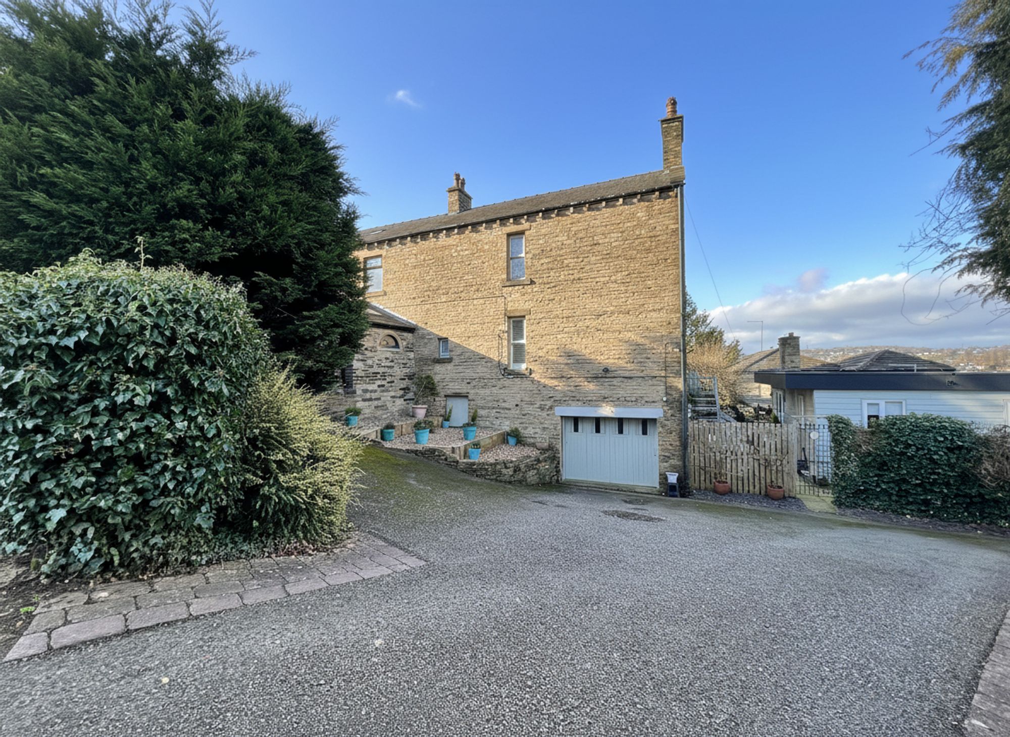 A sliding door from the kitchen opens to stone steps descending to the garage, which is currently utilised in part as a practical utility area with plumbing for a washing machine. The garage itself is a fantastic size, offering superb versatility and endless possibilities for reconfiguration whether retained for storage and workshop use or adapted to suit individual requirements, it presents excellent additional potential to complement the main accommodation.