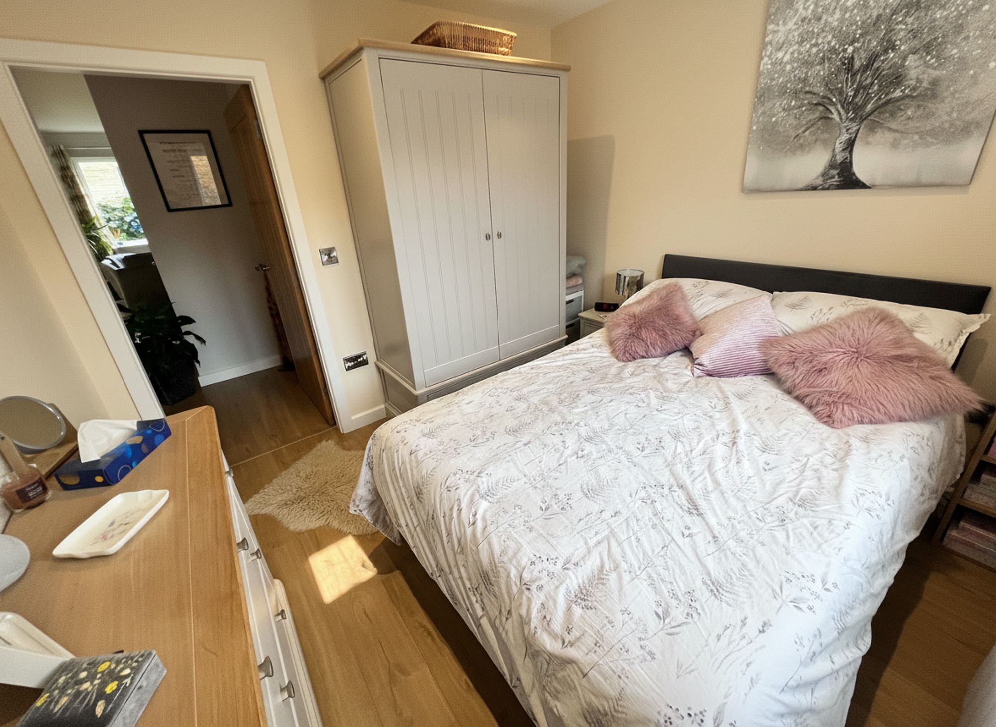 Another fantastic sized bedroom, positioned to the front of the property and therefore enjoying the aforementioned far-reaching views across the surrounding landscape. Presented in soft, fresh tones, the room offers a calm and inviting atmosphere, further enhanced by bespoke fitted wardrobes that provide stylish and practical storage.