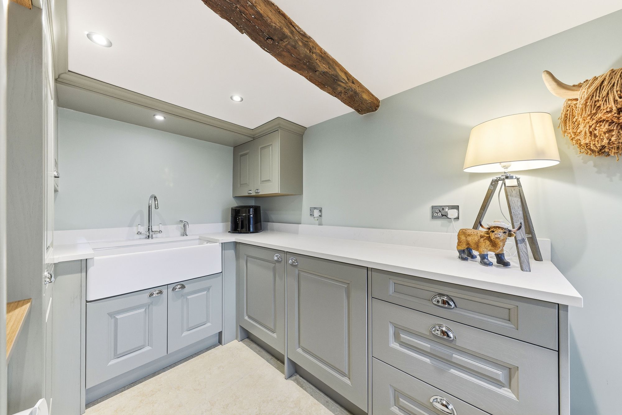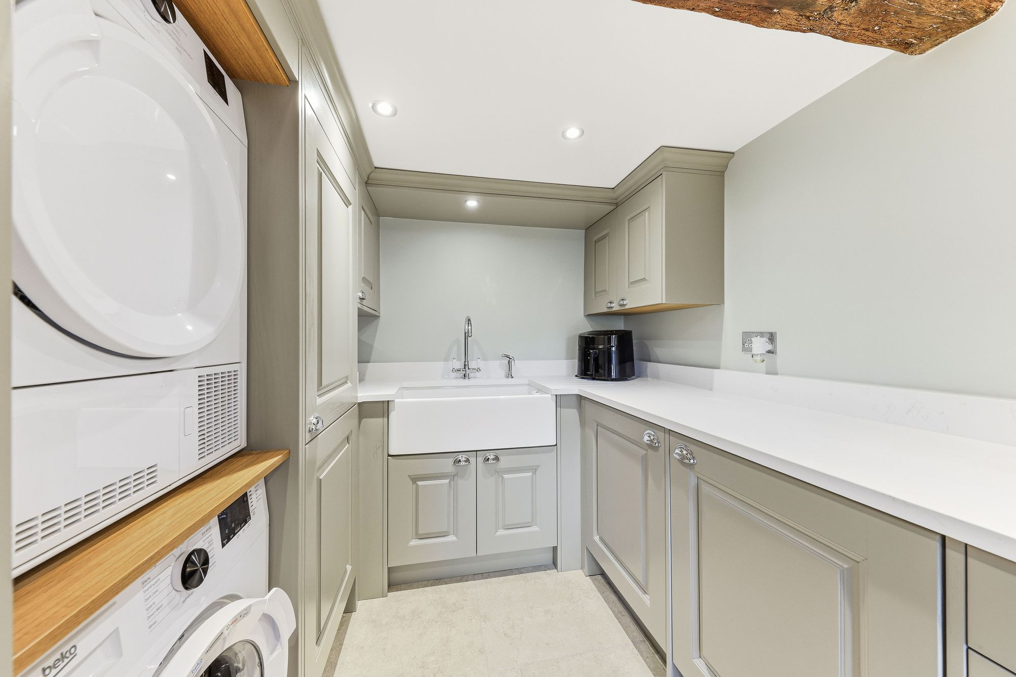 The utility room is superbly designed, combining practicality with timeless style. Finished with classic Shaker units topped with granite work surfaces, the space offers ample storage alongside plumbing for a washing machine and space for a freestanding dryer, ensuring everyday functionality is seamlessly catered for. A traditional Belfast sink with mixer tap adds further character, while a charming window seat is perfectly positioned beneath a picture-perfect window that frames idyllic views over the garden, creating a delightful spot to pause and enjoy the surroundings. With the added benefit of underfloor heating, this thoughtfully appointed utility room caters to all your laundry needs.