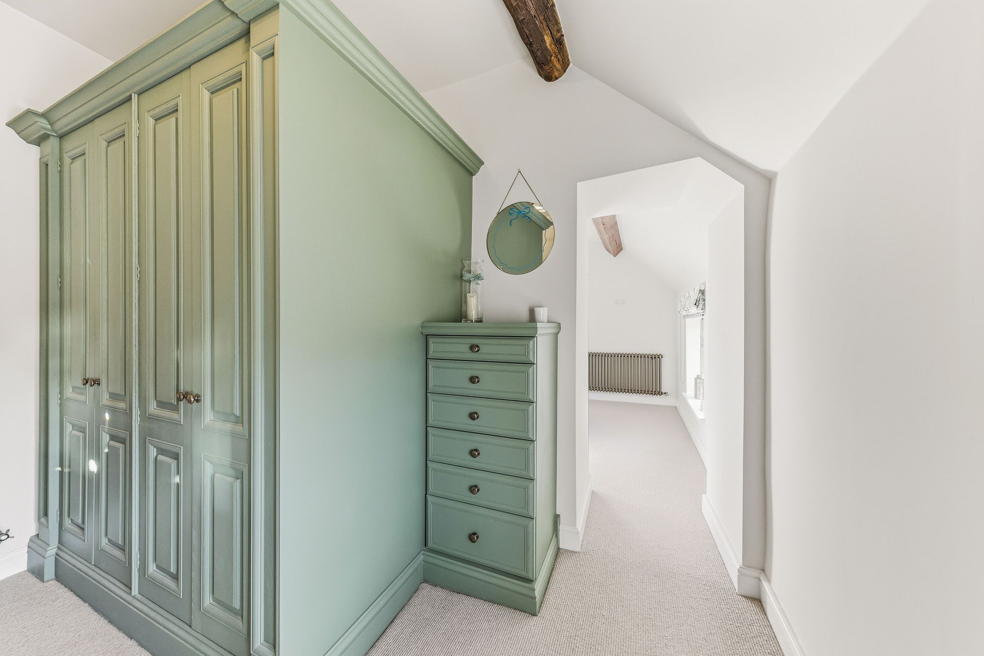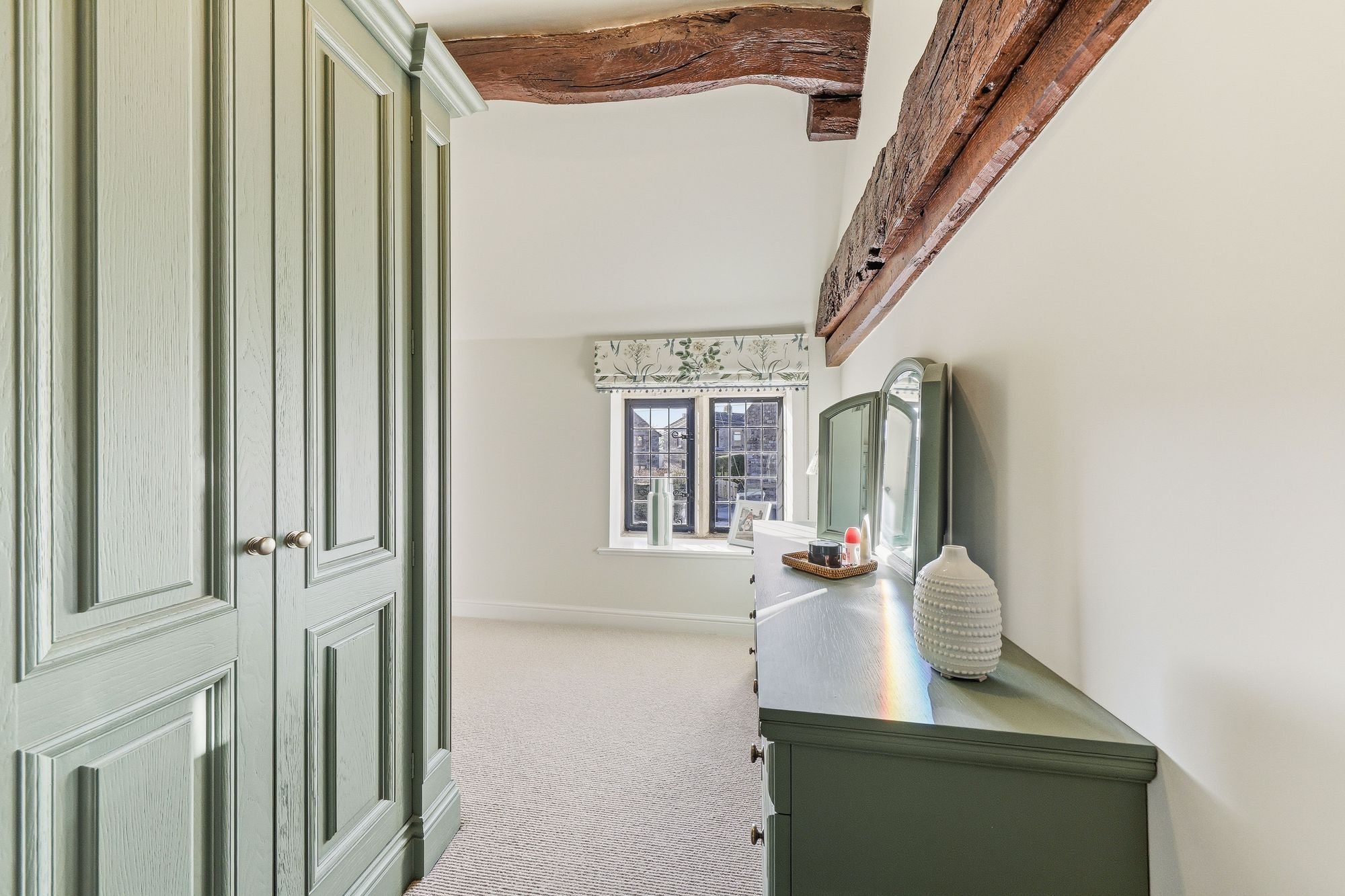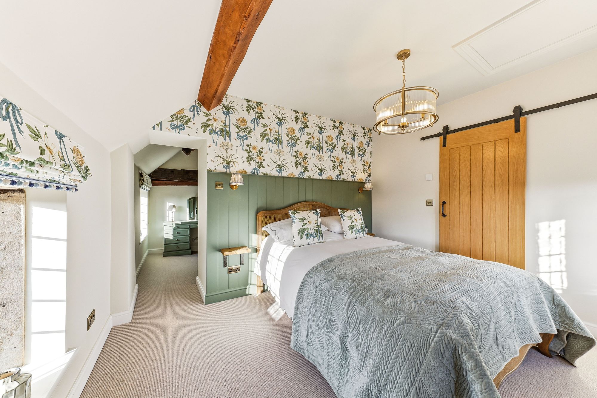 The principal bedroom exudes interior design elegance and is thoughtfully arranged to create a sense of calm and indulgence. On entering, you are welcomed into a beautifully appointed dressing area, complete with bespoke fitted wardrobes, providing a dedicated and stylish space to begin and end each day. An archway leads through to the bedroom itself, which offers a tranquil and serene retreat, finished in soft neutral tones and enhanced by half-height panelling and designer wallpaper. Natural light dances through charming stone mullioned windows, perfectly framing the previously mentioned countryside views and creating a particularly uplifting and peaceful space in which to wake each morning.