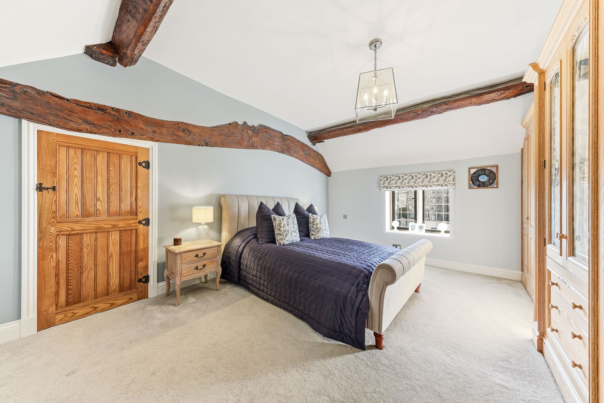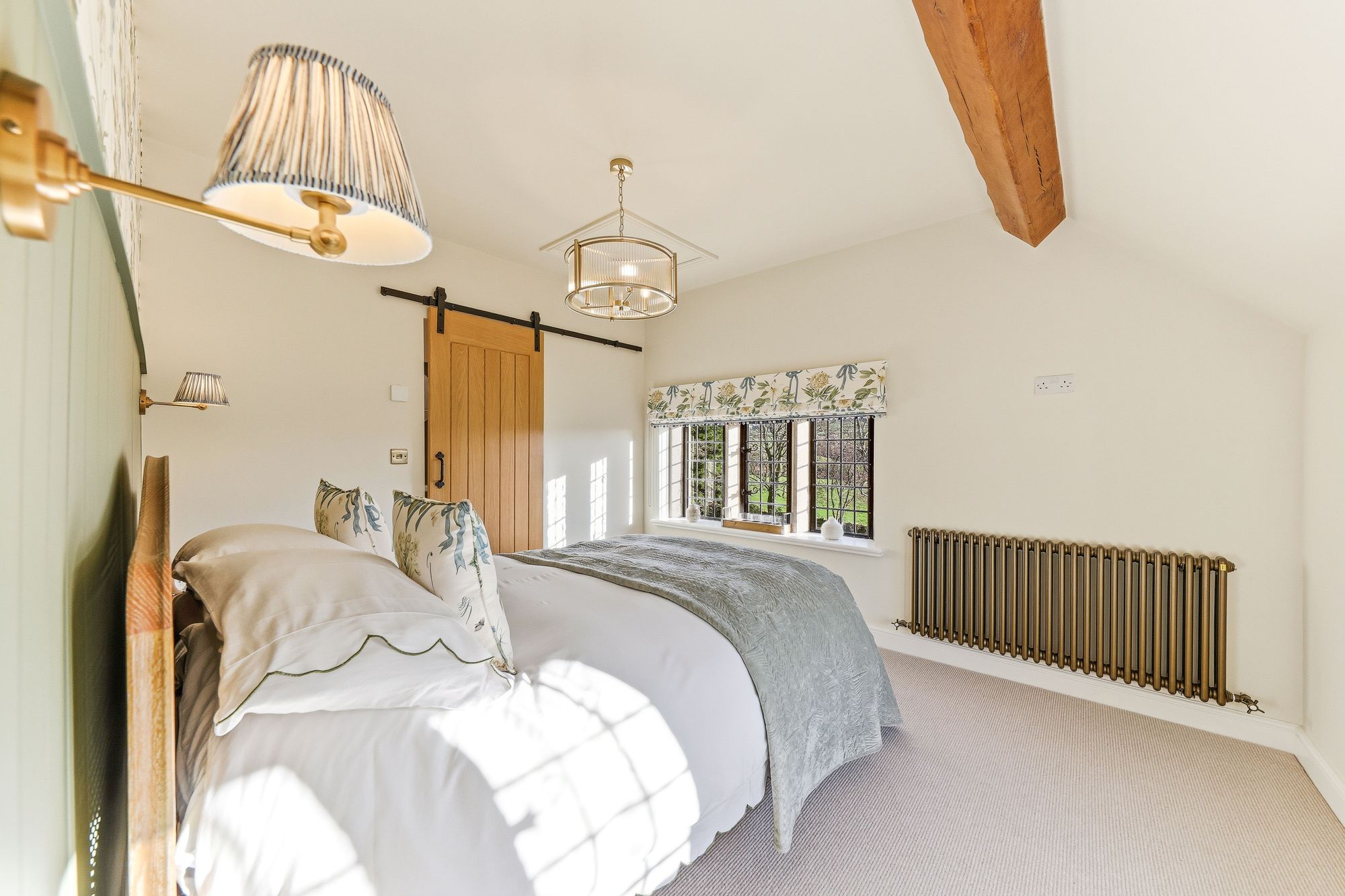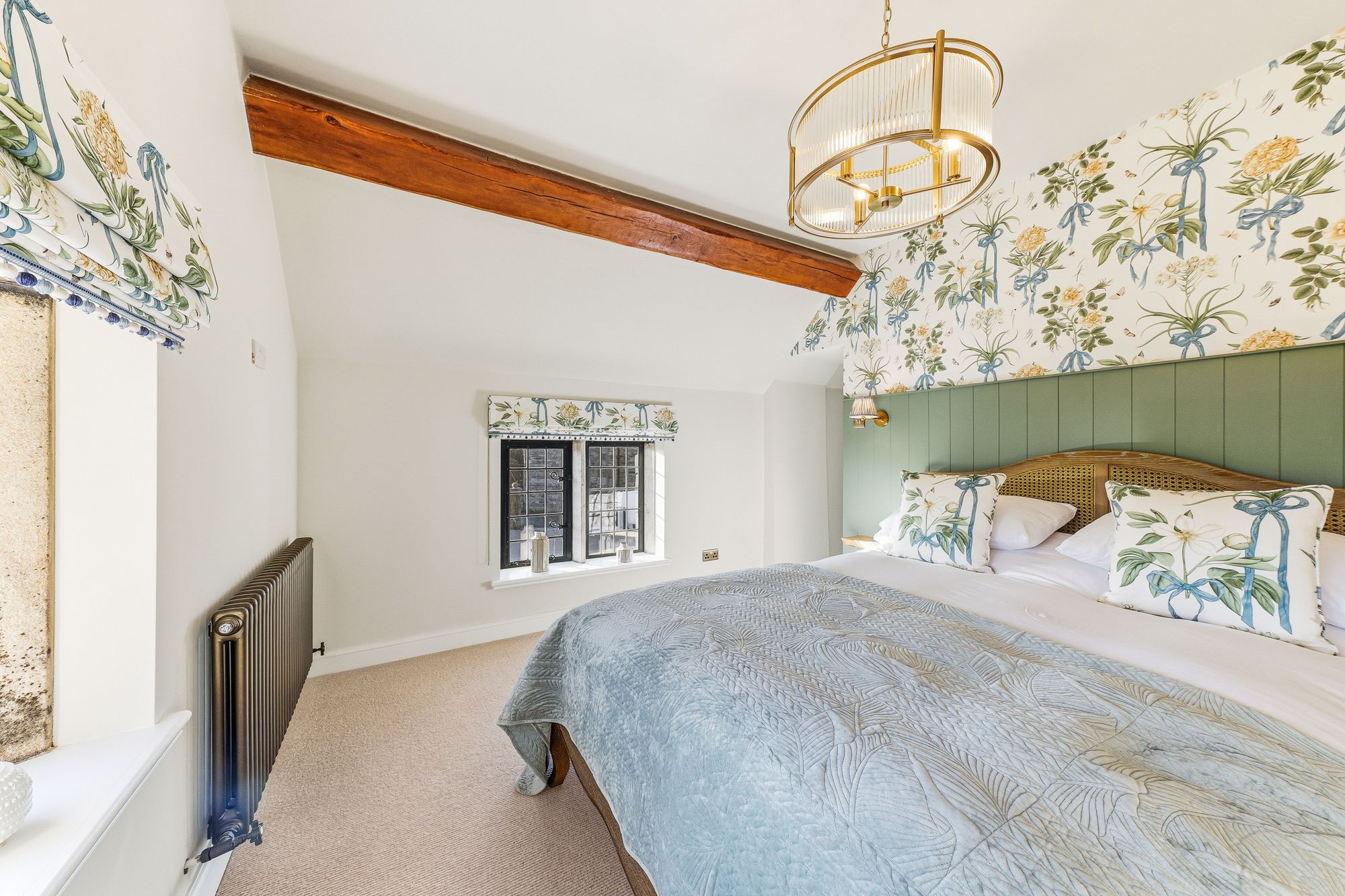 The principal bedroom exudes interior design elegance and is thoughtfully arranged to create a sense of calm and indulgence. On entering, you are welcomed into a beautifully appointed dressing area, complete with bespoke fitted wardrobes, providing a dedicated and stylish space to begin and end each day. An archway leads through to the bedroom itself, which offers a tranquil and serene retreat, finished in soft neutral tones and enhanced by half-height panelling and designer wallpaper. Natural light dances through charming stone mullioned windows, perfectly framing the previously mentioned countryside views and creating a particularly uplifting and peaceful space in which to wake each morning.