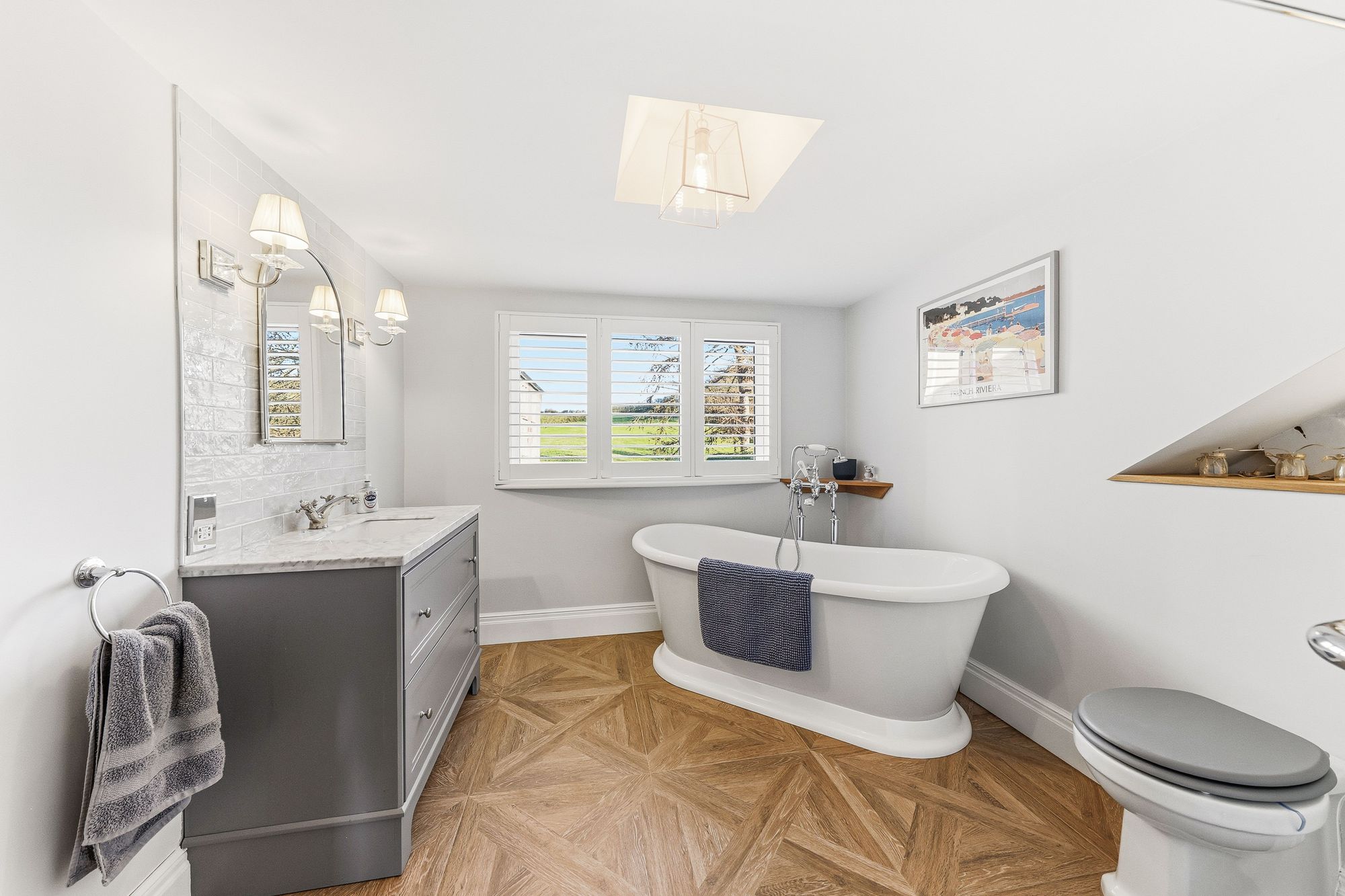 The en-suite bathroom is of exceptional proportion and beautifully designed, offering a truly indulgent retreat. A stunning freestanding roll-top bath with mixer tap takes centre stage, perfectly positioned to enjoy the setting, alongside a WC and wash basin set within a refined vanity unit. Further features include a useful storage cupboard, a period-style heated towel rail, and a large window fitted with shutter blinds framing outstanding rural views, filling the space with natural light and creating a serene atmosphere. This is a wonderful room in which to relax, unwind and enjoy a moment of quiet luxury.