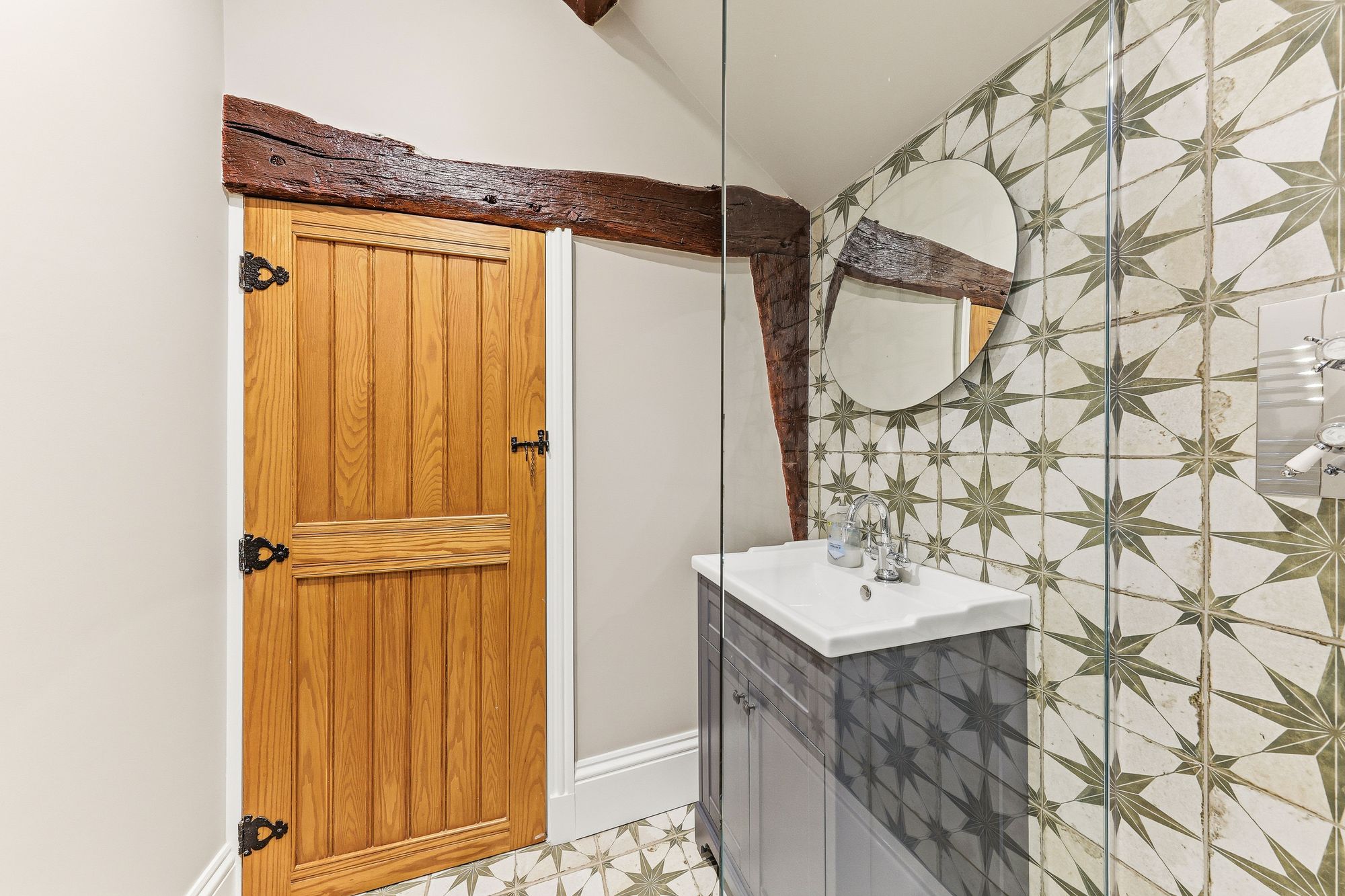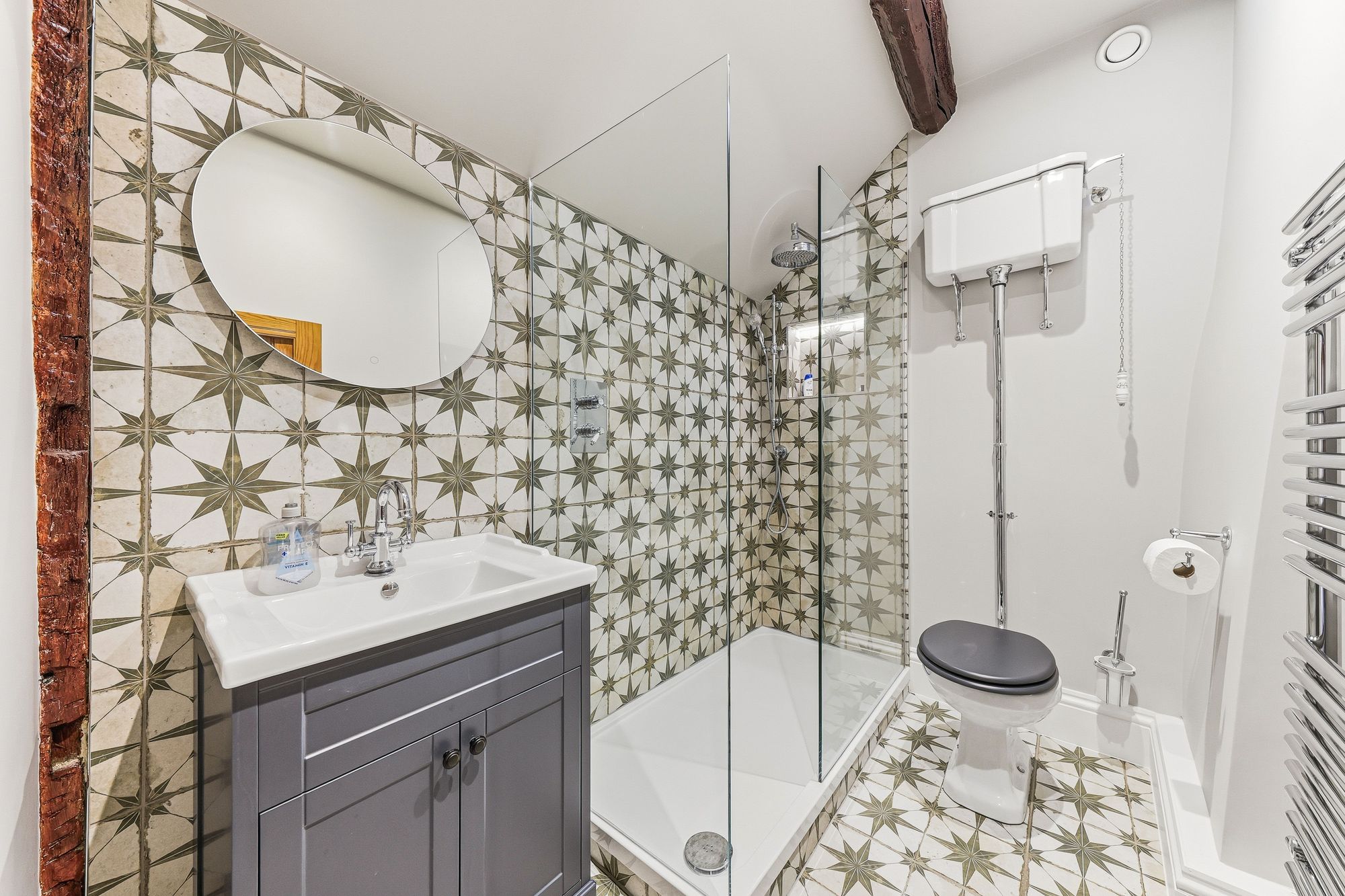 The recently fitted shower room exudes carefully curated style, beautifully combining contemporary finishes with period character. The space features a walk-in shower cubicle with overhead rainhead shower and separate handheld attachment, complemented by an illuminated inset shelf. A traditional high-level WC, chrome heated towel rail, and wash basin set within a sleek vanity unit complete the suite, while exposed beams and feature tiling to both the shower enclosure and flooring add texture and visual interest.