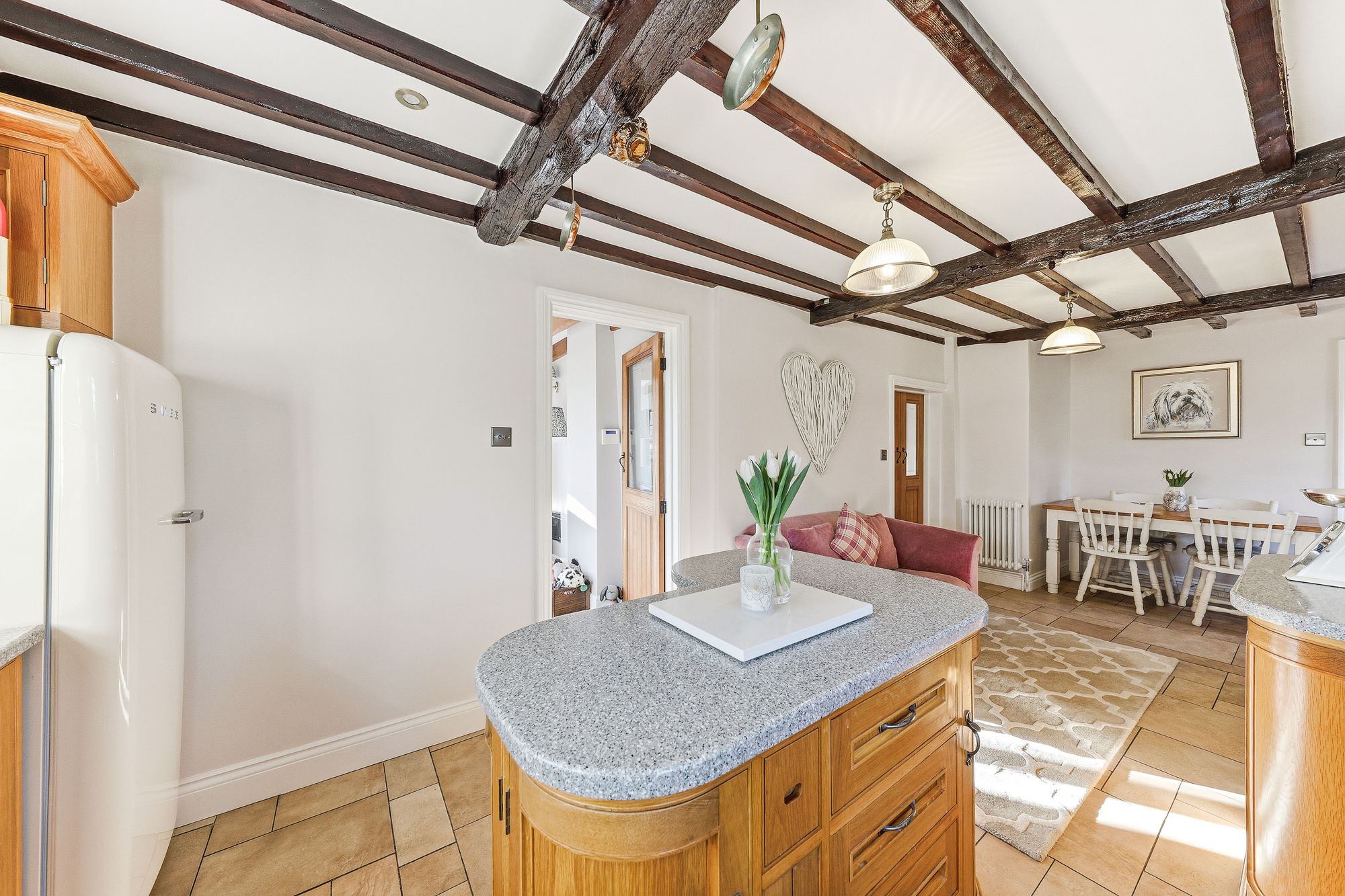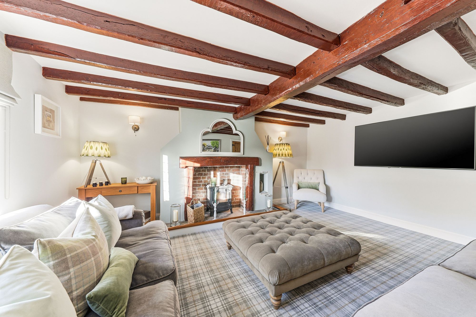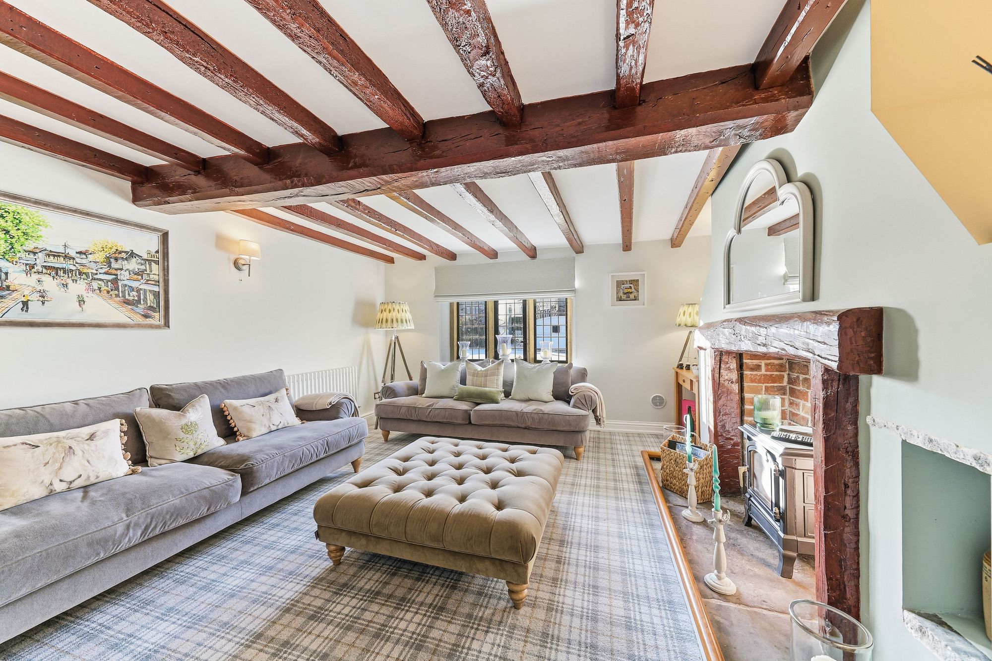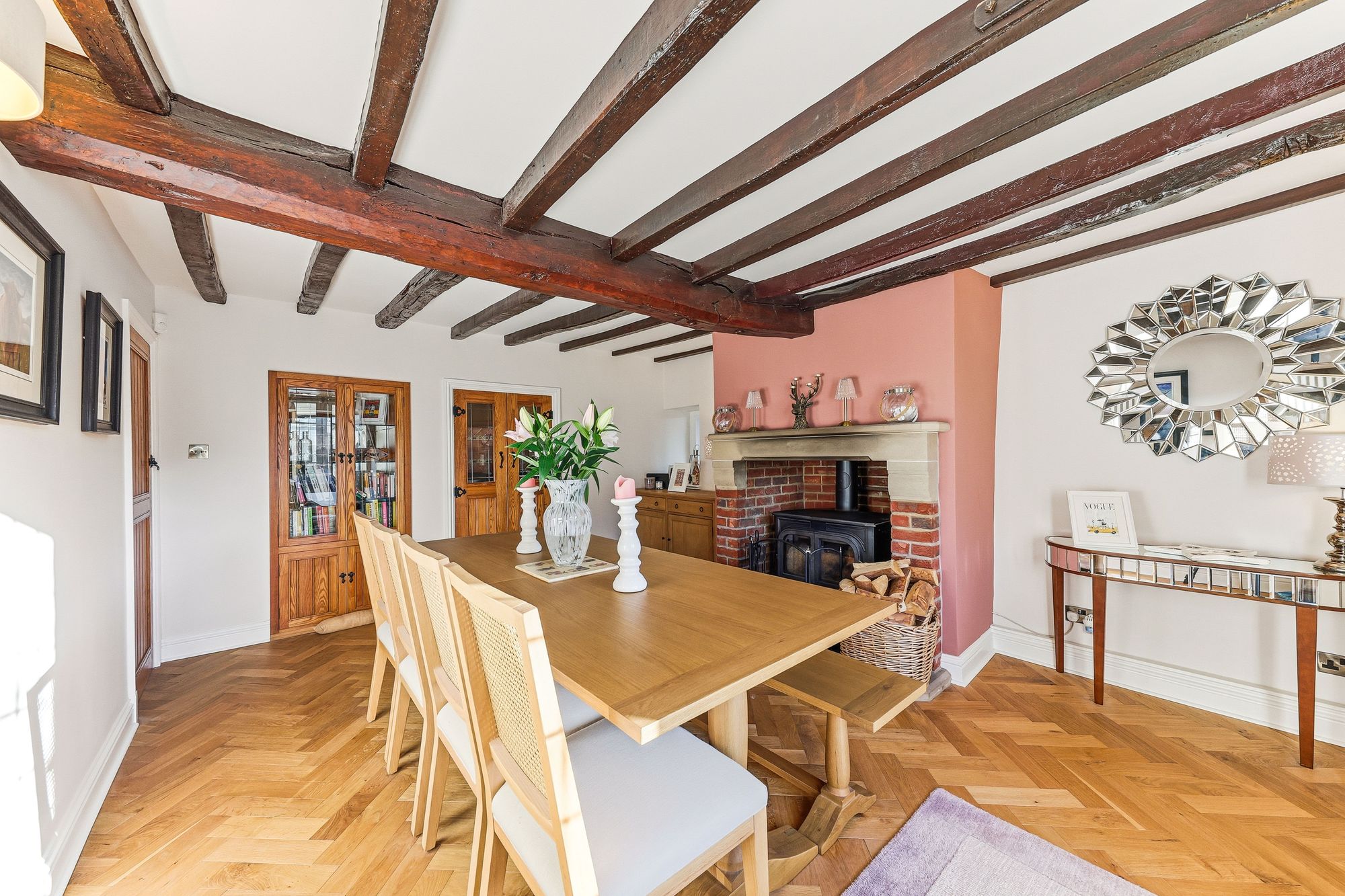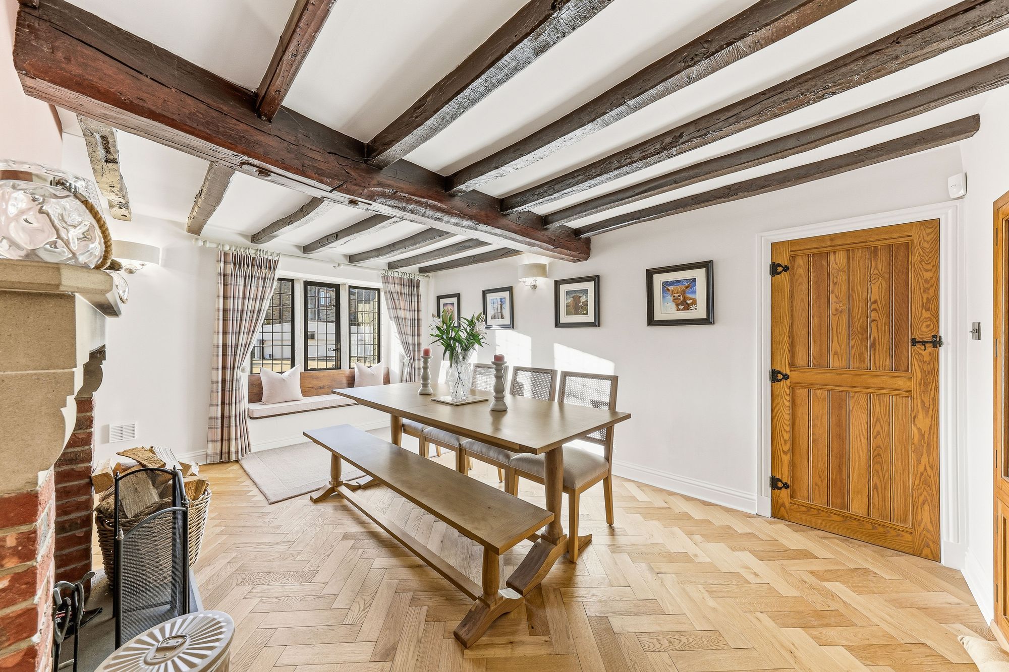 The lounge is a beautifully proportioned reception room, bursting with period charm and timeless character. A bank of stunning mullioned windows with leaded detailing frames the front elevation, allowing natural light to pour in while showcasing the home’s exquisite craftsmanship. Exposed beams add warmth and authenticity, complemented by an impressive inglenook brick fireplace with decorative stove fire, set upon a raised stone hearth and forming a striking focal point to the room. Decorated in soft, warm tones, the lounge offers generous proportions ideal for both relaxed family living and refined entertaining.