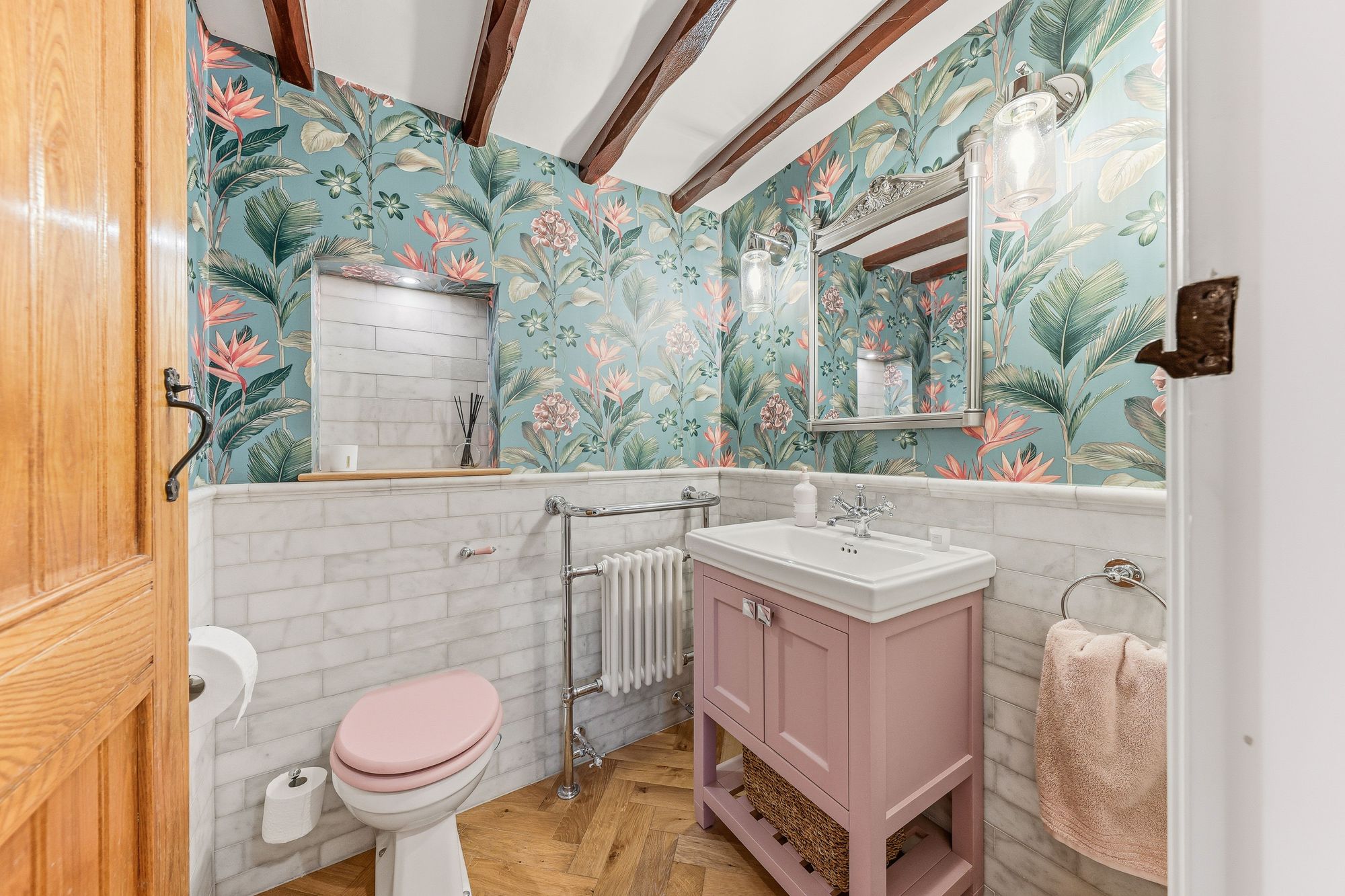 The ground floor WC is elegantly finished with beautiful designer wallpaper and complementary tiling, enhanced by stylish herringbone flooring. The suite comprises a WC and wash basin set within a bespoke-style vanity unit, while a period-style heated radiator adds comfort.
