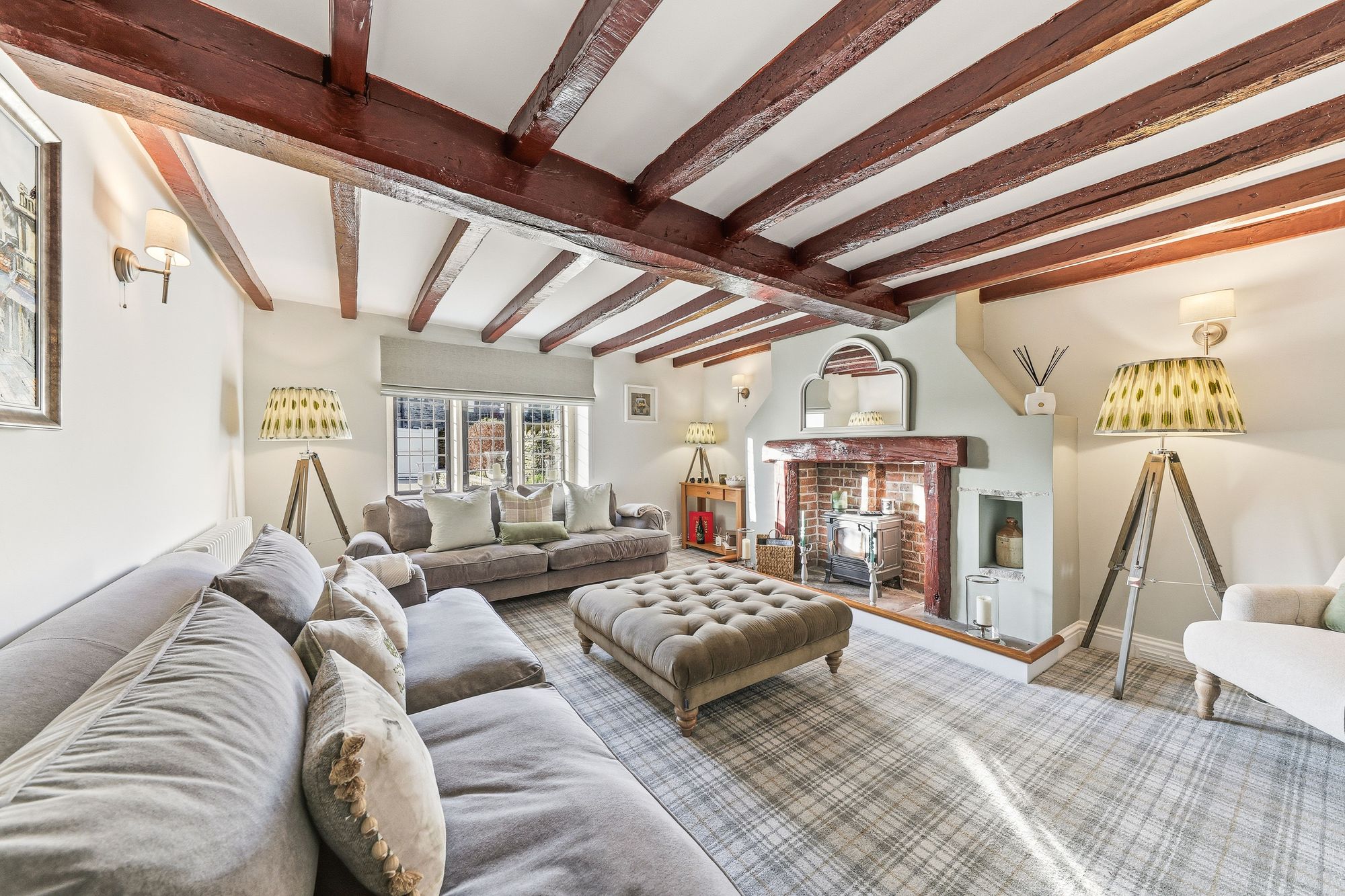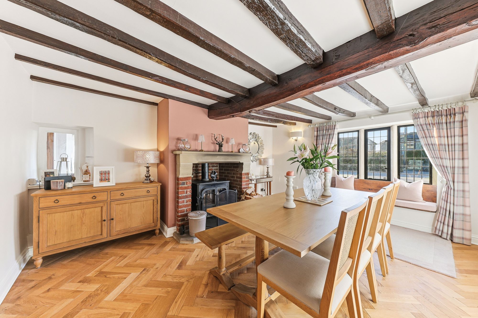 The dining room can be accessed via both the entrance hallway and the dining kitchen, creating an exceptionally sociable space ideal for entertaining and special occasions. Retaining a continuation of the home’s original exposed beams, the room is rich in character. The striking focal point is an impressive inglenook fireplace, set within an exposed brick surround and housing a multi-fuel stove, which also incorporates an additional back boiler. The room is flooded with natural light courtesy of beautiful mullioned windows, complemented by a charming window seat beneath, while herringbone flooring adds a further touch of elegance. Comfortably accommodating a family-sized dining suite, this is a wonderful space in which to dine, gather and entertain within a setting of timeless character.
