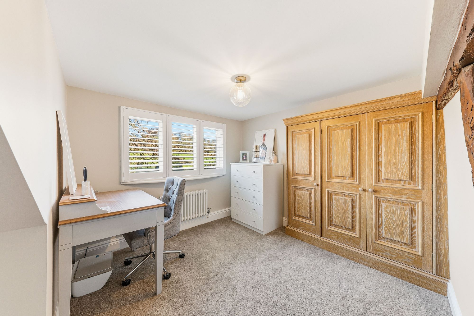 This well-proportioned double bedroom, located to the front elevation, is rich in character and charm. Features include exposed beams, beautiful mullioned windows allowing natural light to flow through, and fitted wardrobes providing excellent storage.