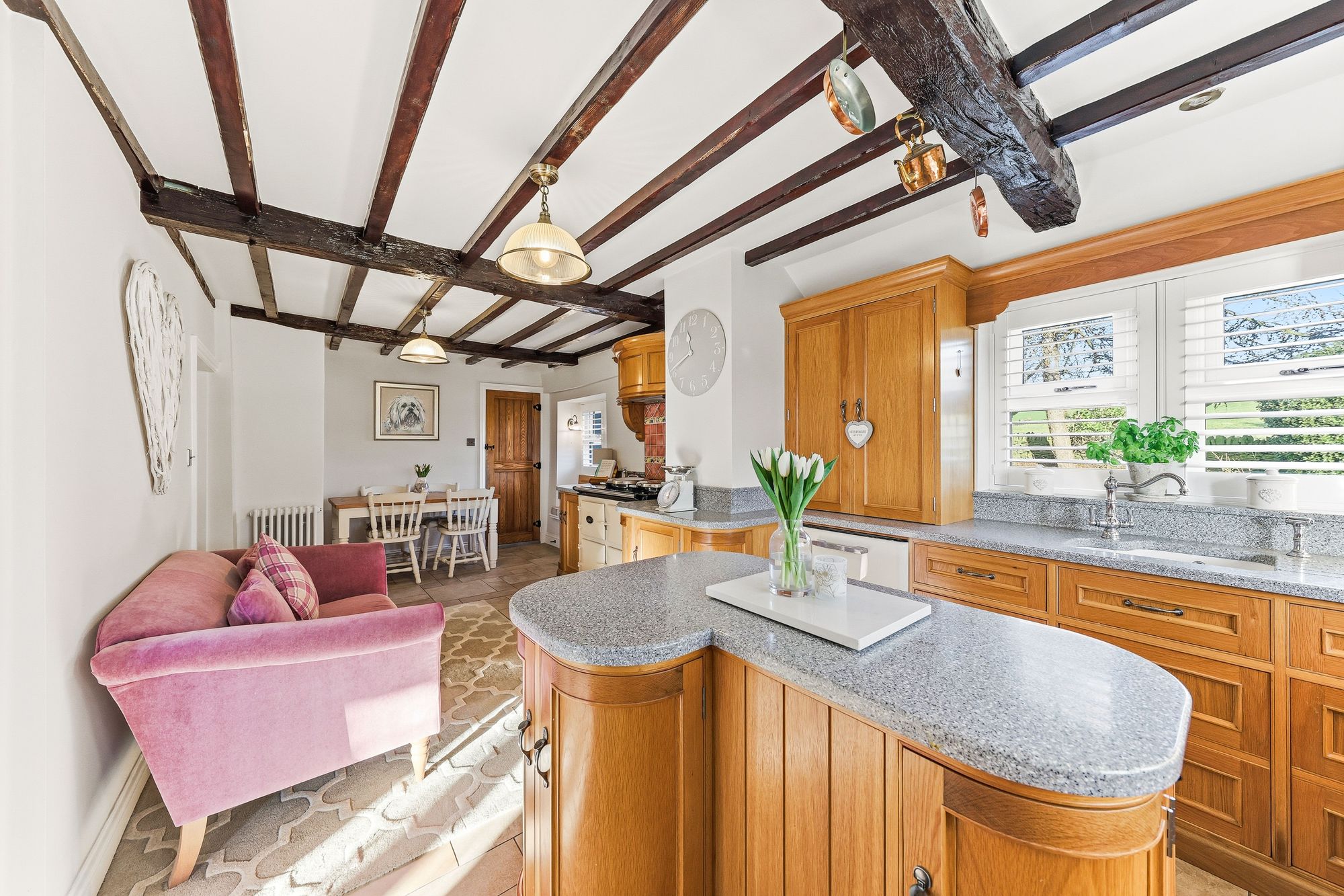 The open-plan breakfast kitchen is a truly exceptional space, awash with natural light that pours through expansive dual-aspect windows to both the rear and side. These frame breathtaking, uninterrupted views across the sweeping gardens and open countryside beyond, creating a daily connection with the surrounding landscape. At its heart sits a bespoke fitted oak kitchen, beautifully crafted with elegant Shaker-style cabinetry and dressed with luxurious Corian work surfaces. These incorporate a ceramic sink with a bevelled drainer and chrome mixer tap, marrying timeless style with modern practicality. Perfectly suited for entertaining and everyday family living, the kitchen is equipped with a cream twin-plate AGA, alongside space for a freestanding fridge freezer and plumbing for a dishwasher. Doors lead seamlessly into the garden room, enhancing the sense of flow between indoors and out and completing a space that is as impressive as it is inviting.