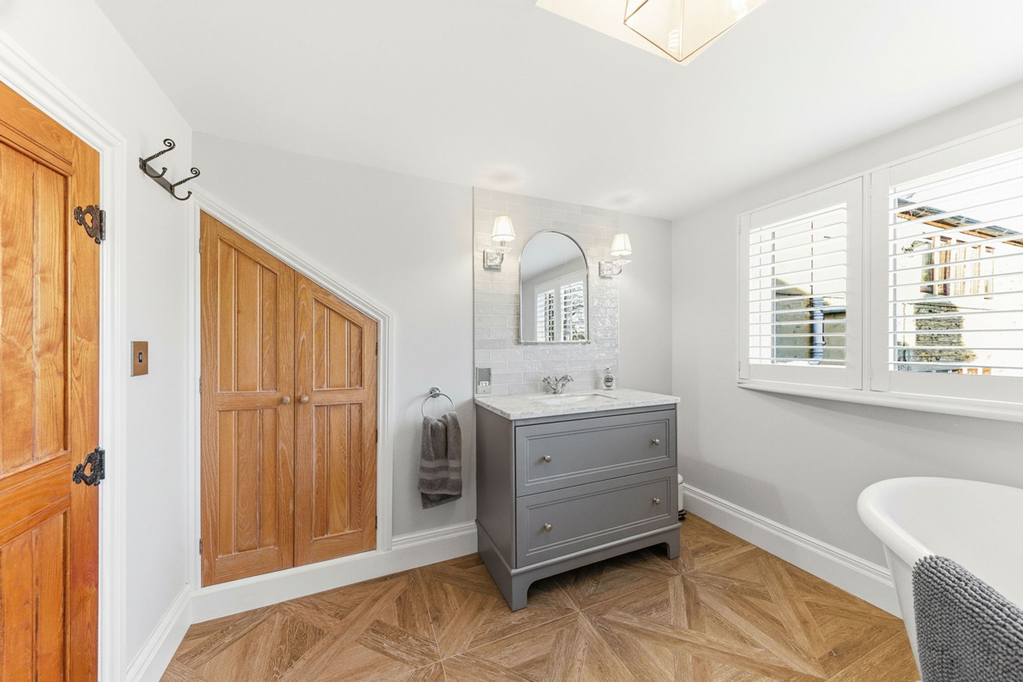 An oak sliding door reveals the brand new en-suite shower room, beautifully finished and benefitting from underfloor heating for year-round comfort. The space features a luxurious large walk-in shower, complete with an overhead rainhead shower and separate handheld attachment. Finished in elegant grey tiling and complemented by a continuation of the refined panelling seen within the bedroom, the design flows seamlessly, tying the overall aesthetic together with understated sophistication. The en-suite is further enhanced by a wash basin set within a stylish vanity unit, a WC, and a period-style heated towel rail, completing this impeccably presented space.