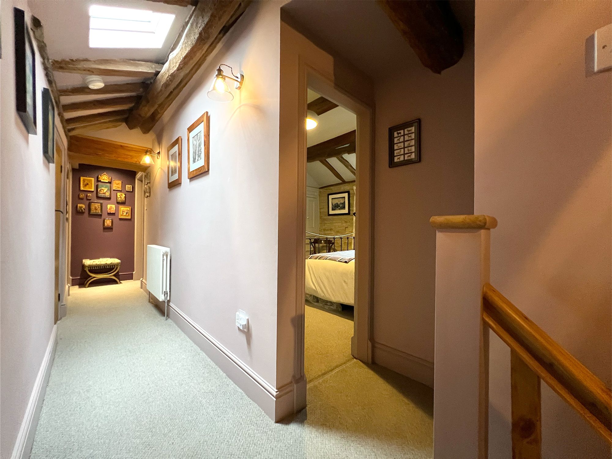 The landing oozes character, defined by its charming beamed ceiling that guides you to the first-floor rooms. A striking exposed stone feature shelf adds an artistic touch, providing a perfect spot for displaying personal treasures or plants. Conveniently, there is also a useful storage cupboard on the landing, ideal for keeping everyday essentials neatly tucked away. This inviting space sets a lovely tone for the upper level of the home, enhancing both its practicality and its overall charm.