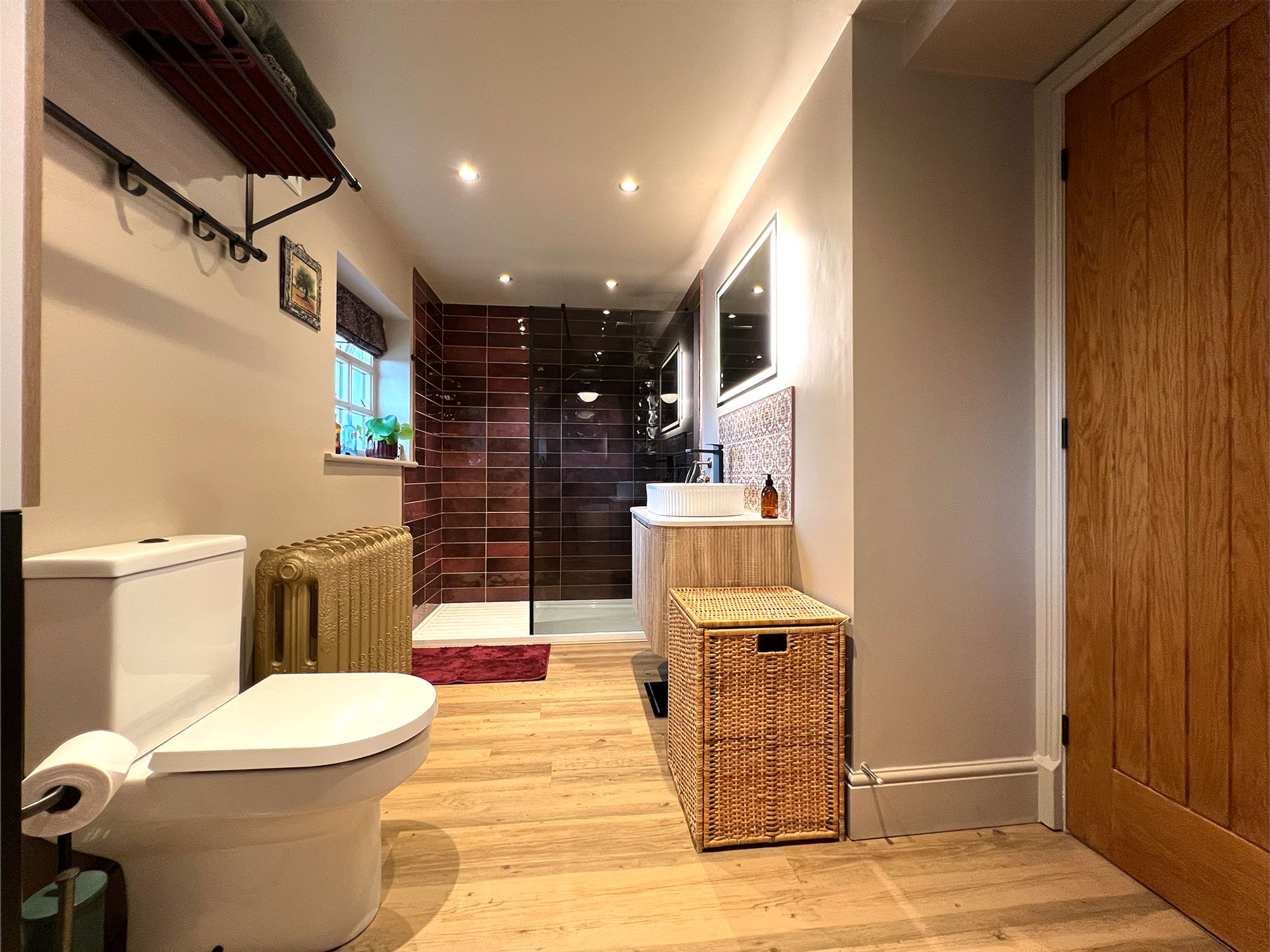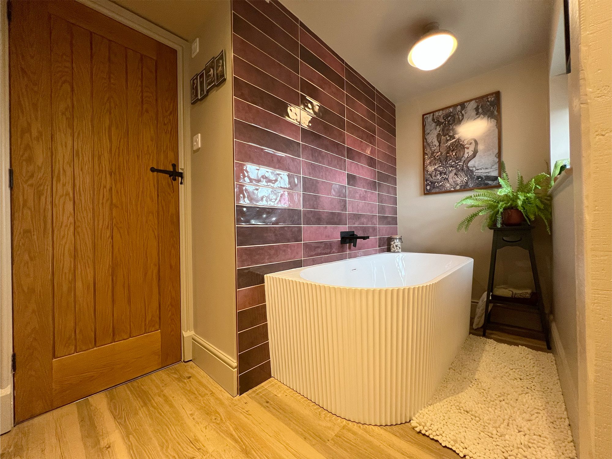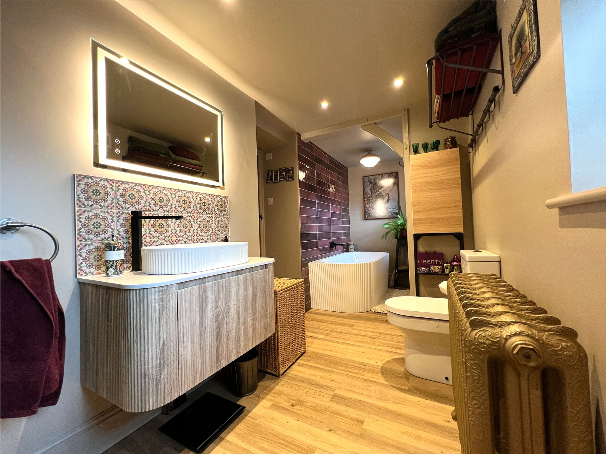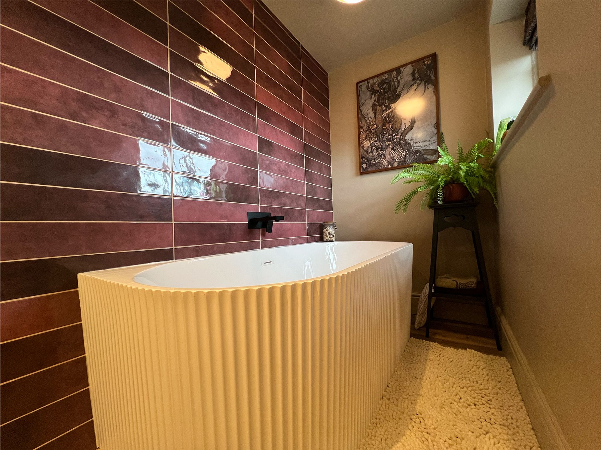 This brand-new fitted bathroom presents a stunning aesthetic with a luxurious, spa-inspired design. Featuring a fabulous, free-standing, modern fluted bath, the perfect retreat for relaxation in style. Complementing this is a chic floating fluted wooden vanity unit, complete with an integrated sink, a sleek black mixer tap, and a striking feature-tiled splashback. An illuminated mirror above enhances both practicality and atmosphere. For added indulgence, a large walk-in shower cubicle features a contemporary black rainhead shower and a glass screen, creating a sleek and open feel. Beautiful purple tiling ties the entire look together, blending elegance and bold style. Completing the look, a French antique column radiator adds both warmth and timeless character, seamlessly marrying modern luxury with classic charm.