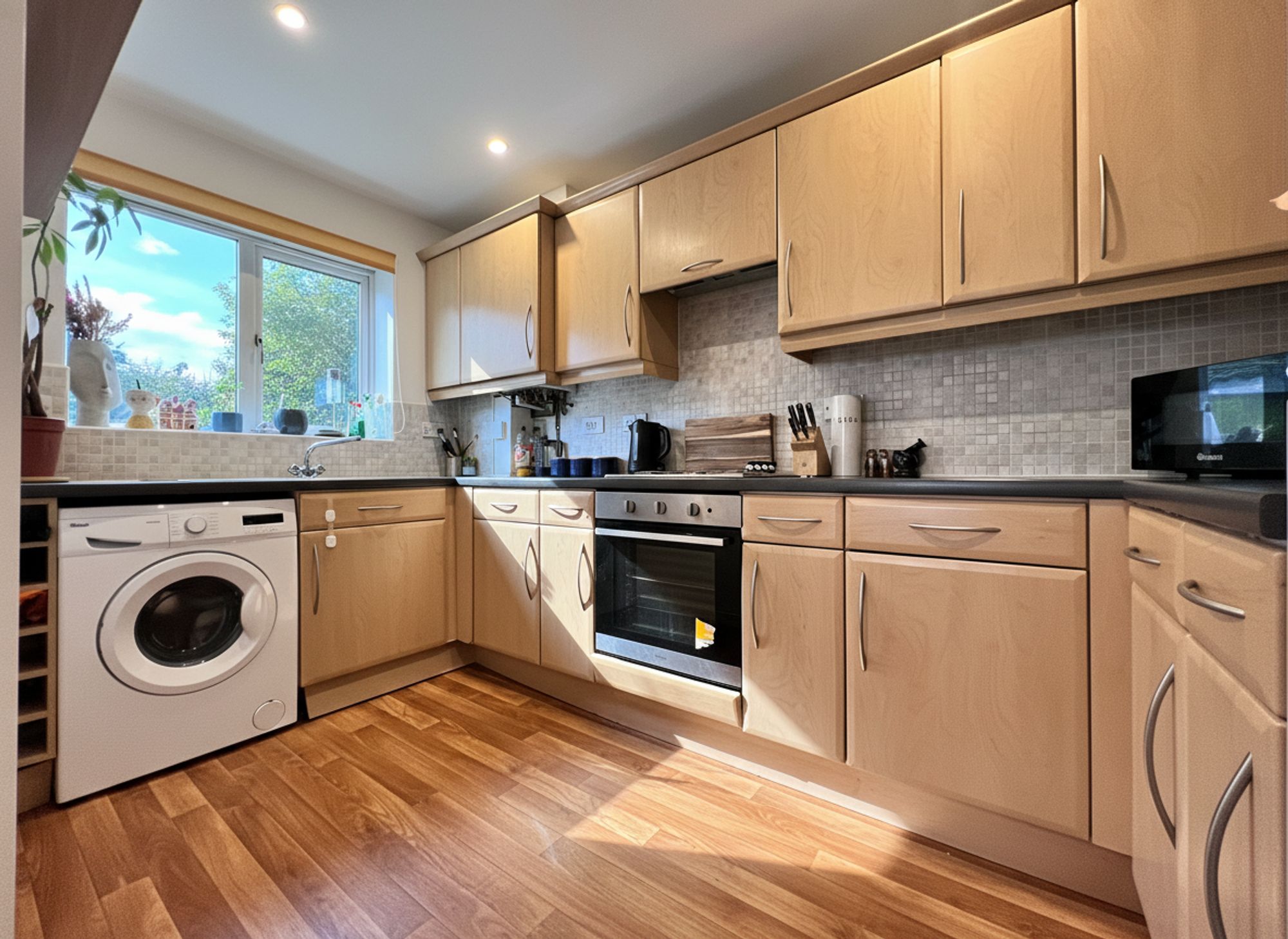 Open plan to the lounge, the kitchen creates a fantastic sociable space ideal for both everyday living and entertaining. It features a range of fitted units complemented by coordinating work surfaces. Integrated appliances include an electric oven, four-ring electric hob and stainless steel sink with mixer tap, along with space for a freestanding fridge freezer and plumbing for a washing machine.