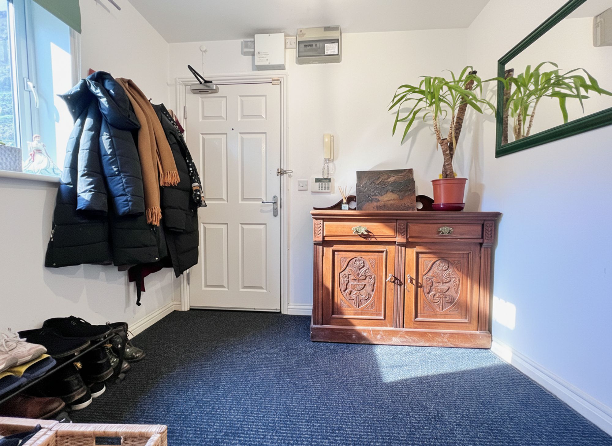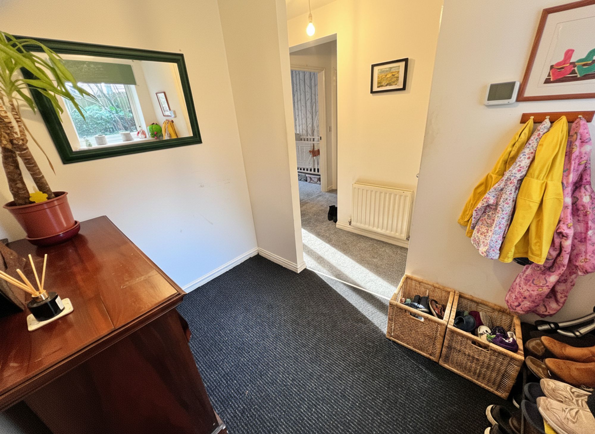 A spacious and welcoming entrance hallway offering ample space for coats and footwear, with a door leading to a useful built-in storage cupboard providing excellent additional storage.