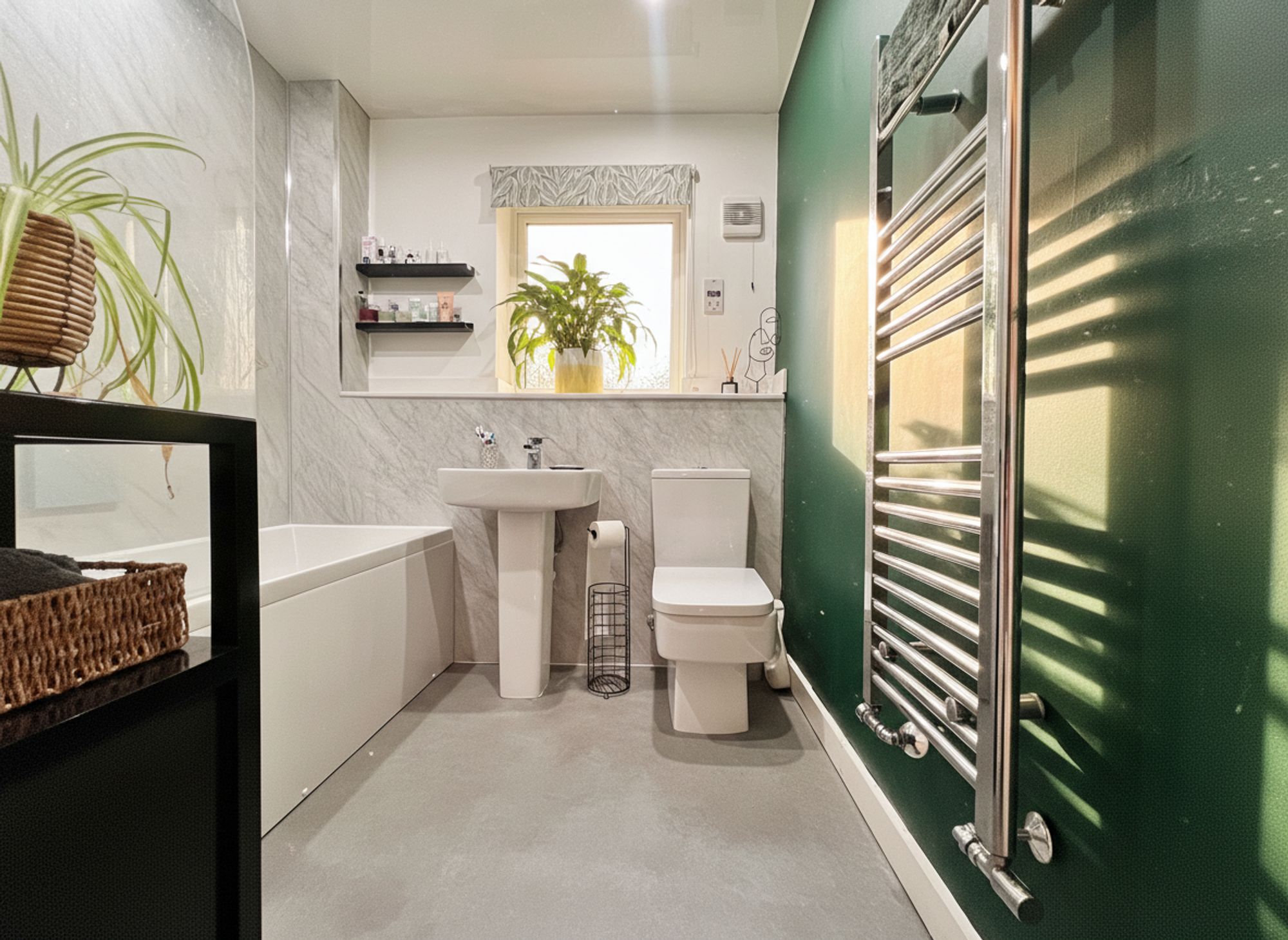 A crisp and contemporary house bathroom fitted with a panelled bath and shower over with glass screen, wash basin, low flush WC and a chrome heated towel rail, all finished to a modern standard.