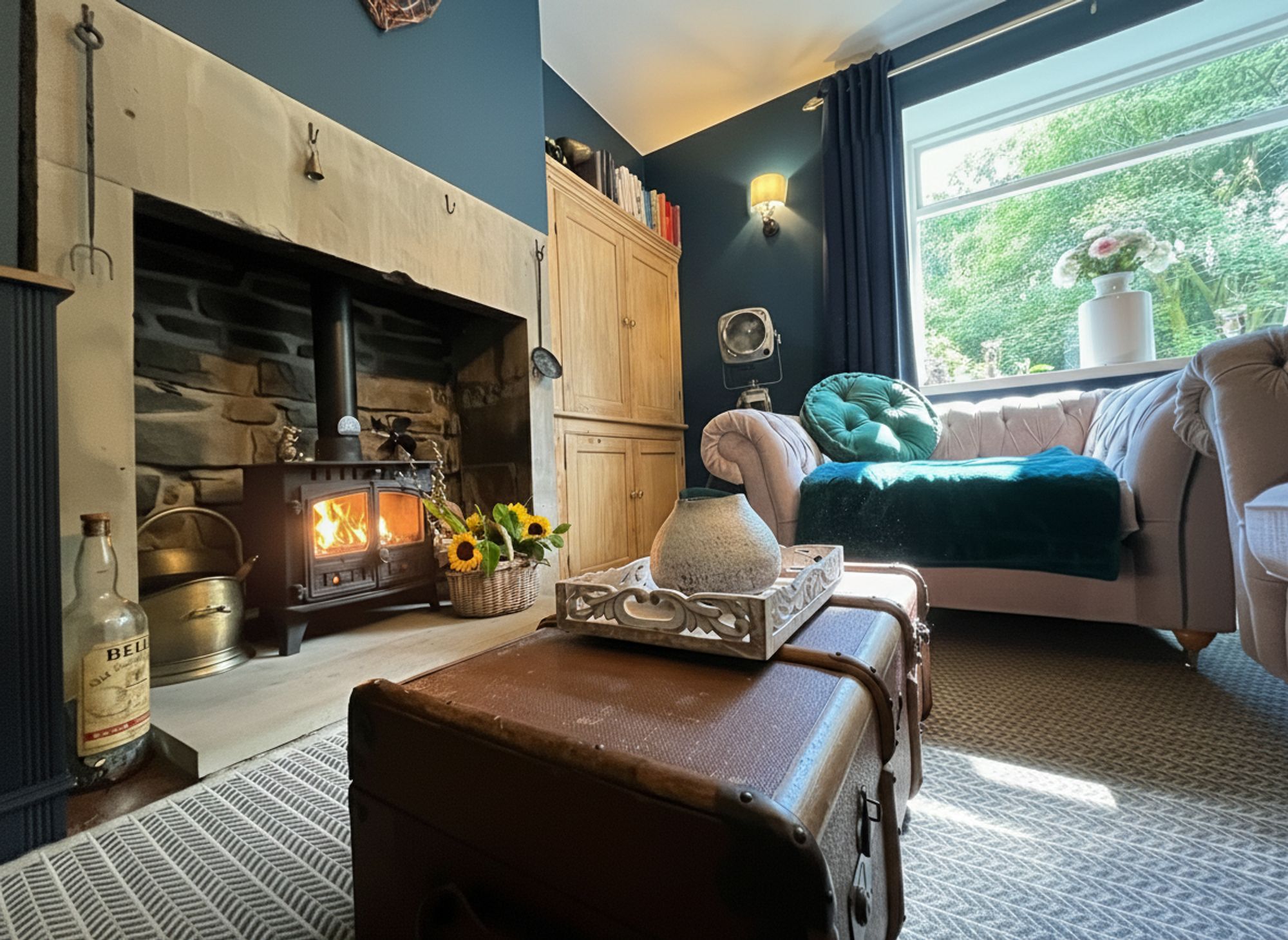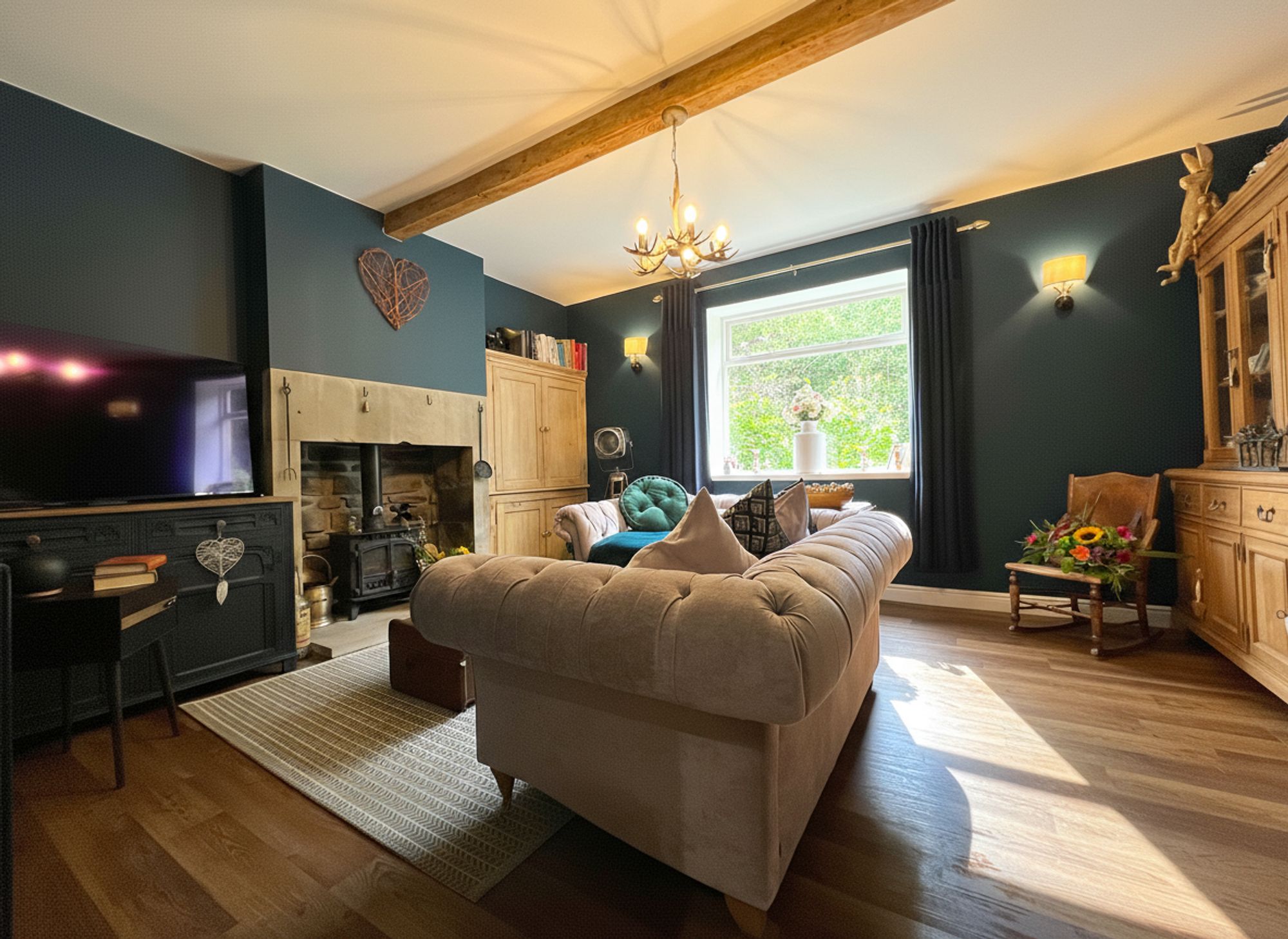 Flooded with natural light from a large rear-facing window, the lounge offers a serene outlook over beautiful woodland scenery, creating a calming and picturesque backdrop. Styled in contemporary tones, the space exudes modern elegance while retaining a cosy and welcoming atmosphere. The main focal point is the stunning multi-fuel inglenook stove, set within an impressive exposed stone surround, casting a warm ambience on chilly winter evenings. A continuation of the wood-effect laminate flooring flows seamlessly through the room, enhancing the sense of space and cohesion within this beautifully presented living area.