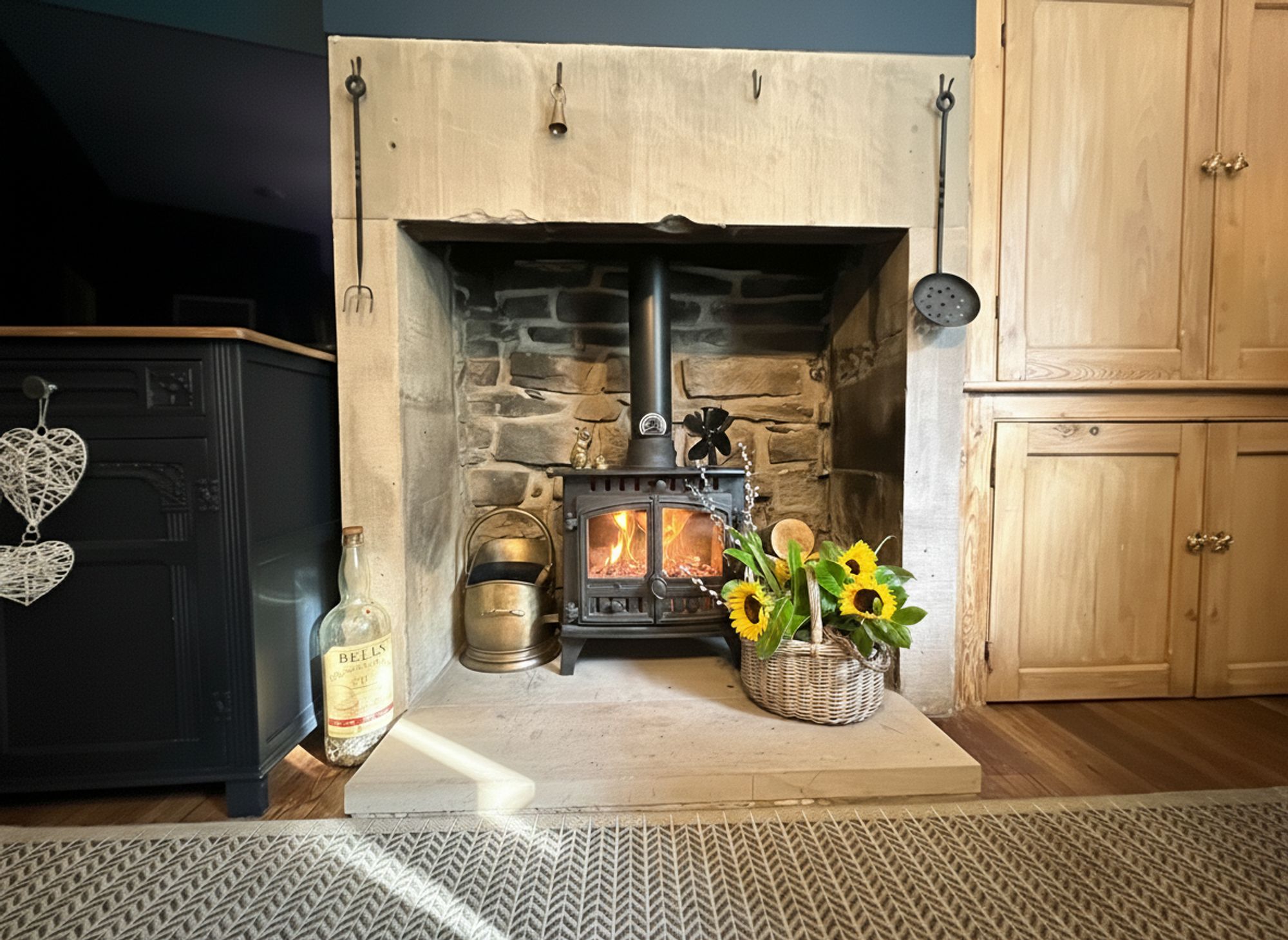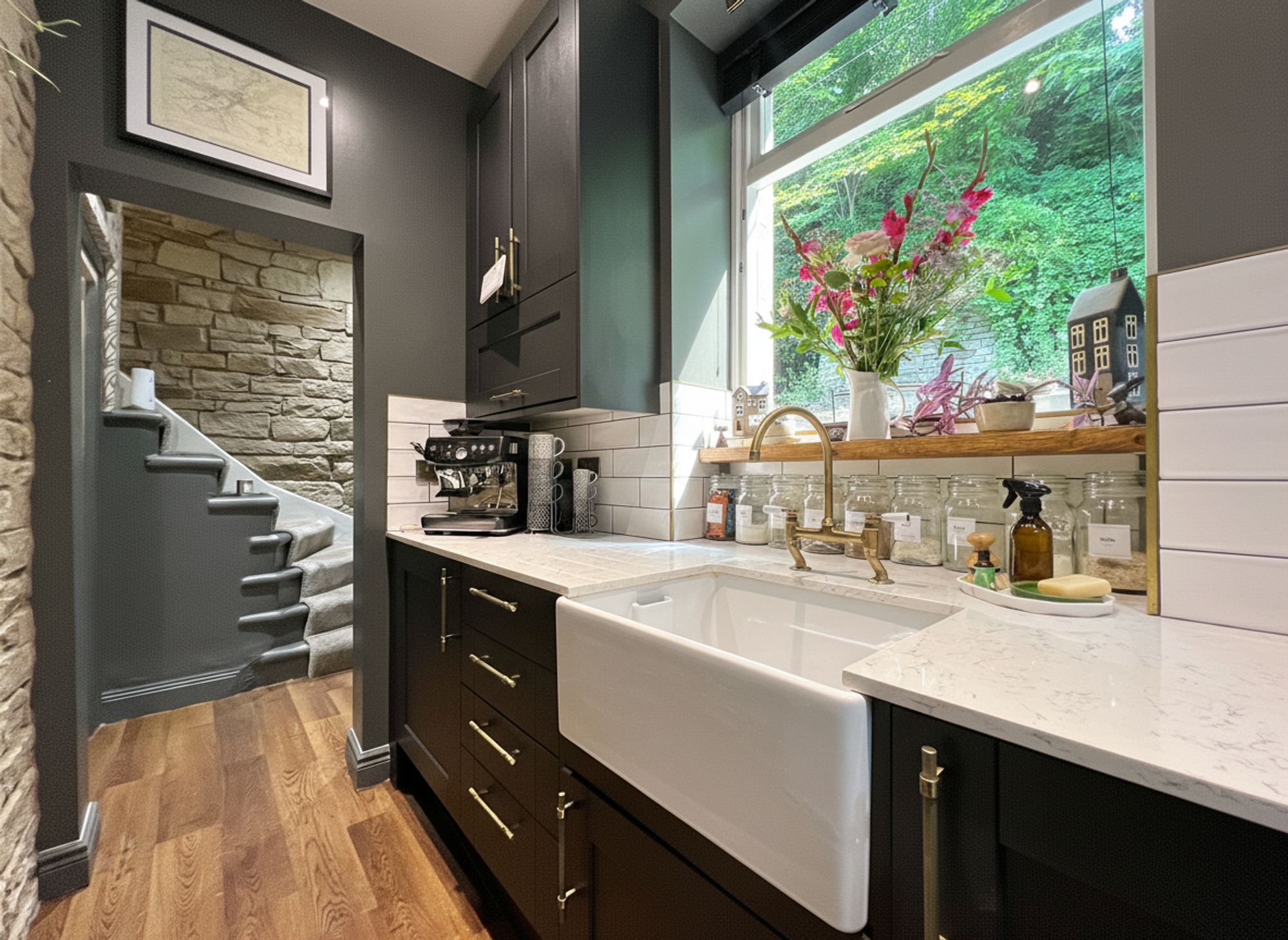 Recently renovated to a high standard, this exceptional Howdens kitchen showcases a contemporary design with a touch of timeless charm. A range of sleek charcoal units is beautifully complemented by luxurious quartz work surfaces, all accented with elegant brass handles that bring a warm, sophisticated finish. Integrated appliances include a built-in fridge, ample space for a freestanding cooker, and a classic Belfast sink. A striking block-tiled splashback and wood-effect laminate flooring add modern texture, while a stunning exposed stone wall provides a unique focal point, infusing the space with character and charm.