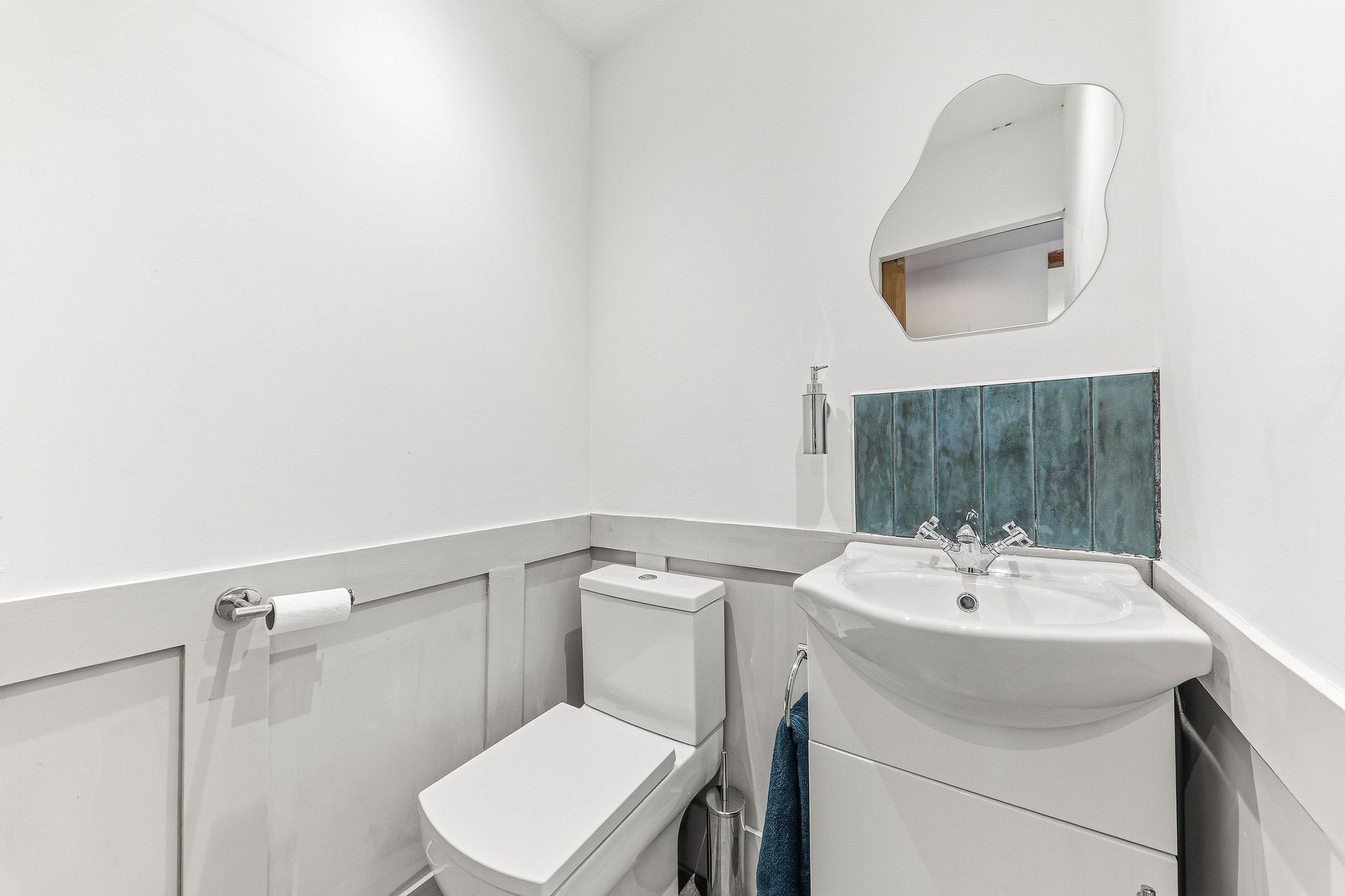 A stylishly appointed WC featuring decorative half panelling and a striking emerald tiled splashback adding a touch of colour. The suite comprises a W.C. and wash basin set within a sleek vanity unit, providing useful storage while maintaining a clean and contemporary finish.