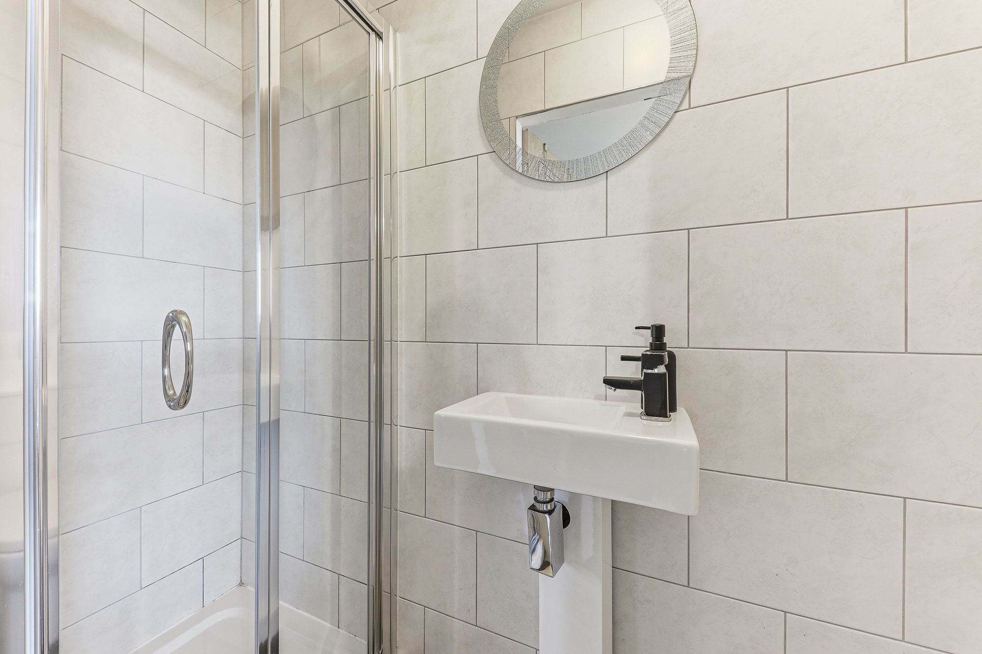 The en-suite is fitted with a wash basin, W.C. and a walk-in shower cubicle. The walls are fully tiled, creating a clean and practical finish.