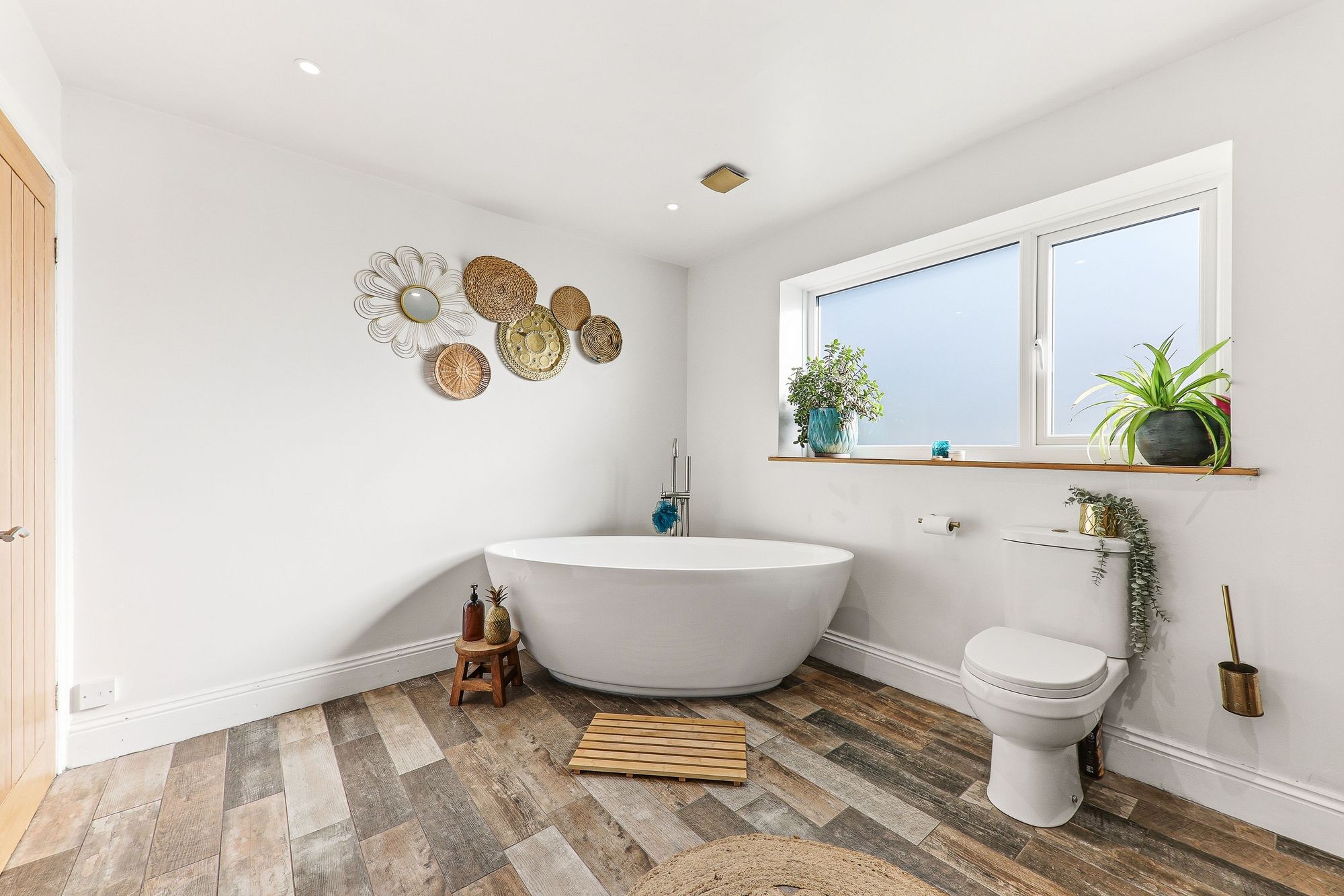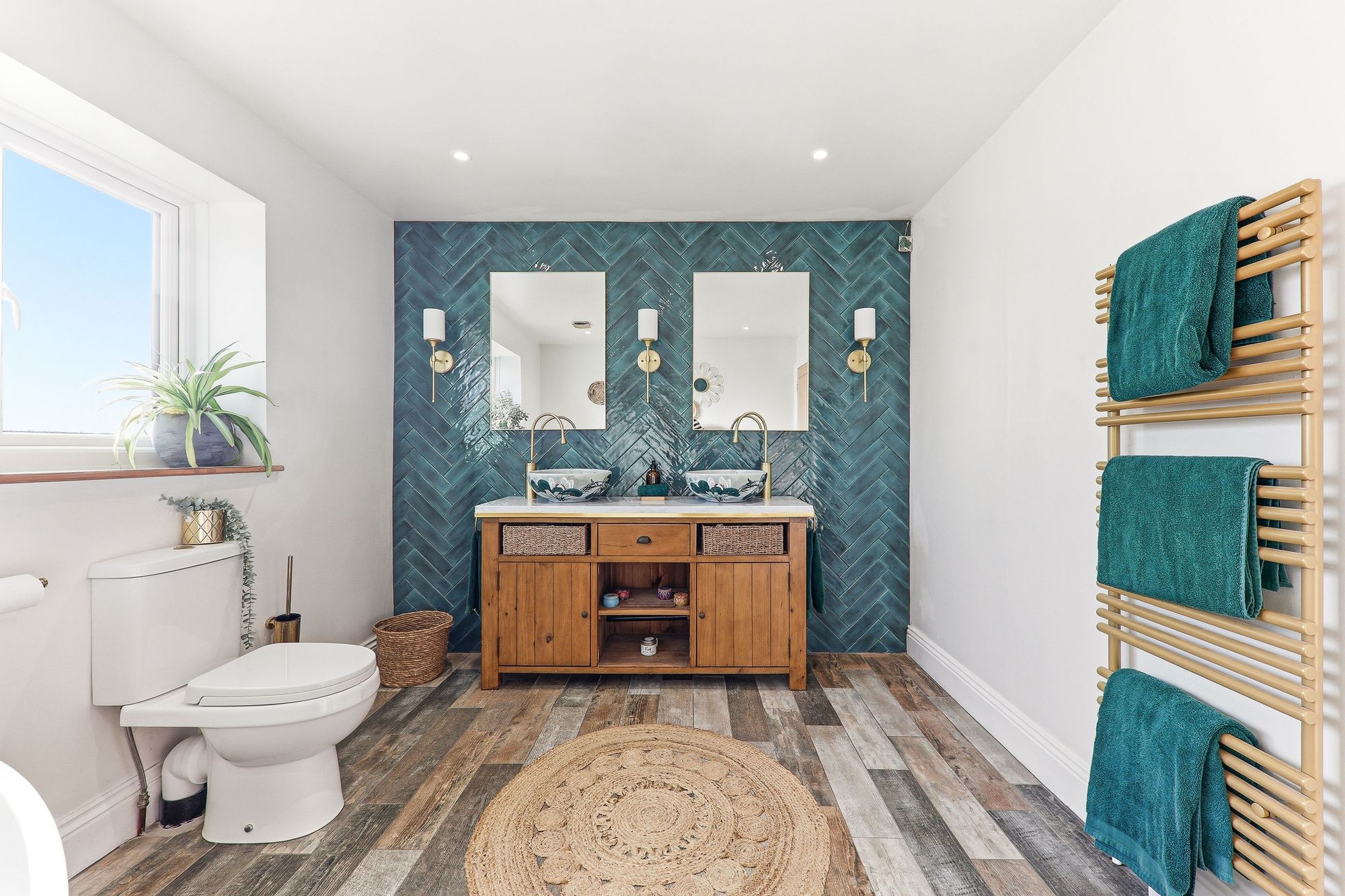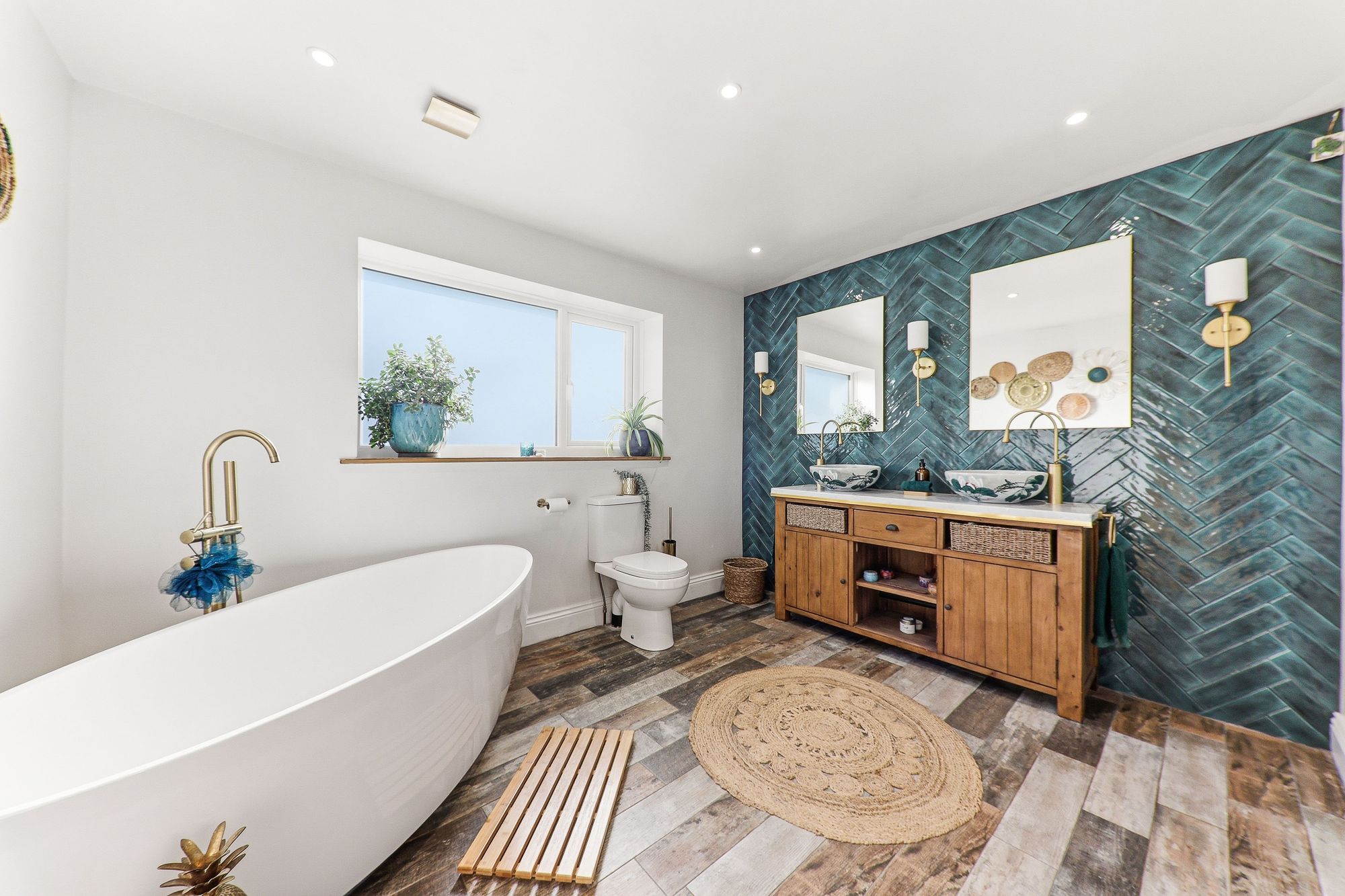 Exuding spa-like luxury, the bathroom is beautifully appointed with twin his-and-hers wash basins featuring sleek gold mixer taps, set within a stylish vanity unit providing excellent storage. A striking oval deep sunken bath with shower attachment creates a wonderful focal point, complemented by a heated towel rail for added comfort. The space is enhanced by a stunning emerald herringbone-effect tiled wall to the sink area adding texture and visual interest, while wood-effect flooring ties the whole aesthetic together creating a warm yet contemporary finish.