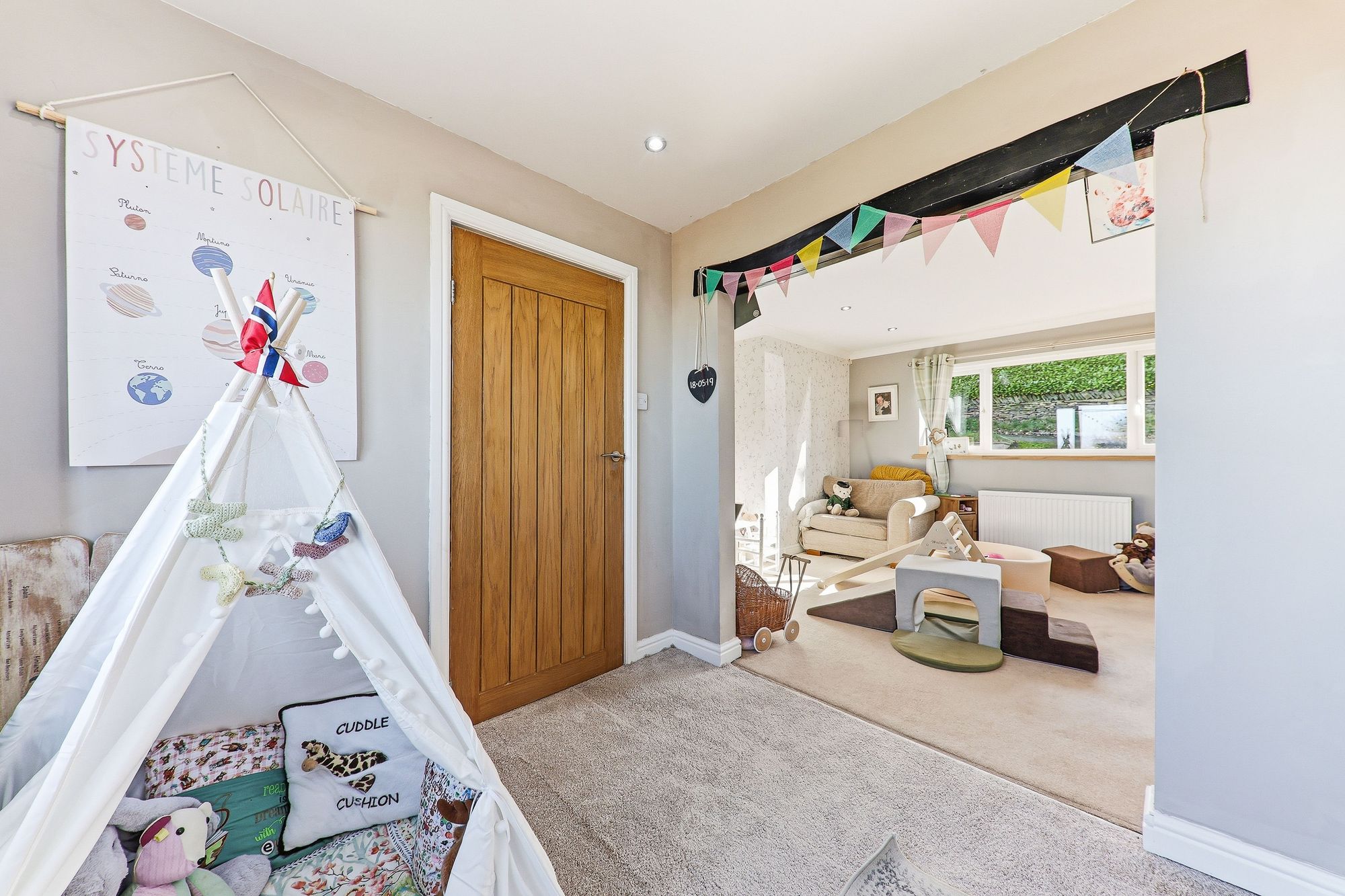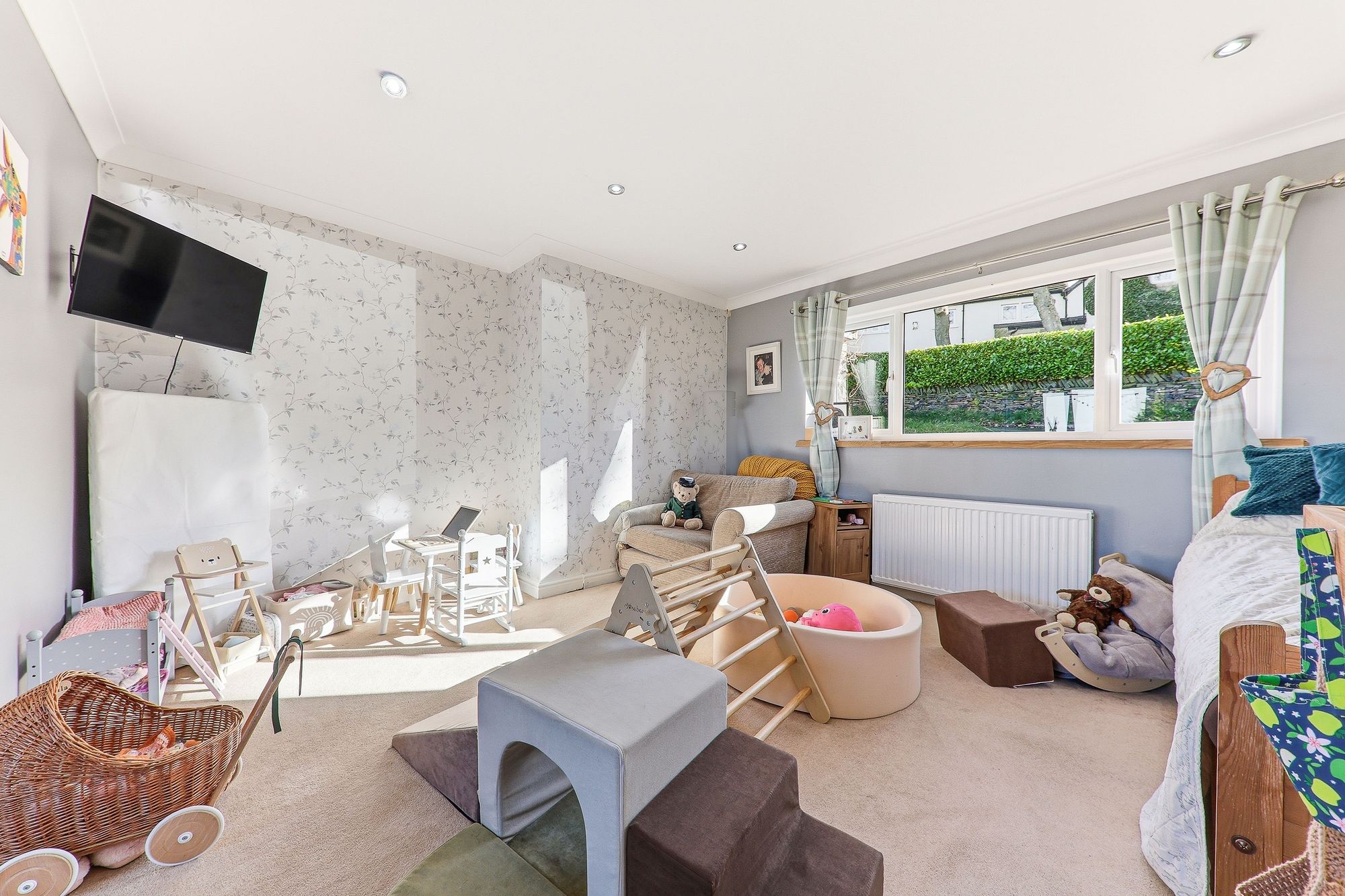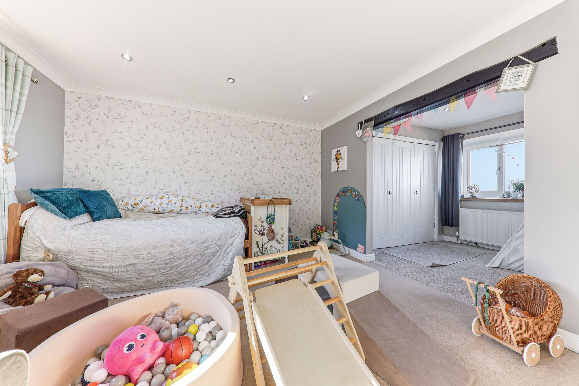 Previously arranged as two separate bedrooms, this versatile space could easily be reconfigured back to its original layout should the prospective purchaser wish creating two good sized bedrooms. Currently utilised as a combined bedroom and playroom, the room offers excellent flexibility for modern family living. Sliding doors reveal a large wardrobe area, providing valuable storage while maintaining a clean and organised space.