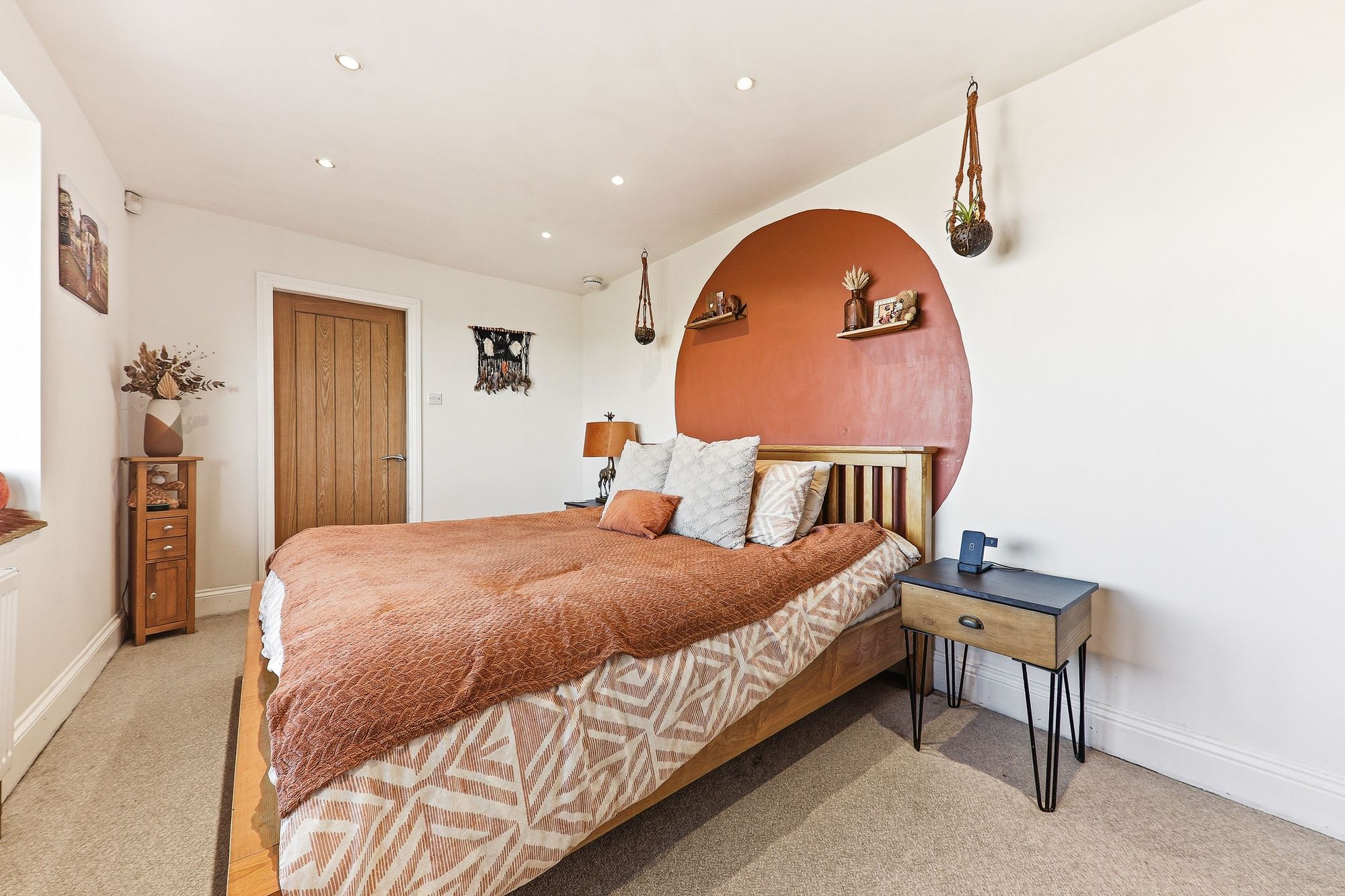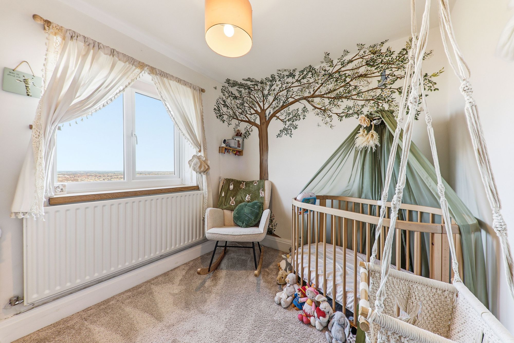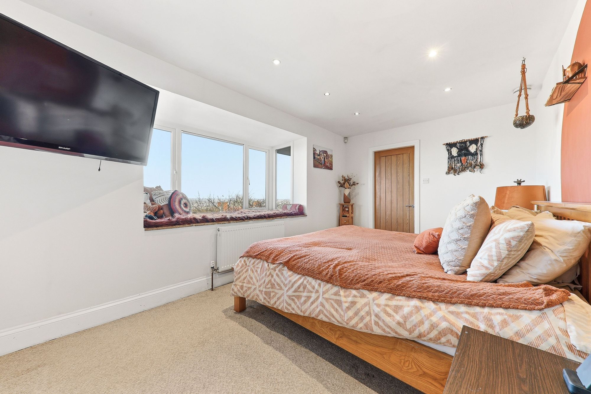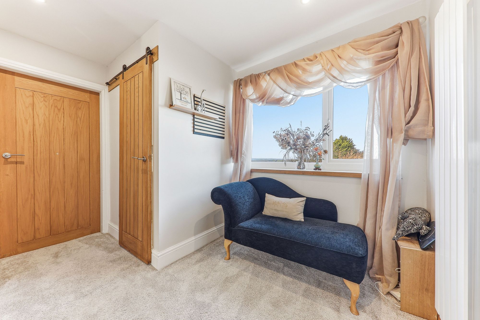 A generously sized master bedroom, presented in tasteful and stylish tones, and flooded with natural light courtesy of the beautiful exposed stone bay window. This charming feature not only enhances the character of the room but also creates a delightful seating area, the perfect spot to sit and relax with a book while gazing out at the stunning views beyond.