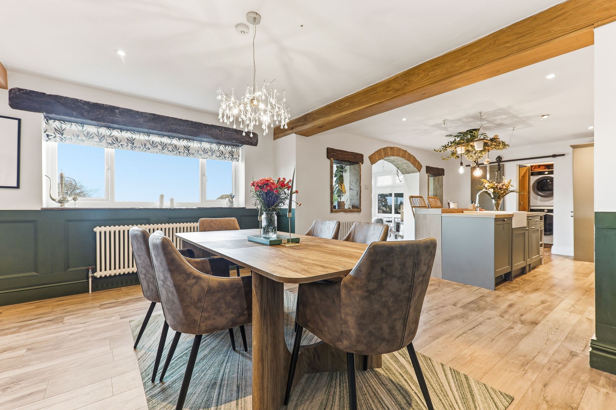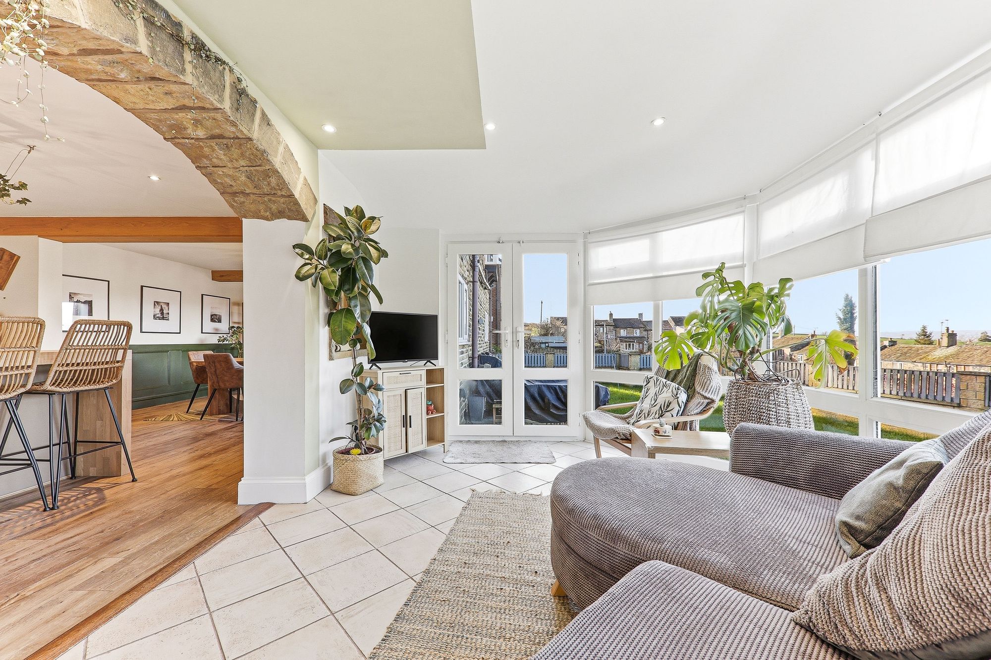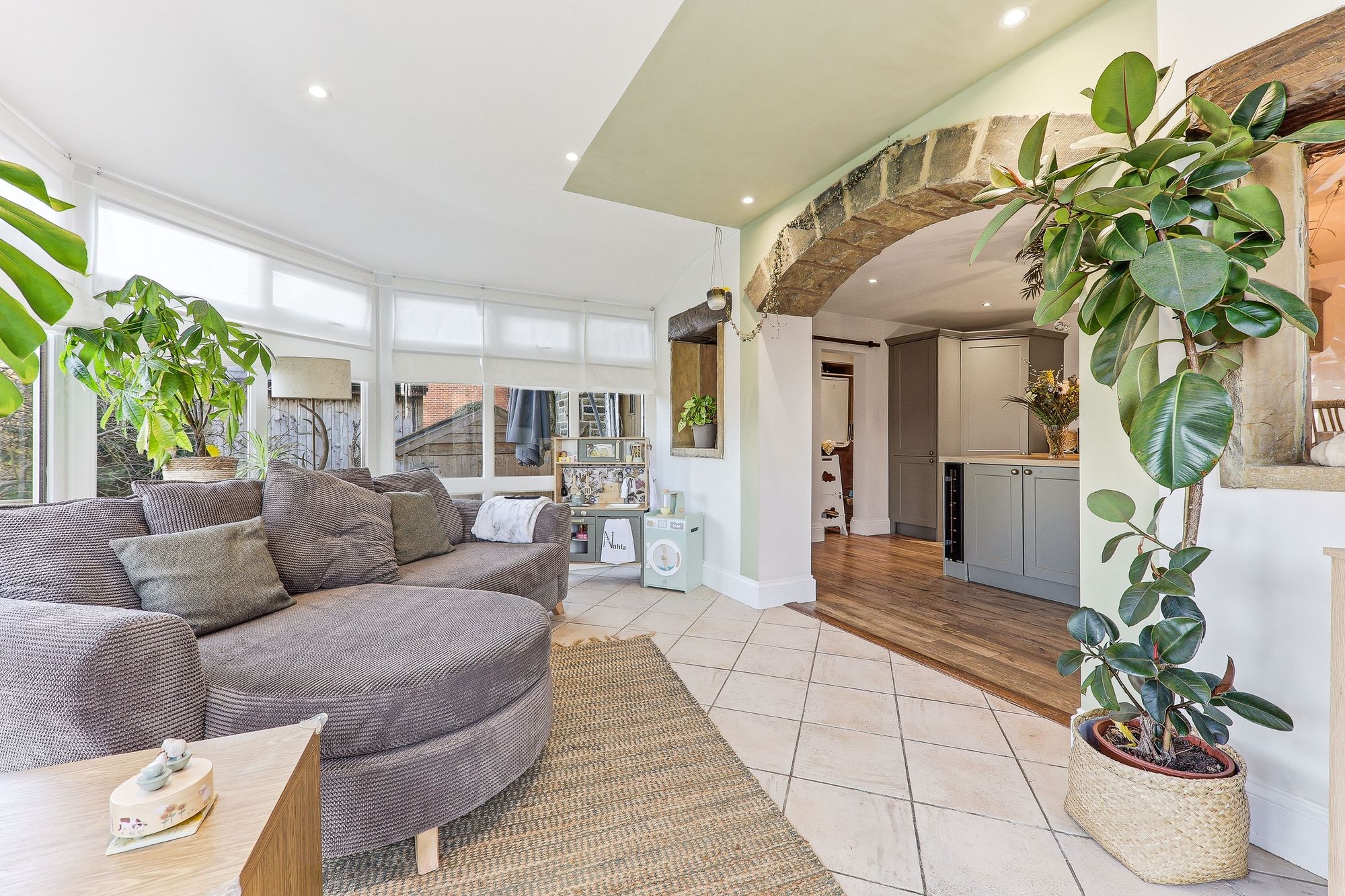 An exposed stone archway leads through to the fabulous conservatory, beautifully framing views of the rear garden. Designed for year-round enjoyment, the space benefits from a solid roof which enhances comfort in all seasons. Double doors open directly onto the patio and enclosed rear garden, allowing entertaining to effortlessly spill outdoors and creating a seamless connection between the indoor and outdoor living spaces.