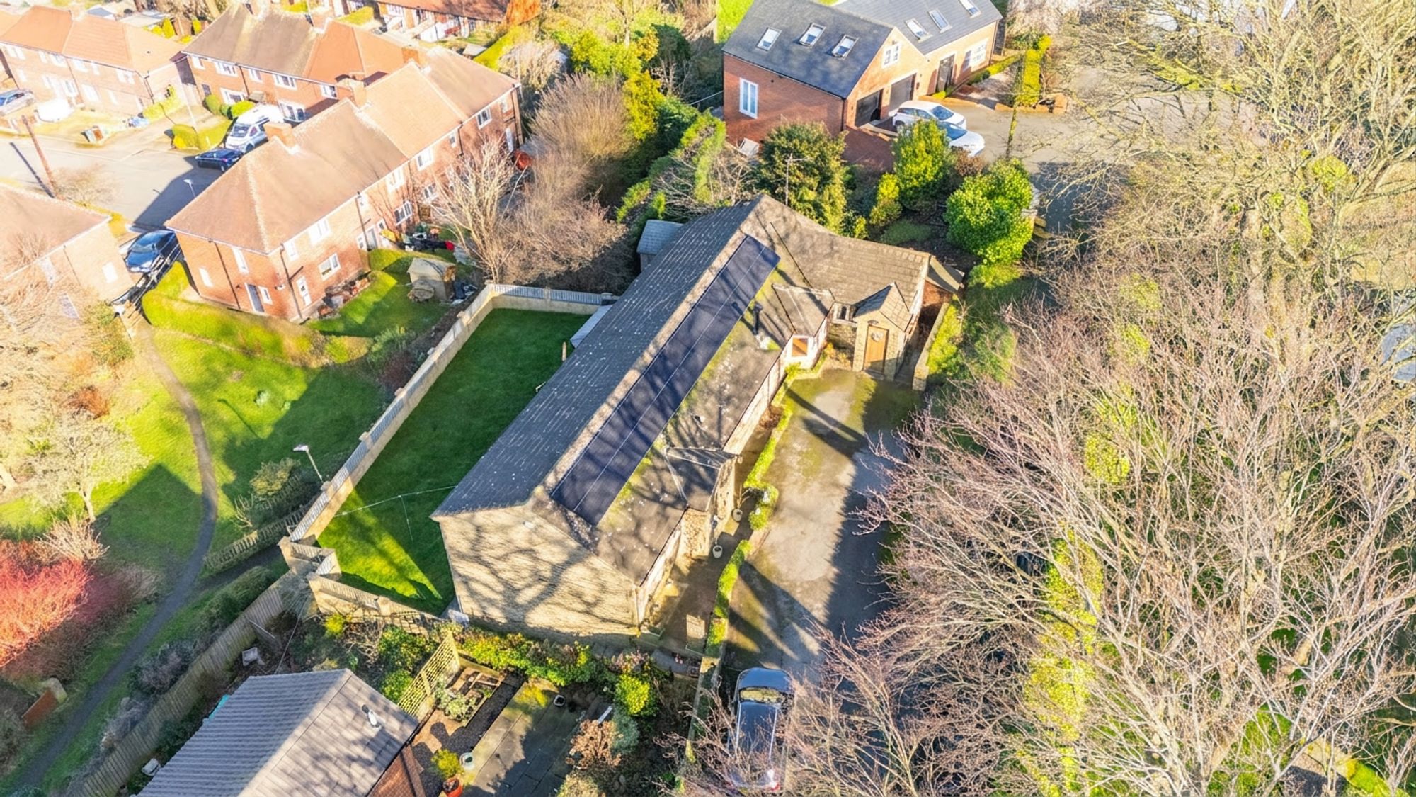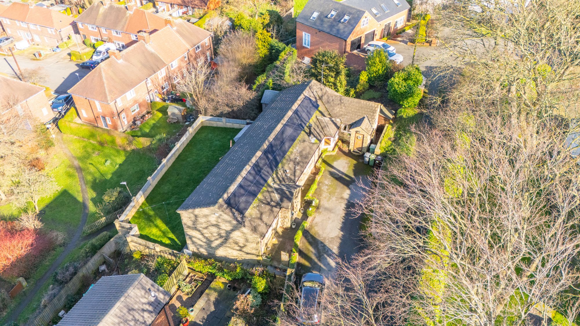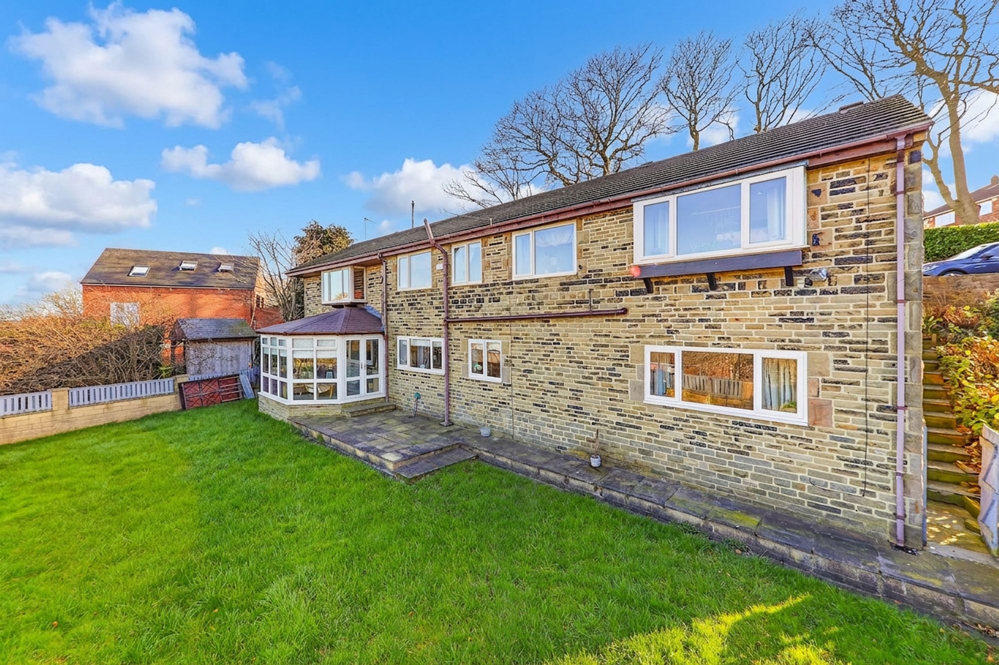 An exposed stone archway leads through to the fabulous conservatory, beautifully framing views of the rear garden. Designed for year-round enjoyment, the space benefits from a solid roof which enhances comfort in all seasons. Double doors open directly onto the patio and enclosed rear garden, allowing entertaining to effortlessly spill outdoors and creating a seamless connection between the indoor and outdoor living spaces.