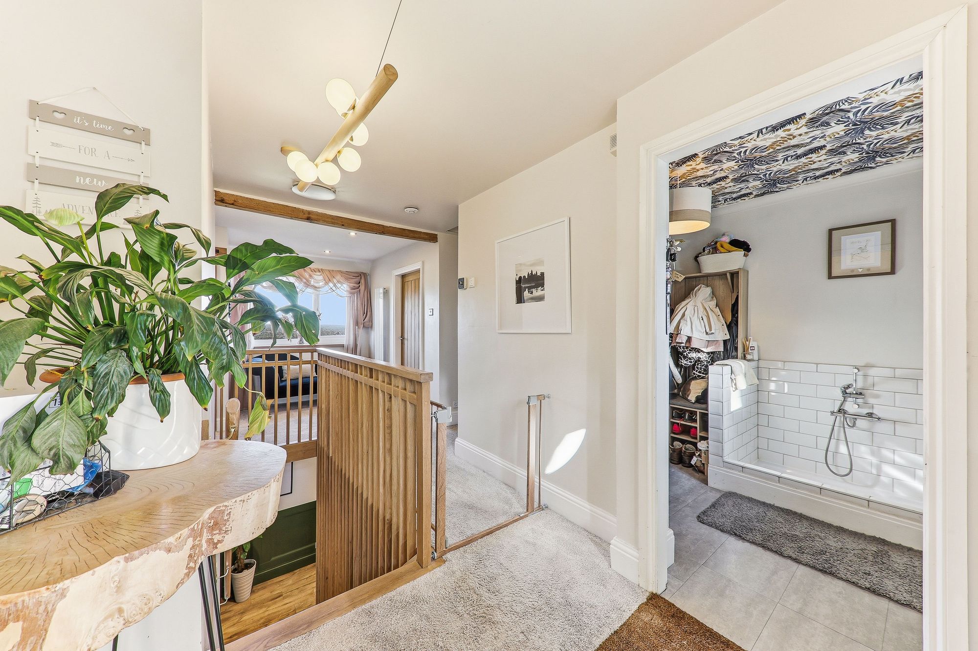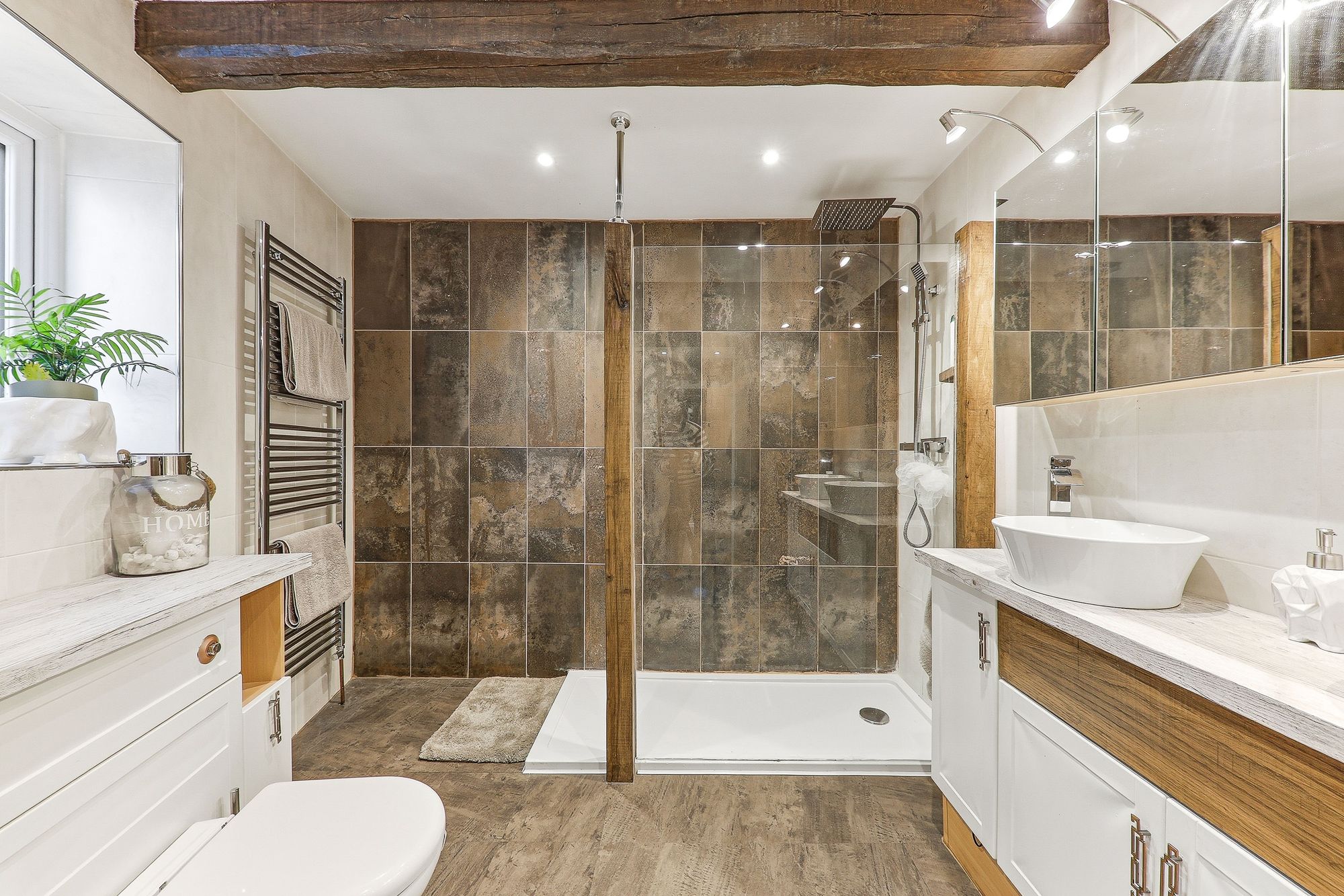 The en-suite has been exquisitely appointed, blending contemporary luxury with charming character features. Striking exposed beams and warm textured tiling create a rich inviting atmosphere, while sleek modern fittings provide a refined contrast. A spacious walk-in rainfall shower is elegantly framed by glass screening, complemented by stylish twin countertop basins set within bespoke vanity cabinetry offering both practicality and a boutique hotel feel. Thoughtfully designed lighting enhances the space while high-quality finishes throughout add a sense of understated indulgence.