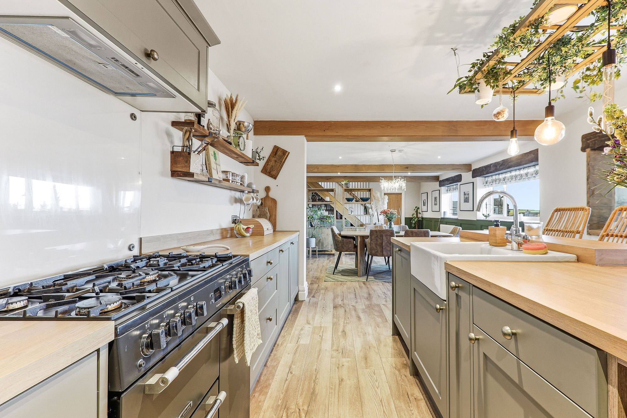 At the heart of the space lies the beautifully appointed kitchen, fitted with an array of classic shaker-style units and centred around a magnificent island incorporating a Belfast sink and wine cooler. This impressive feature provides additional preparation space while acting as a natural gathering point for family and friends. Integrated appliances include a dishwasher and fridge, alongside space for a freestanding range cooker completing this truly show-stopping kitchen designed for both everyday living and memorable entertaining.
