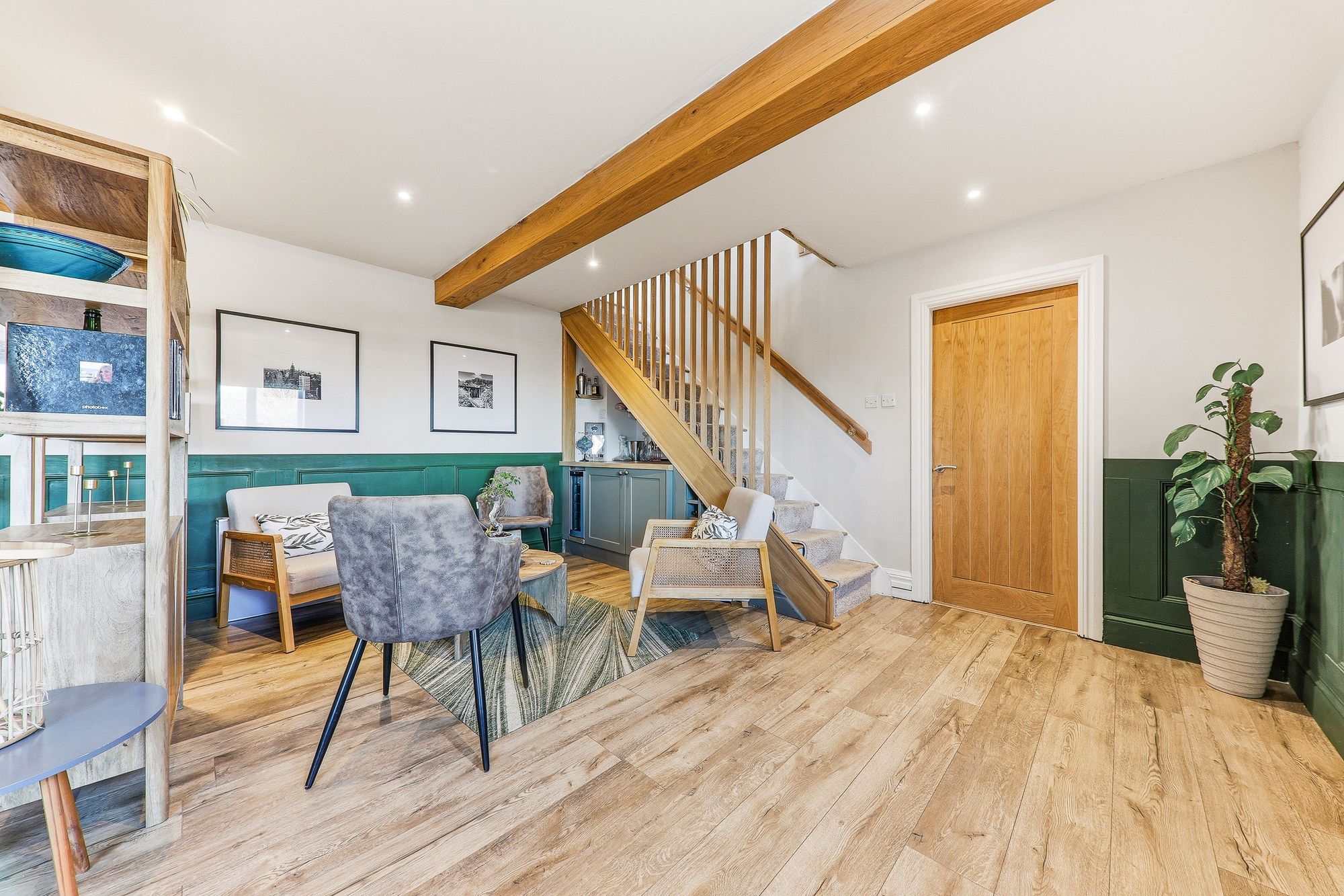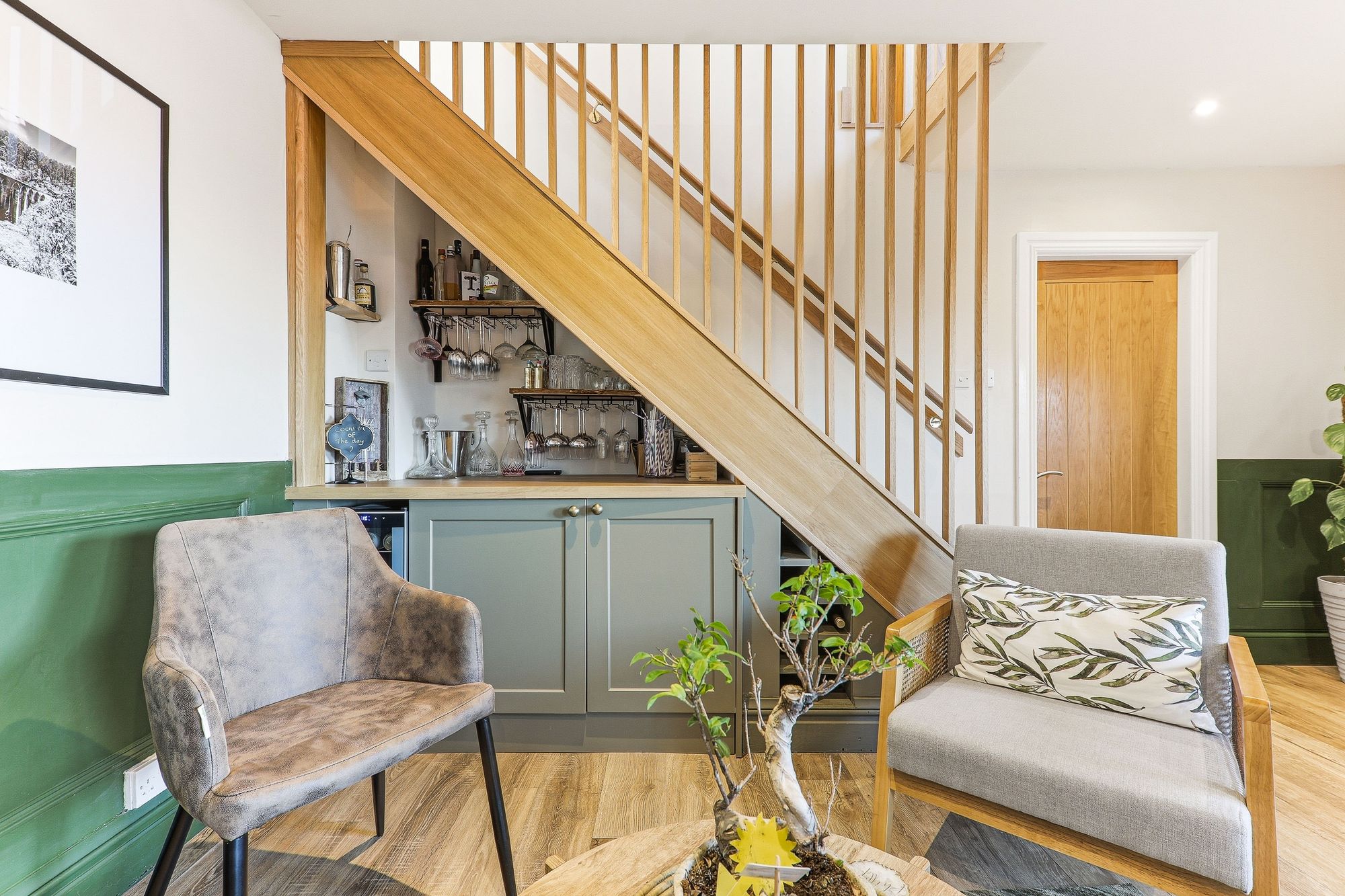 A striking oak staircase gracefully descends from the first floor, creating an impressive architectural feature and setting the tone for the remarkable space that unfolds below. The lower ground floor has been transformed into a truly exceptional space which is beautifully styled and finished to an outstanding standard. This spectacular open-plan family living dining kitchen perfectly embodies contemporary interior design, creating an indulgent yet welcoming hub of the home. A wonderfully cosy seating area is thoughtfully positioned beside a stylish cocktail bar, complete with a wine cooler an irresistible space for entertaining guests or unwinding at the end of the day. There is generous room for a family-sized dining suite, while multiple windows frame picturesque views over the rear garden, allowing natural light to cascade throughout. Elegant half panelling adorns the walls and beautifully complements the stylish flooring, adding depth and character to this stunning setting.