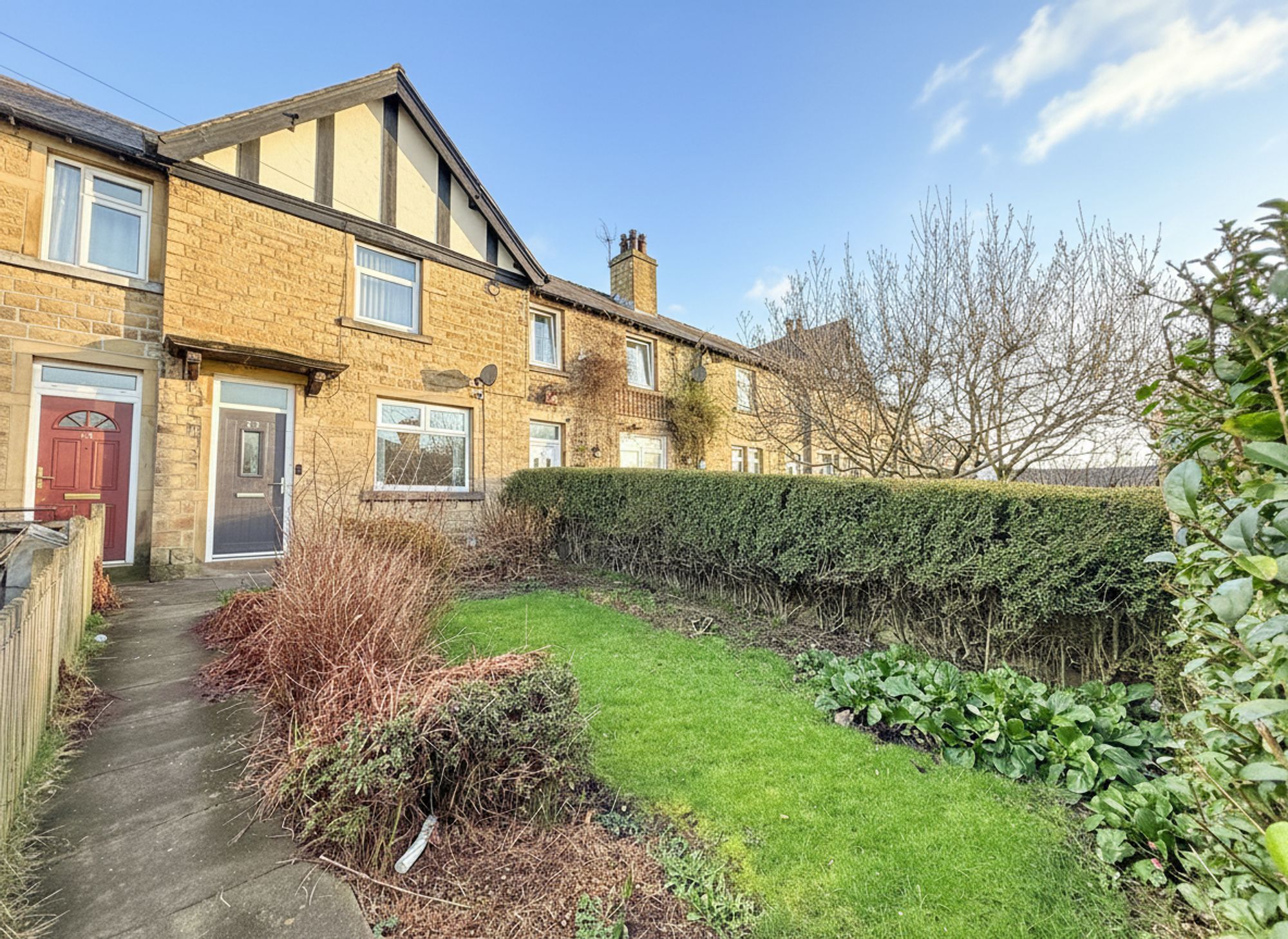To the front of the property is a well-maintained lawn with mature hedge borders and flower beds. A stone-flagged pathway leads to the front door and also provides shared access for the neighbouring property.