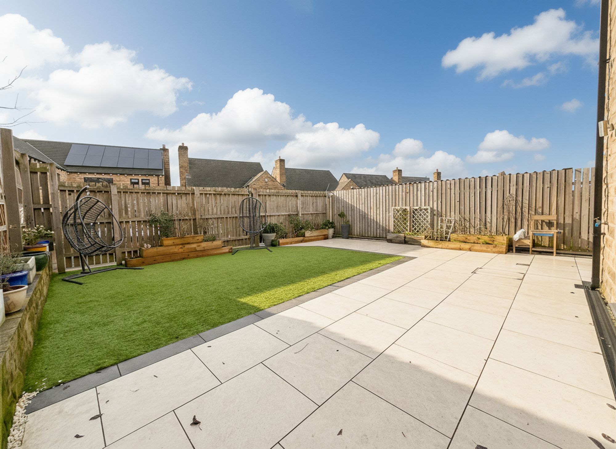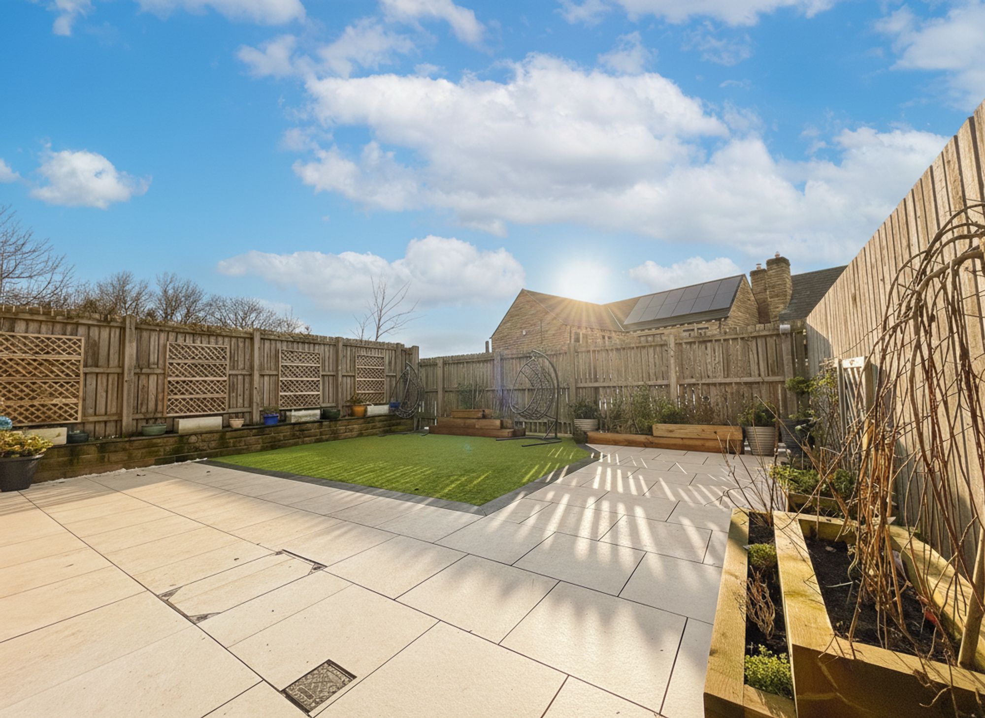Accessed via the kitchen bi-folding doors or a convenient side gate, the garden opens onto a stone-flagged patio area, perfect for alfresco dining and socialising. This flows seamlessly into an attractive, low-maintenance astroturf lawn, complemented by raised wooden planter beds that add colour and interest. Fully enclosed by wooden fencing, the garden offers a safe and private outdoor space, ideal for children and pets alike.