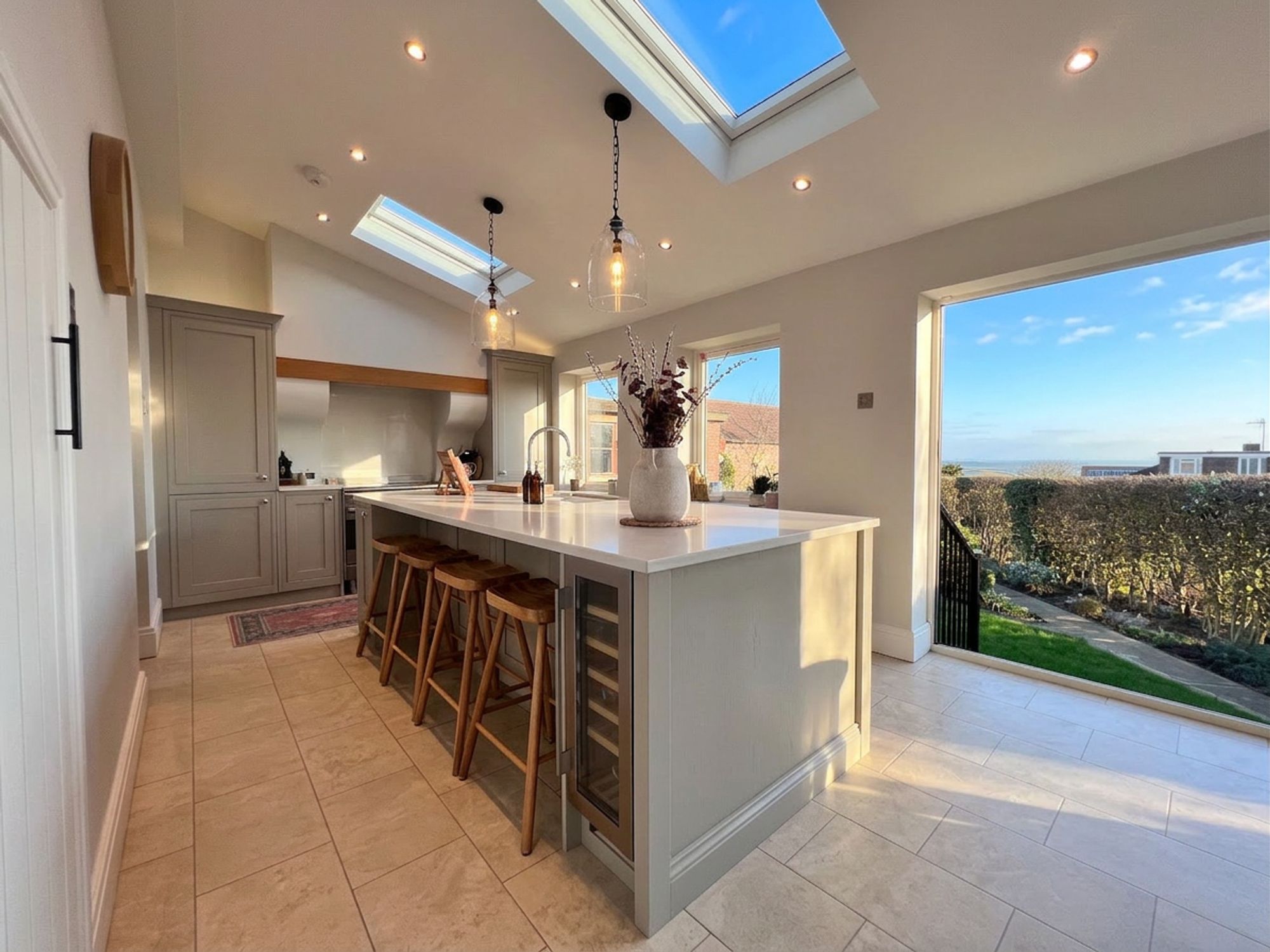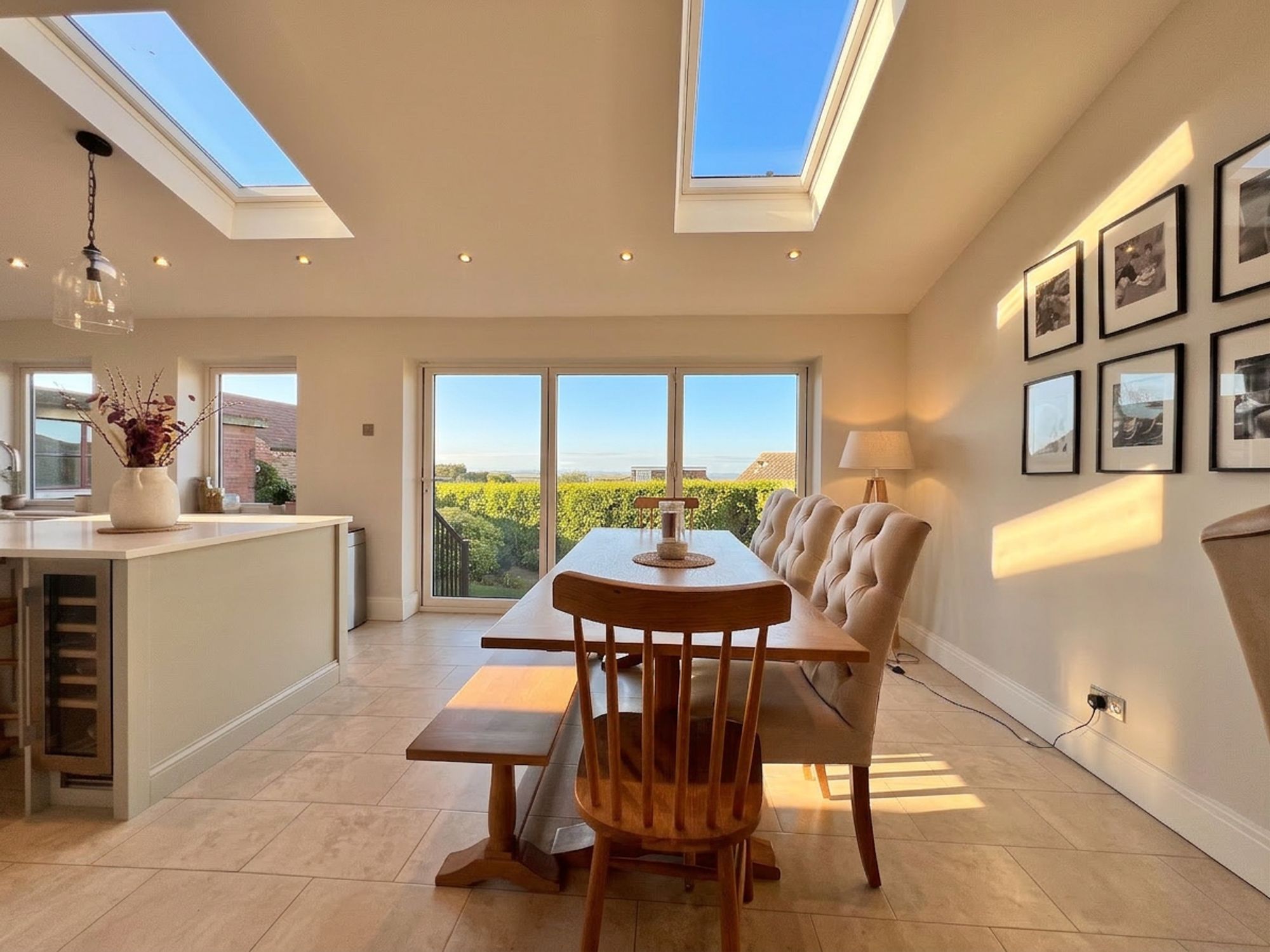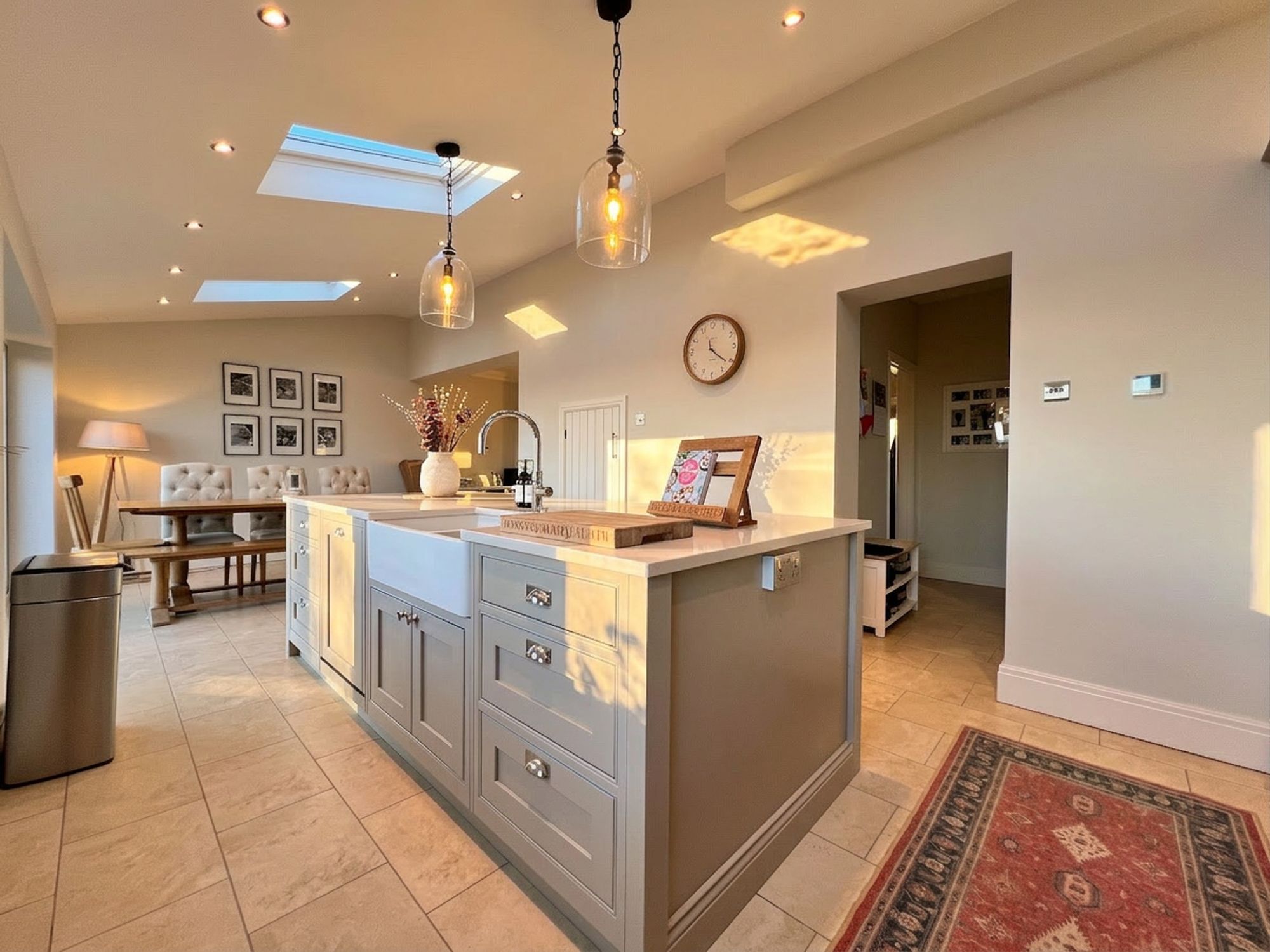 Undoubtedly the heart of the home, the current vendors have undertaken a remarkable extension to create this vast open-plan family dining kitchen space perfectly designed to cater to modern family life. Natural light pours in through triple Velux windows and expansive bi-fold doors, which open directly onto the garden, allowing entertaining to flow effortlessly outdoors and creating a seamless indoor–outdoor lifestyle. The entire space benefits from luxurious underfloor heating and is beautifully appointed with an array of classic shaker-style units, complemented by stunning quartz work surfaces. Integrated appliances include a dishwasher, space for a range cooker, fridge freezer and wine cooler. A striking central island takes pride of place, offering additional preparation space and housing a charming Belfast sink with Quooker tap. With ample room for a family-sized dining suite this exceptional space effortlessly balances practical daily living with refined entertaining.
