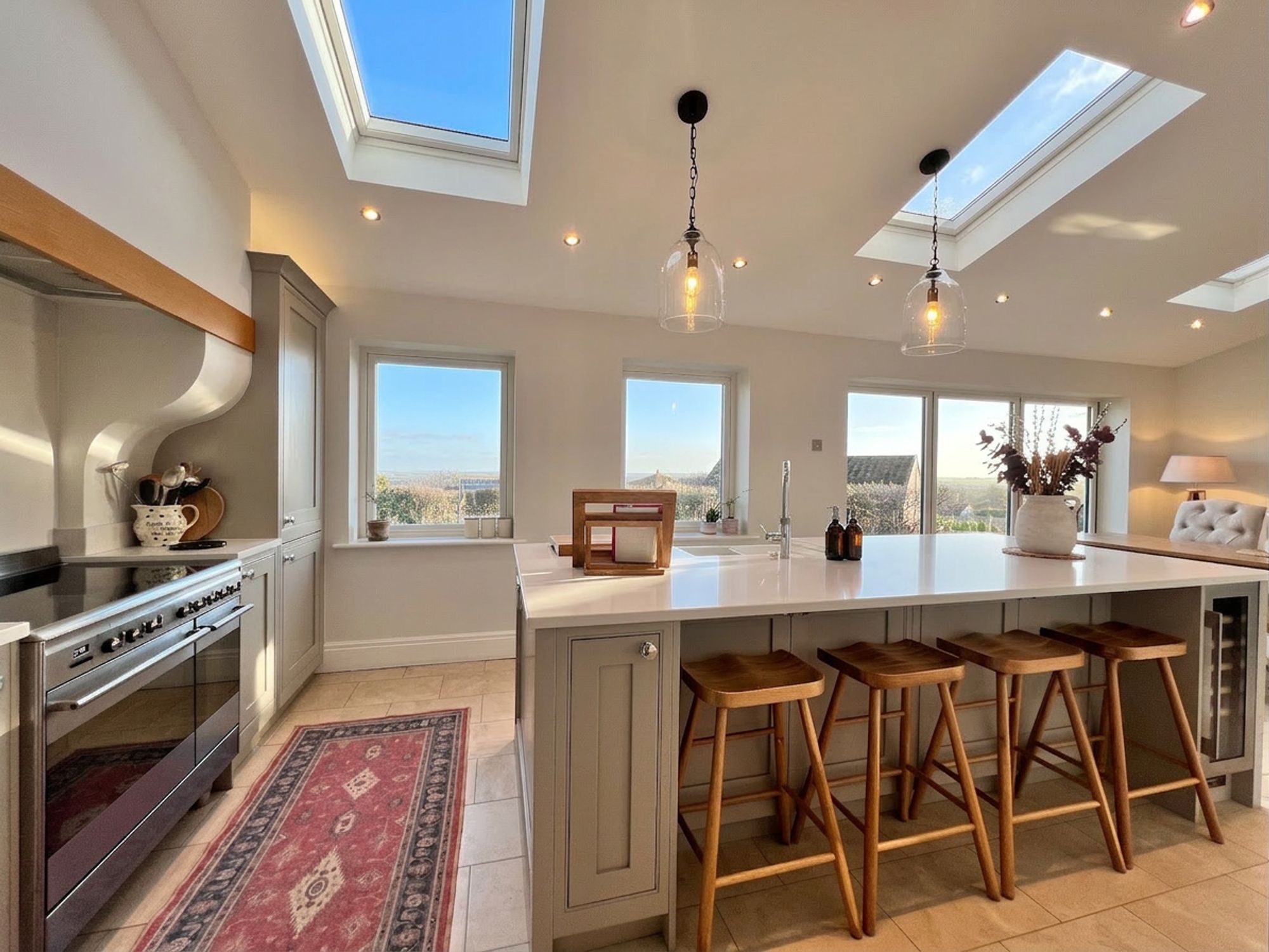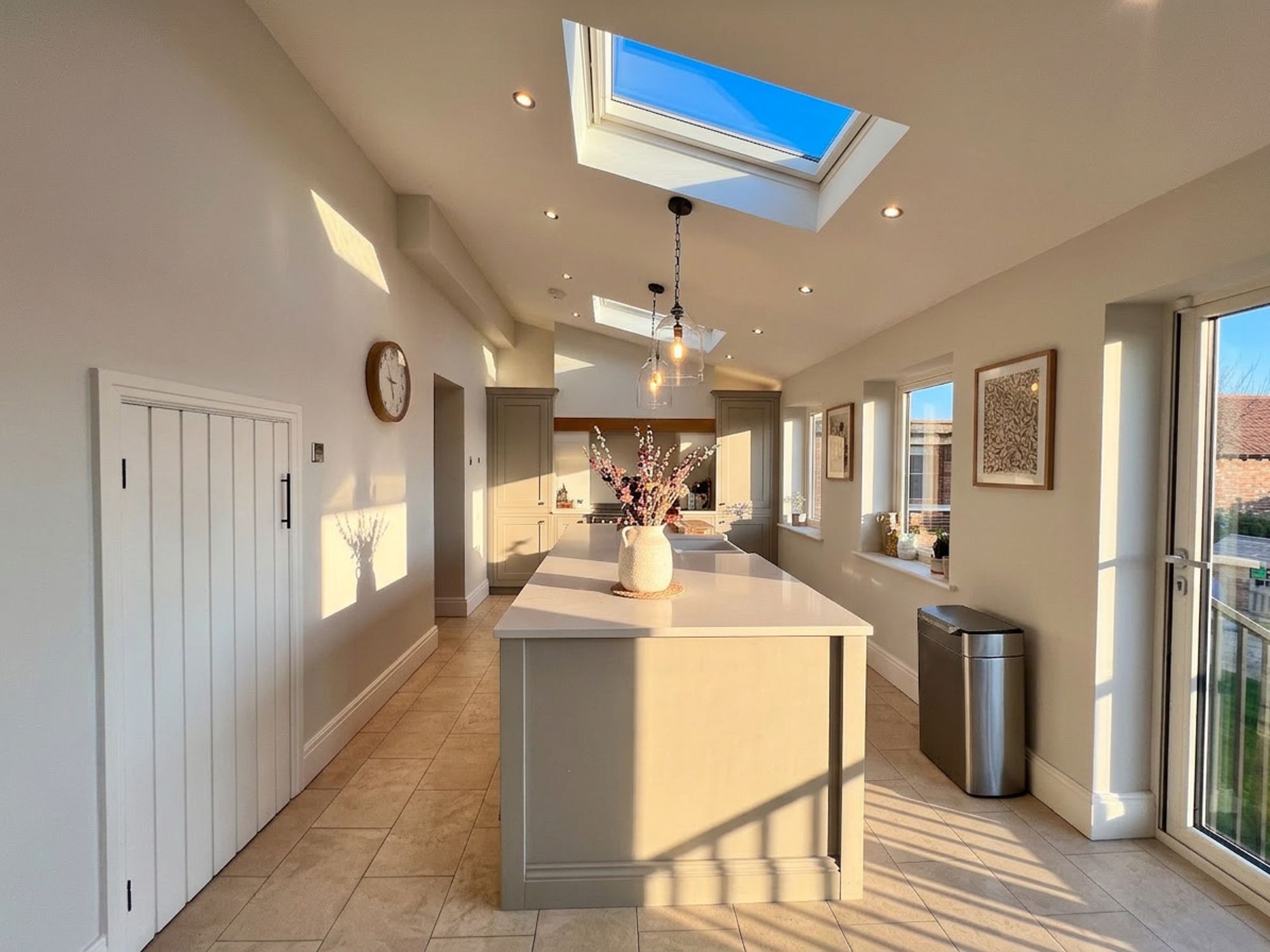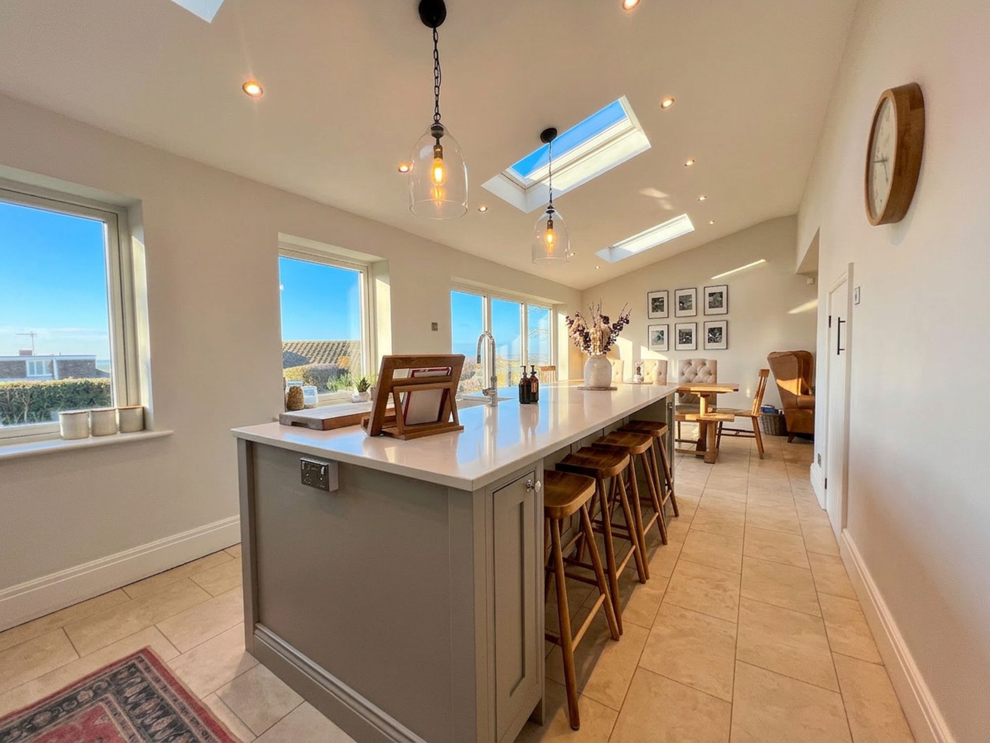 Undoubtedly the heart of the home, the current vendors have undertaken a remarkable extension to create this vast open-plan family dining kitchen space perfectly designed to cater to modern family life. Natural light pours in through triple Velux windows and expansive bi-fold doors, which open directly onto the garden, allowing entertaining to flow effortlessly outdoors and creating a seamless indoor–outdoor lifestyle. The entire space benefits from luxurious underfloor heating and is beautifully appointed with an array of classic shaker-style units, complemented by stunning quartz work surfaces. Integrated appliances include a dishwasher, space for a range cooker, fridge freezer and wine cooler. A striking central island takes pride of place, offering additional preparation space and housing a charming Belfast sink with Quooker tap. With ample room for a family-sized dining suite this exceptional space effortlessly balances practical daily living with refined entertaining.
