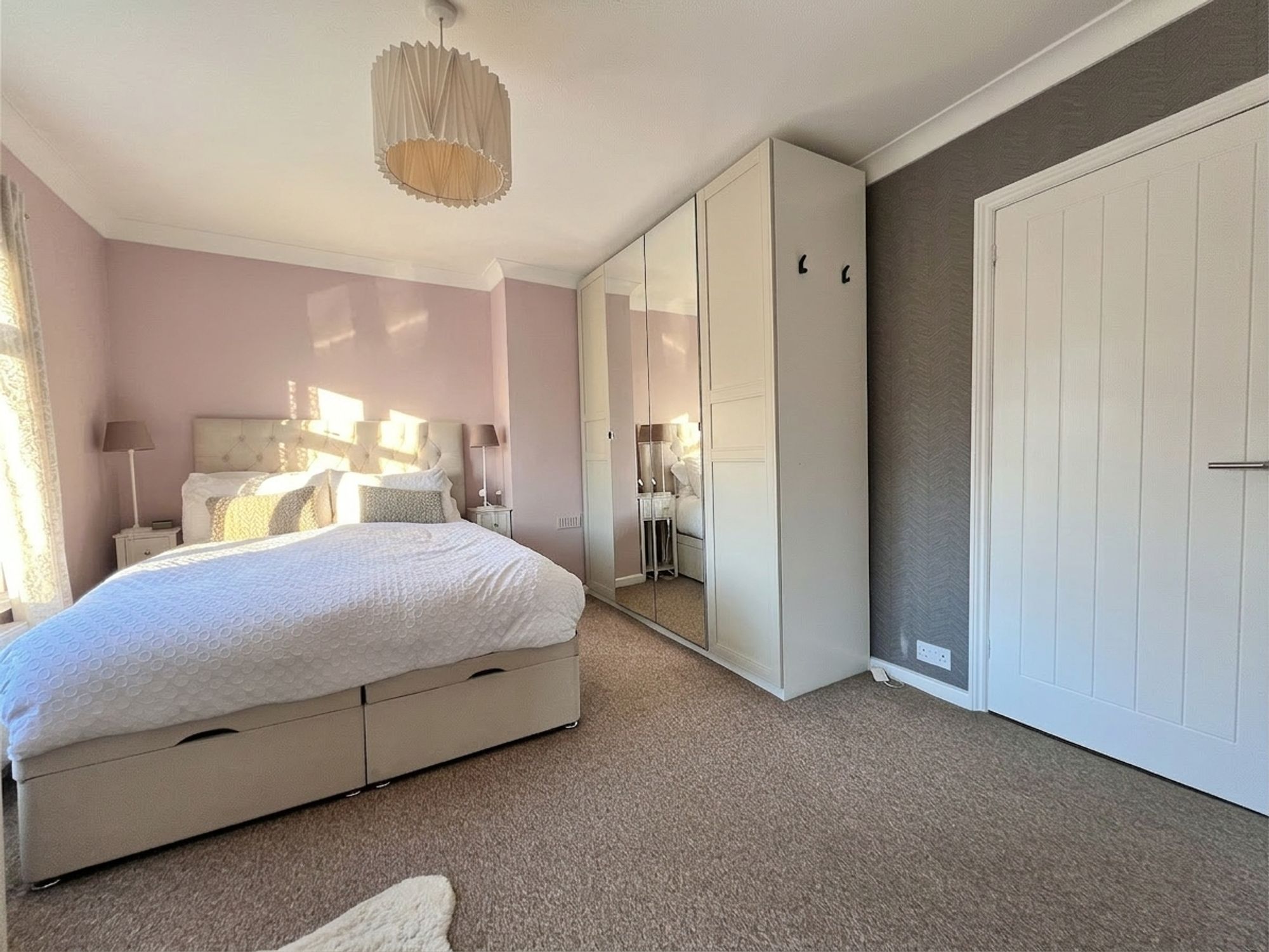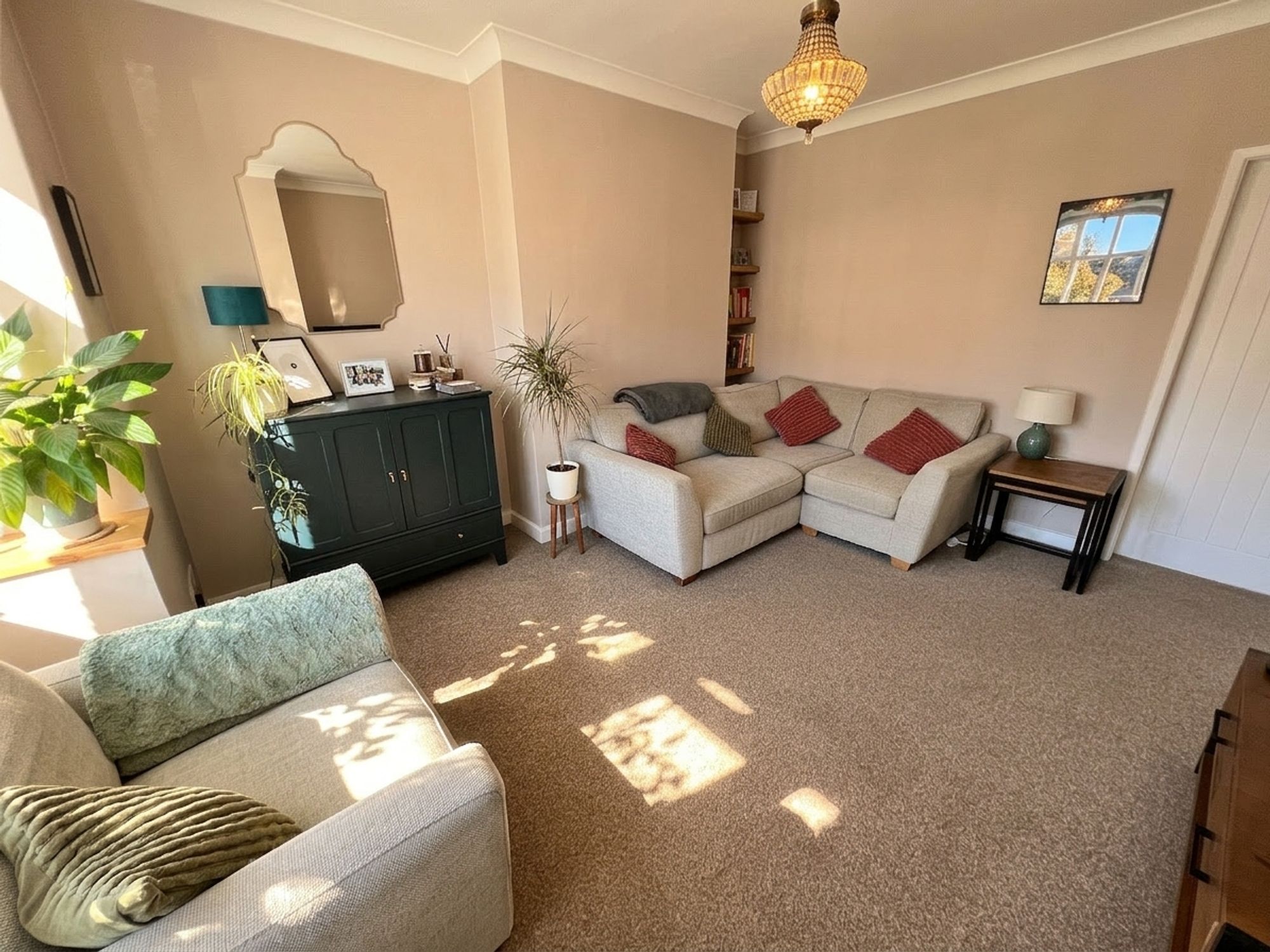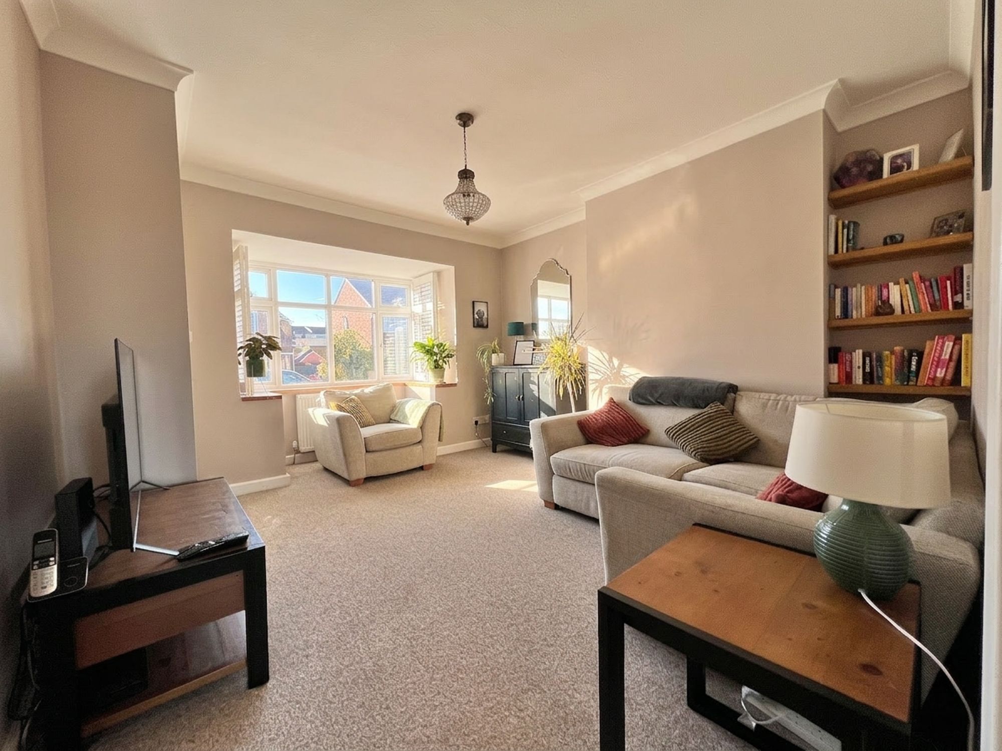 A beautifully styled lounge, flooded with natural light courtesy of the large front-facing bay window, creating a bright and welcoming atmosphere. Presented in soft pastel tones, the room is generous in proportion and offers excellent flexibility for a variety of furniture arrangements, making it an ideal space for both relaxing and entertaining.