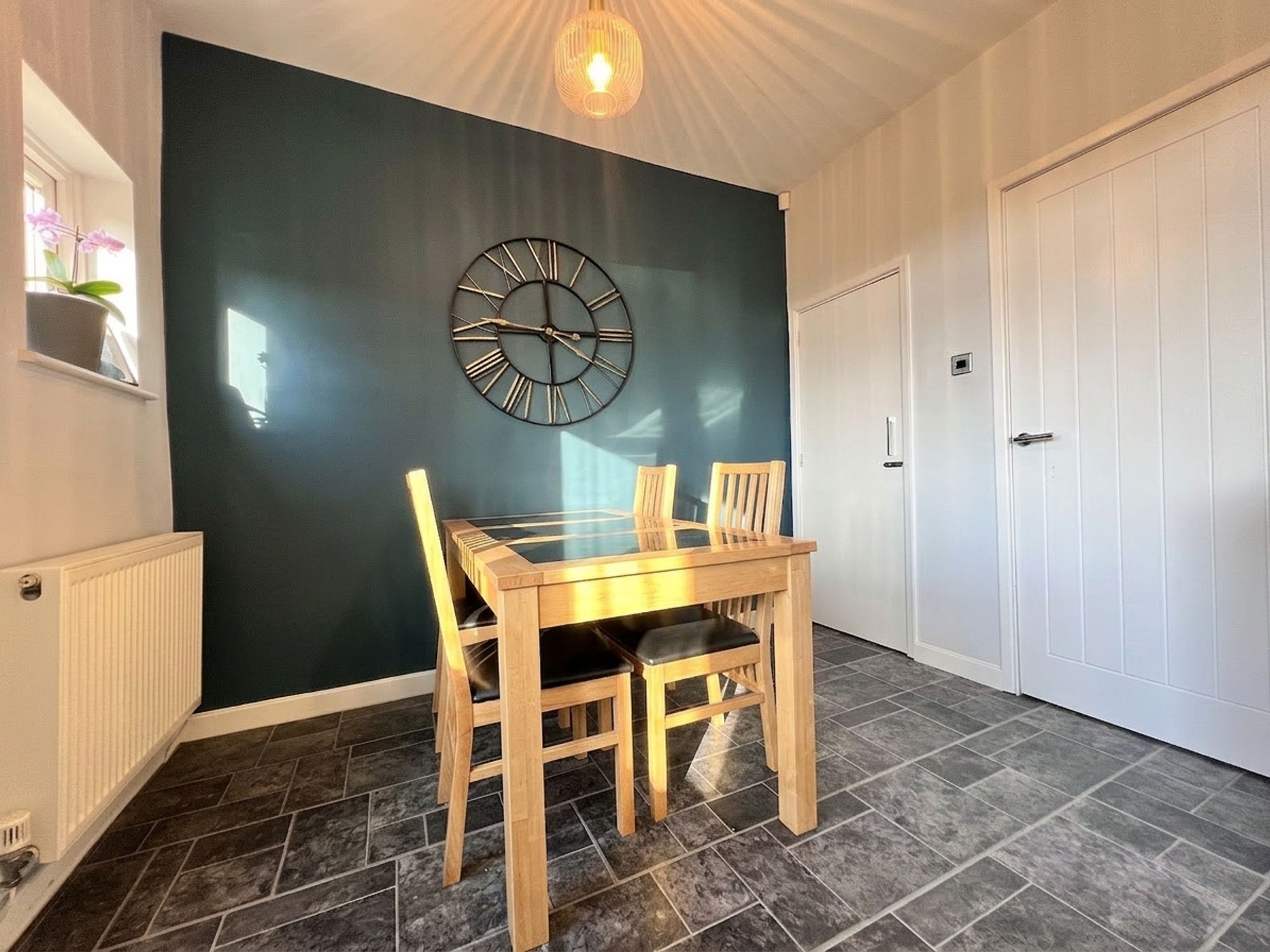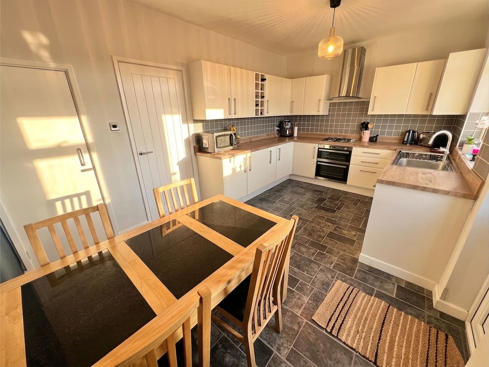 A fantastic sized dining kitchen, beautifully appointed with a range of contemporary white units complemented by wood-effect work surfaces, creating a stylish yet practical space. Integrated appliances include an electric oven and grill, four-ring gas hob with stainless steel extractor above, slimline dishwasher and a stainless steel sink with mixer tap, ideally positioned beneath a large window that frames idyllic views over the rear garden. Generous in proportion, the room comfortably accommodates a family-sized dining suite, making it perfect for both everyday living and entertaining. A door leads to a useful cupboard with an electricity supply, while a further door provides direct access to the garden, allowing indoor dining and entertaining to effortlessly extend outdoors.