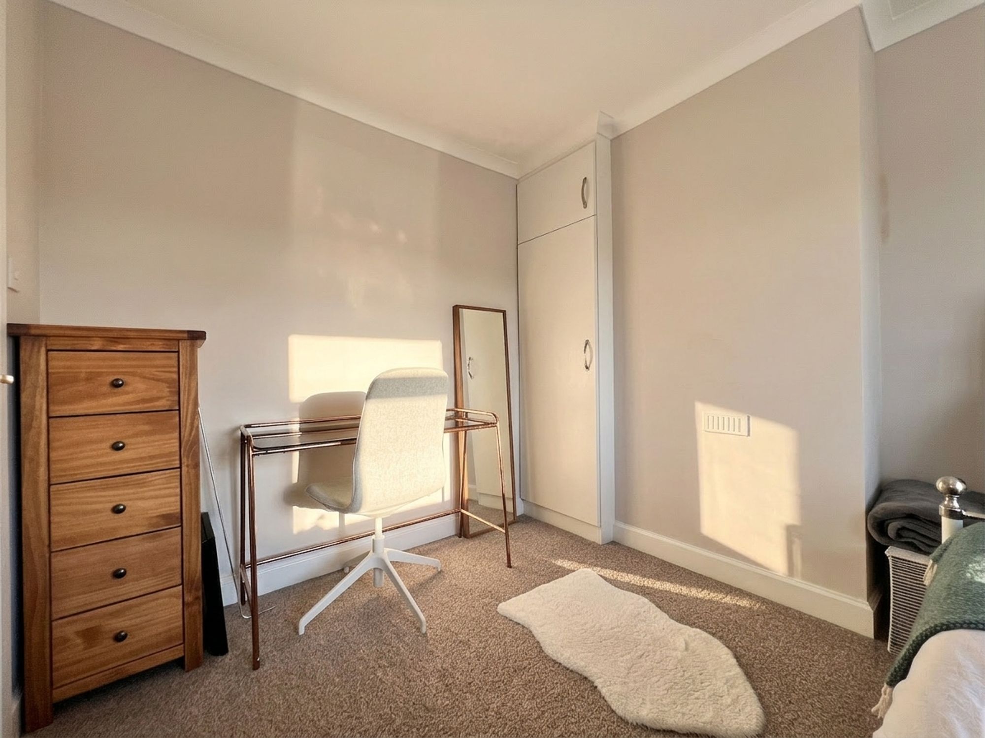 A light and airy bedroom, enhanced by double front-facing windows that allow natural light to flood the space. Decorated in soft, calming tones, this well-proportioned room offers flexibility for a variety of furniture arrangements, creating a comfortable and relaxing environment. There is also scope to build above the bulkhead, should the purchaser wish, providing an opportunity to further maximise storage space.