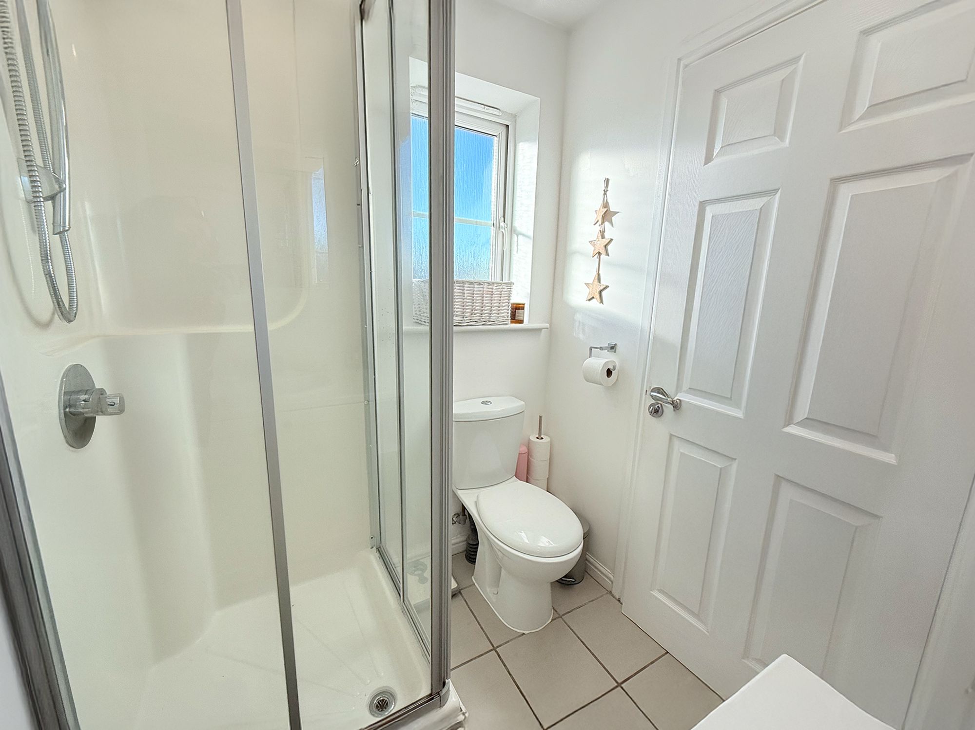 Fitted with a WC, vanity wash hand basin with chrome mixer tap and useful storage below, along with a shower featuring a handheld shower attachment. Finished in neutral tiling, the en-suite offers a clean, modern and practical space.