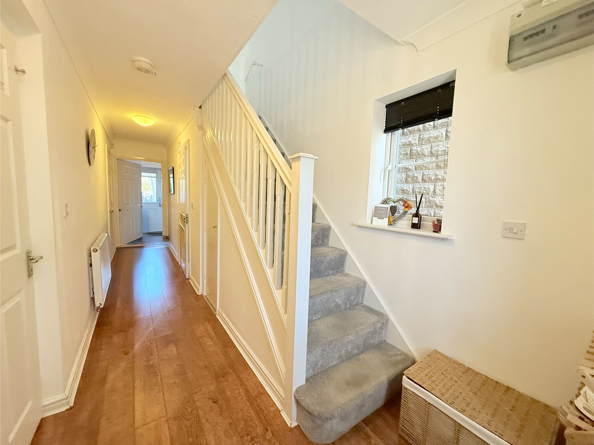 A welcoming entrance hall, neutrally decorated and finished with wood-effect laminate flooring. The hall provides access to the first floor, ground floor sitting room, bedroom four, utility room and shower room. The space further benefits from a useful understairs storage cupboard, ideal for coats and shoes, adding to the home’s practical appeal.