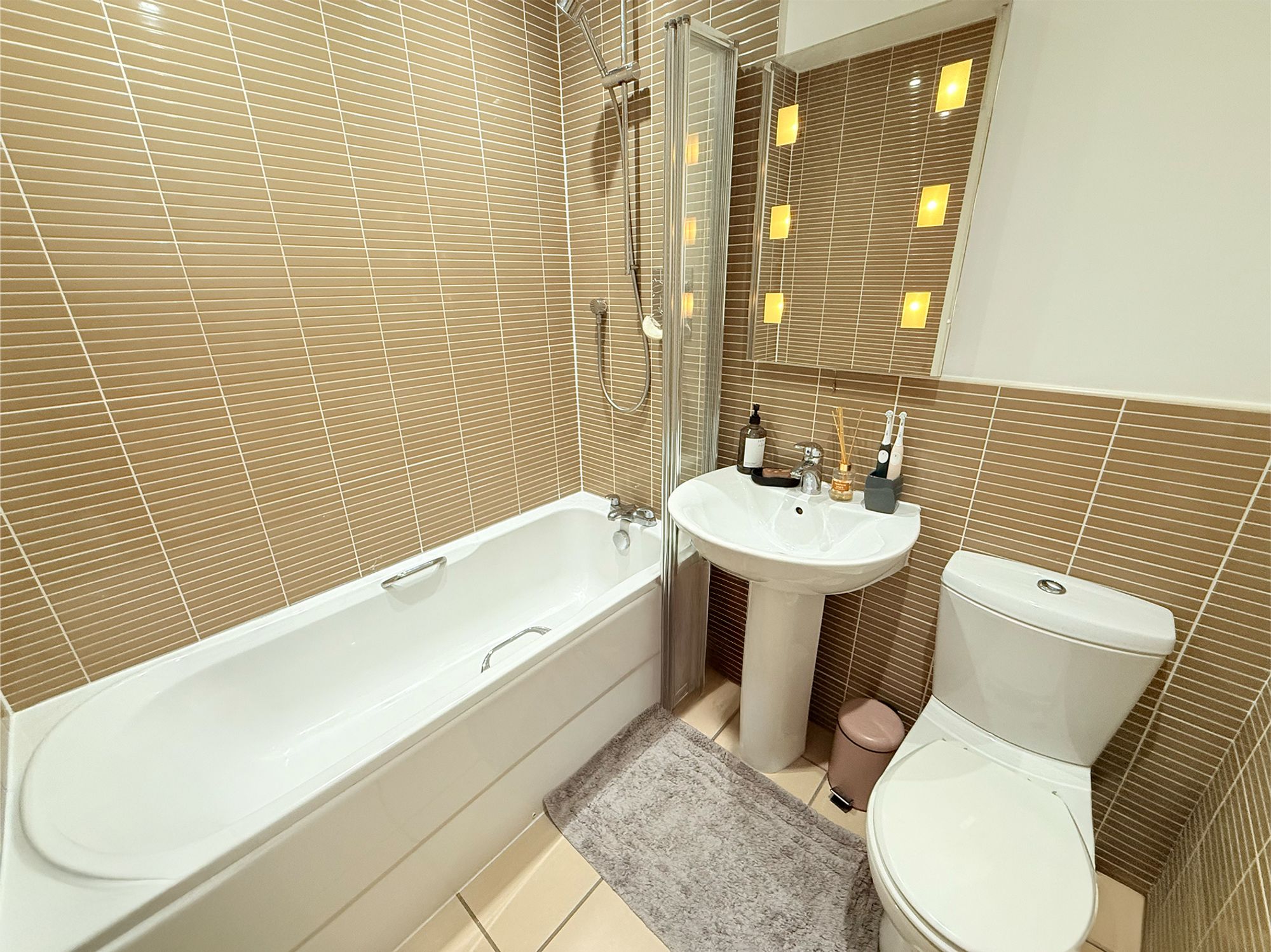 A contemporary family bathroom finished in sleek, natural-toned tiling. The space is fitted with a full-size bath with shower over and handheld attachment, pedestal wash basin with mixer tap, LED-lit mirror, and WC.