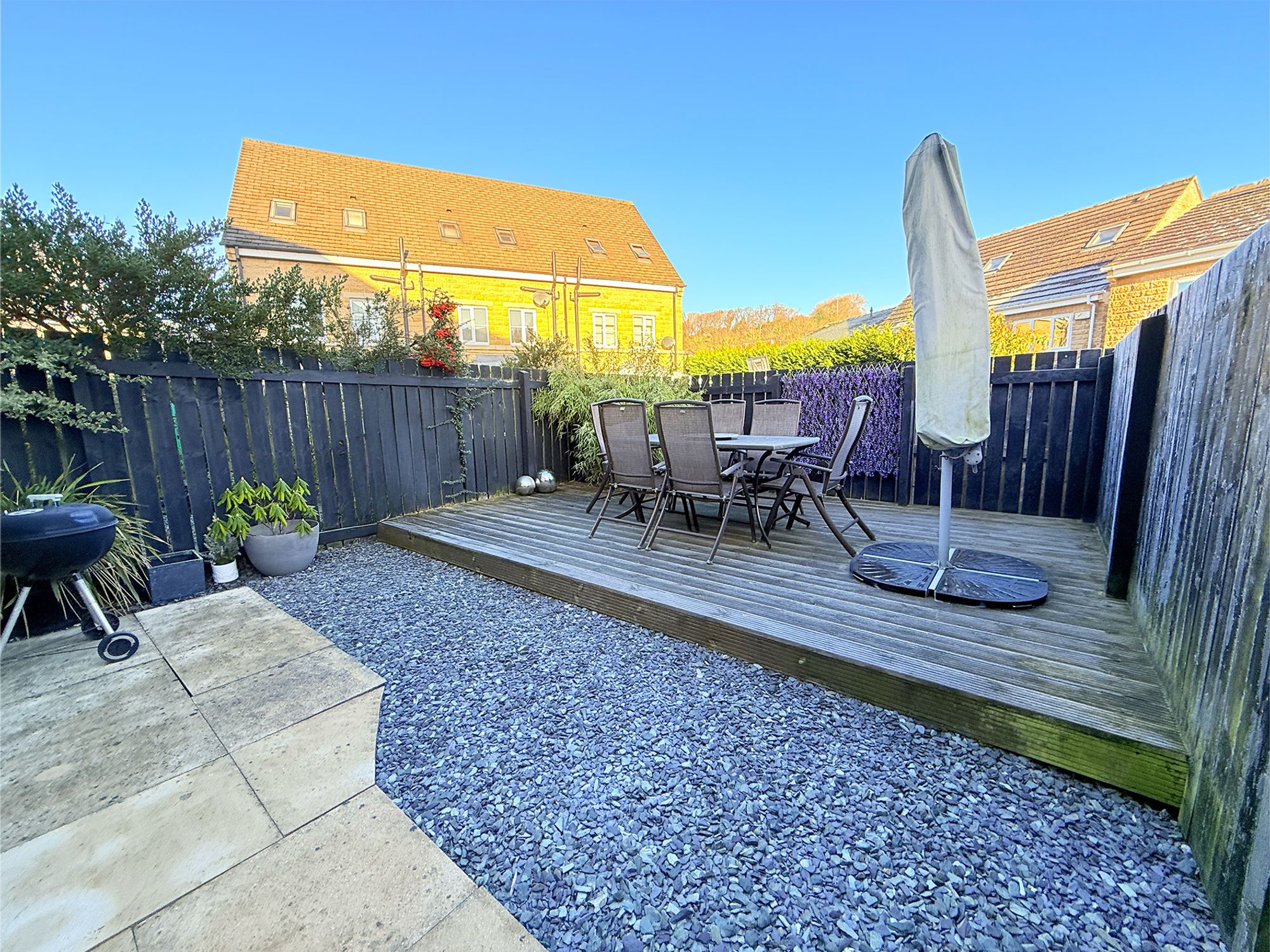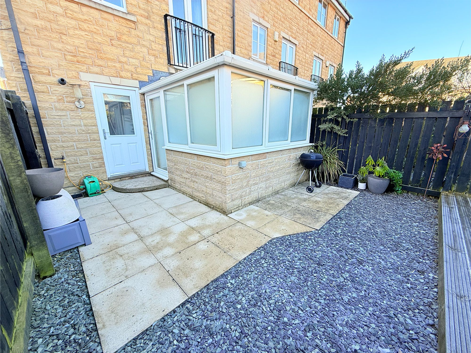 Accessed via the conservatory, utility room or a convenient side gate, the rear garden begins with a stone-flagged patio area, which leads onto a landscaped slate-chipped lawn. This continues to a raised wooden decking area, ideal for alfresco dining and socialising during the warmer months. Fully enclosed by wooden fencing, the garden is designed with low maintenance in mind and provides a safe space for children and pets. The garden further benefits from outdoor electrics and an external tap, adding to its practicality.