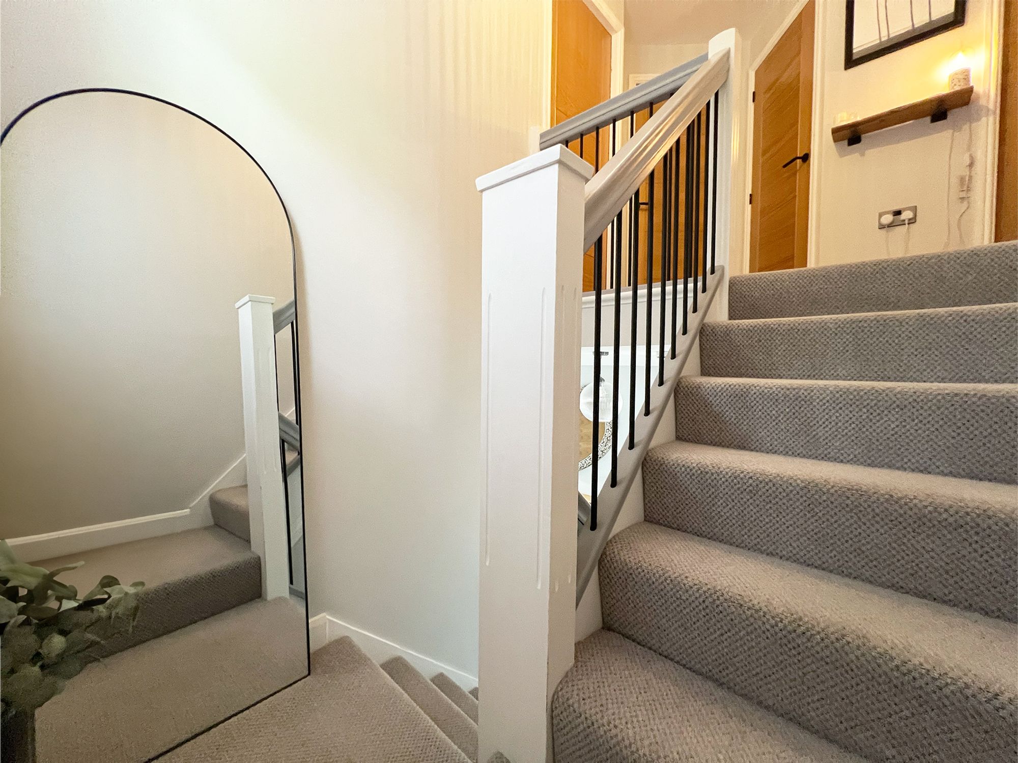 Oozing curb appeal, the front of the property is beautifully maintained, with a neat lawn that adds a touch of greenery to the approach along with decorative planters, perfect for potting plants and introducing a splash of colour. The driveway provides off-road parking for two vehicles and leads to the integral garage, offering convenient storage. Newly fitted wooden gates provide access down either side of the property, leading to the fully enclosed rear garden, an ideal space for children and pets to enjoy safely. The rear garden itself enjoys an incredibly private outlook, thanks to the woodland beyond. Divided into two tiers, it features a charming patio area, perfect for alfresco dining or relaxing in the sun. A handy storage shed is tucked away, ideal for housing garden essentials, completing this wonderful outdoor space.