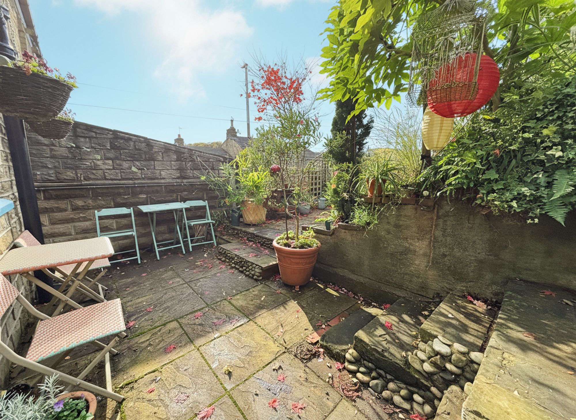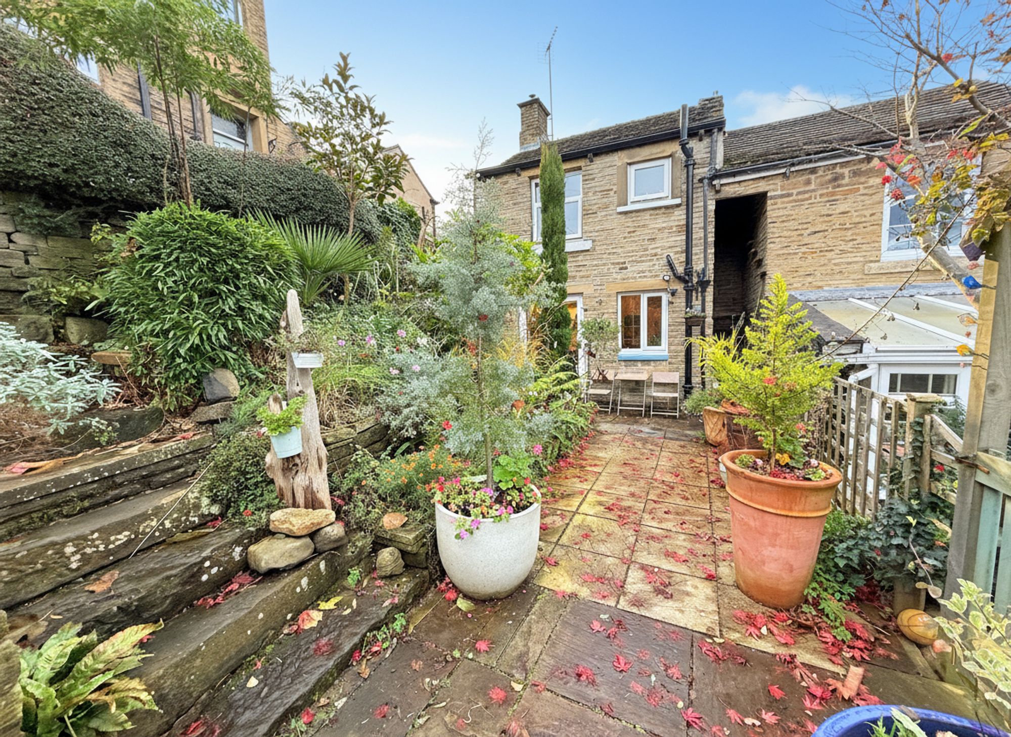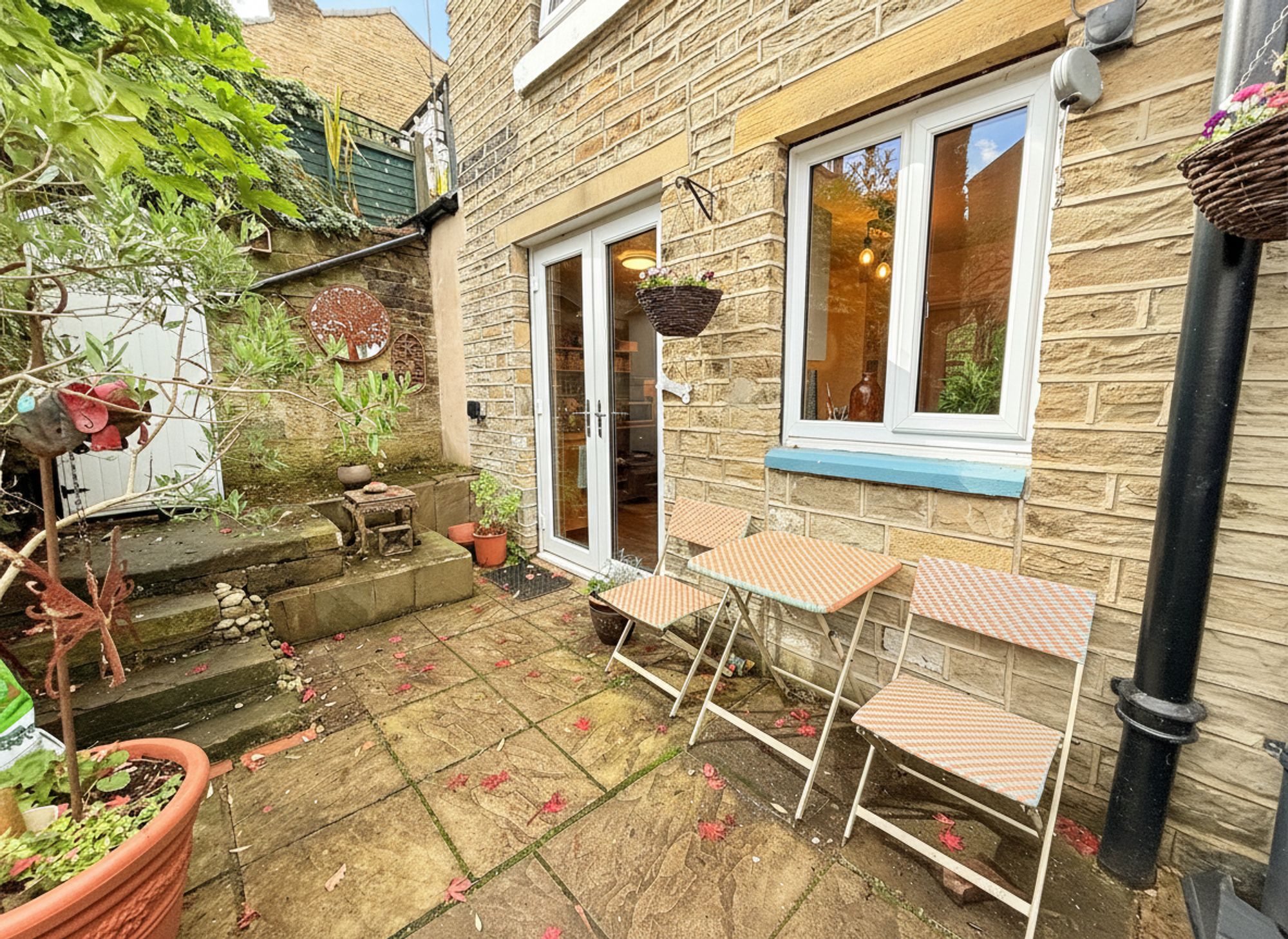 Accessible through French doors from the kitchen-diner, the rear garden features an attractive stone patio area, perfect for socialising and al fresco dining. An additional raised stone patio with outdoor electrics provides further entertaining space. Beyond this, a further stone pathway leads to beautifully maintained, tiered flower beds filled with mature plants and a charming seating area, currently housing a greenhouse. At the far end of the garden sits a solid stone-built shed with power points, offering excellent outdoor storage. There is also gated access to the driveway, along with a right of access for neighbouring properties. Additional space down the side of the property provides further convenient storage space.
