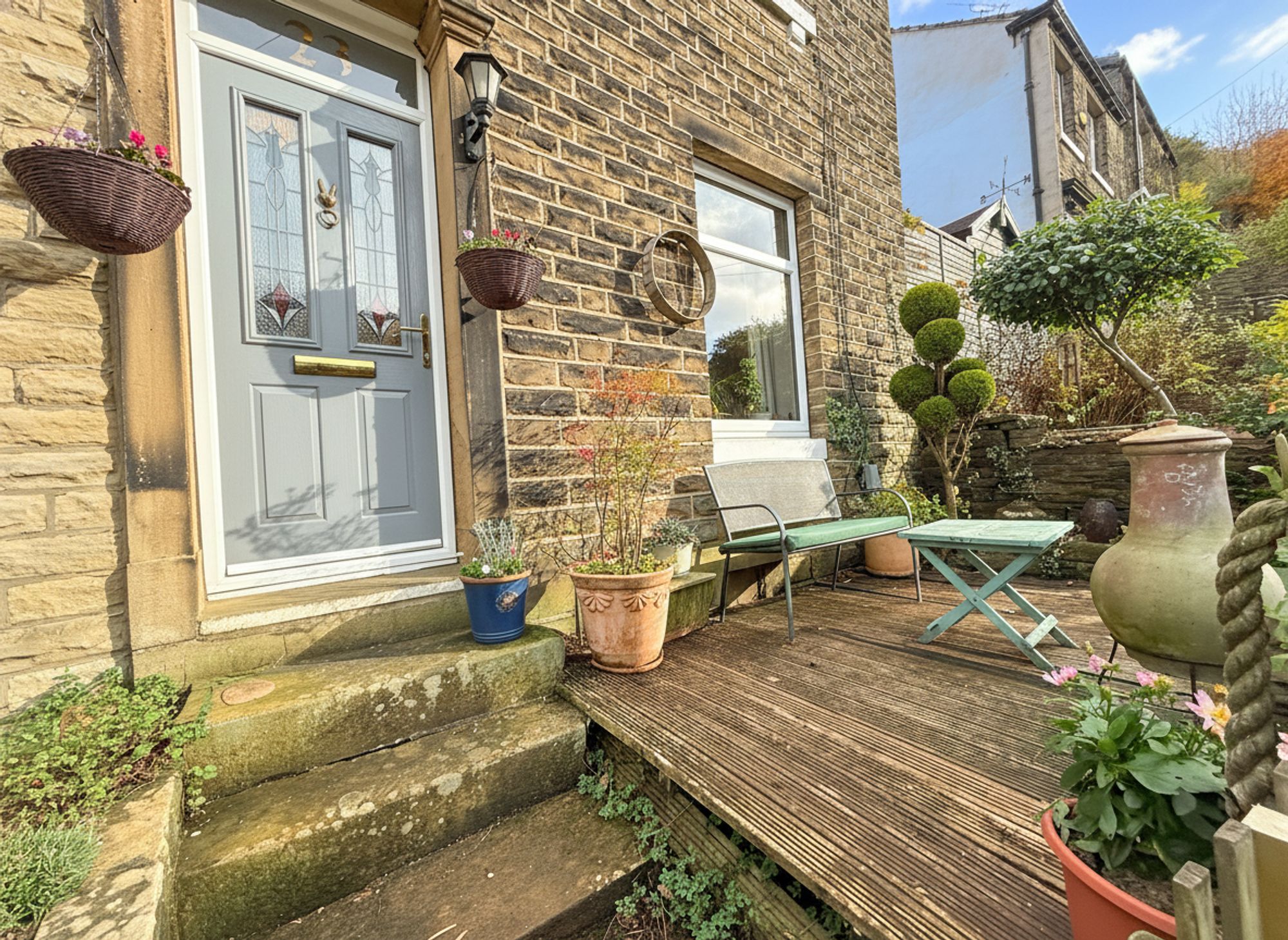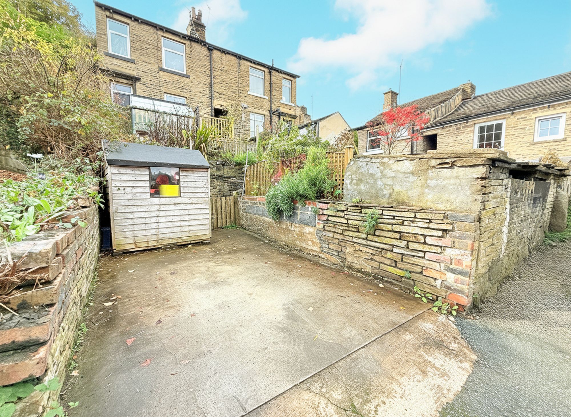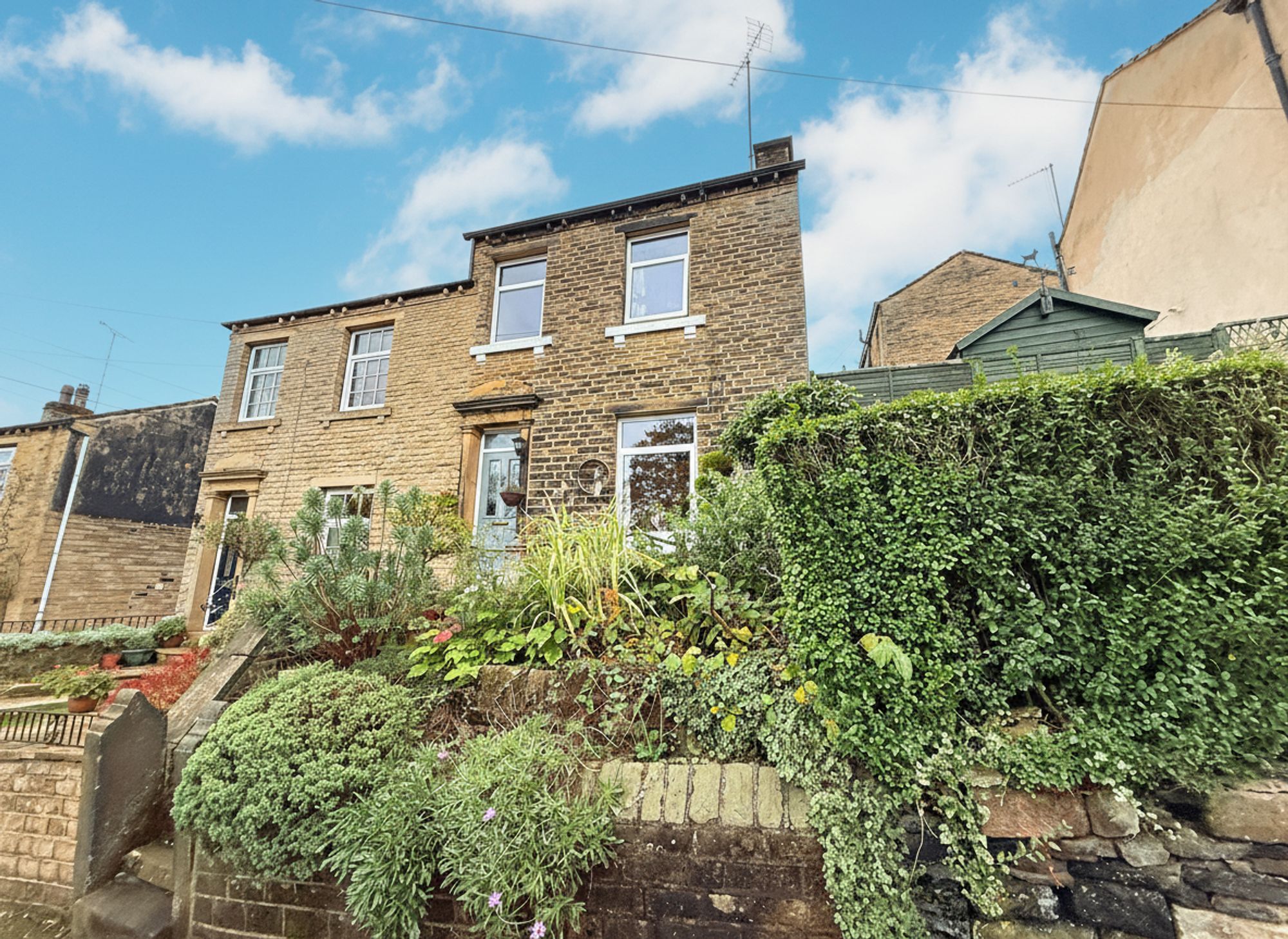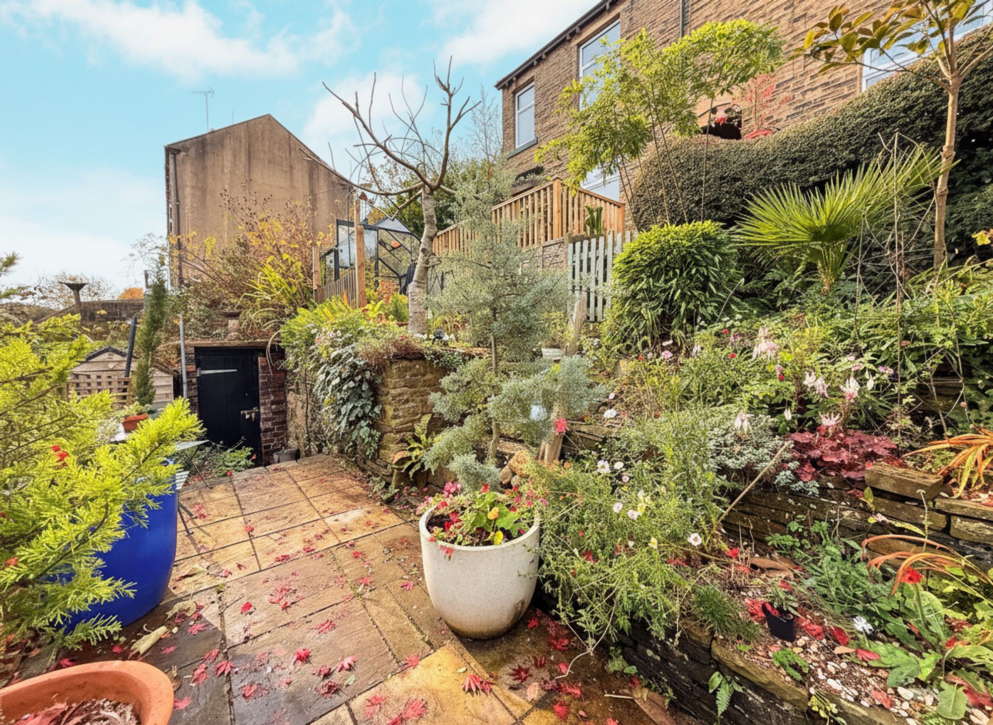 Accessible through French doors from the kitchen-diner, the rear garden features an attractive stone patio area, perfect for socialising and al fresco dining. An additional raised stone patio with outdoor electrics provides further entertaining space. Beyond this, a further stone pathway leads to beautifully maintained, tiered flower beds filled with mature plants and a charming seating area, currently housing a greenhouse. At the far end of the garden sits a solid stone-built shed with power points, offering excellent outdoor storage. There is also gated access to the driveway, along with a right of access for neighbouring properties. Additional space down the side of the property provides further convenient storage space.