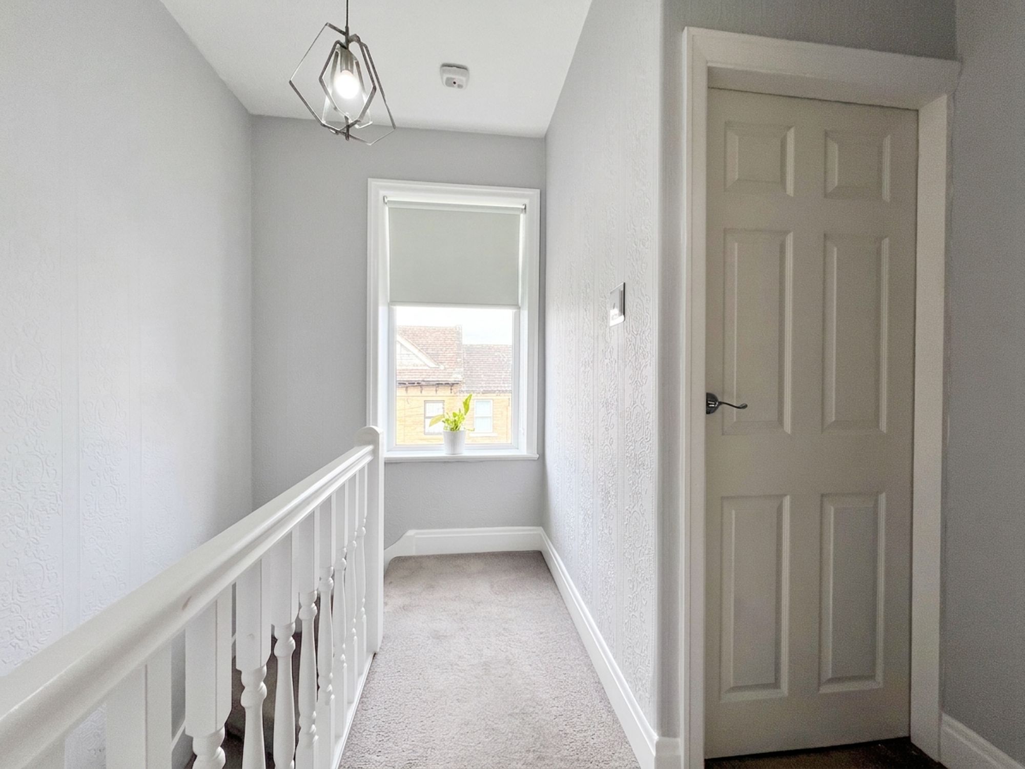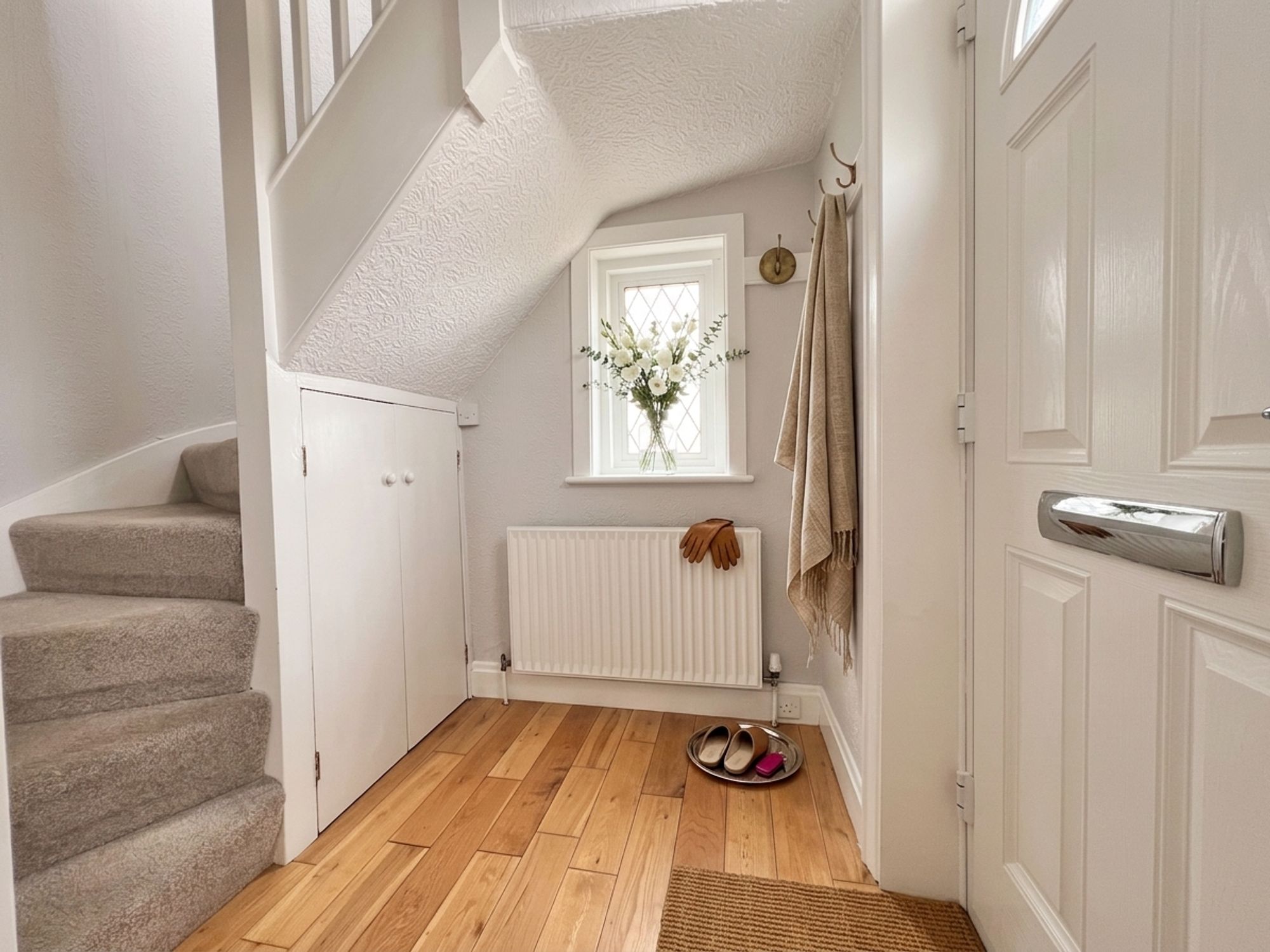 A spacious and welcoming entrance hallway offering ample room to store outdoor garments, creating a practical introduction to the home. Stairs rise to the first floor, with useful storage beneath ideal for keeping shoes neatly tucked away, while a door leads through to the lounge.