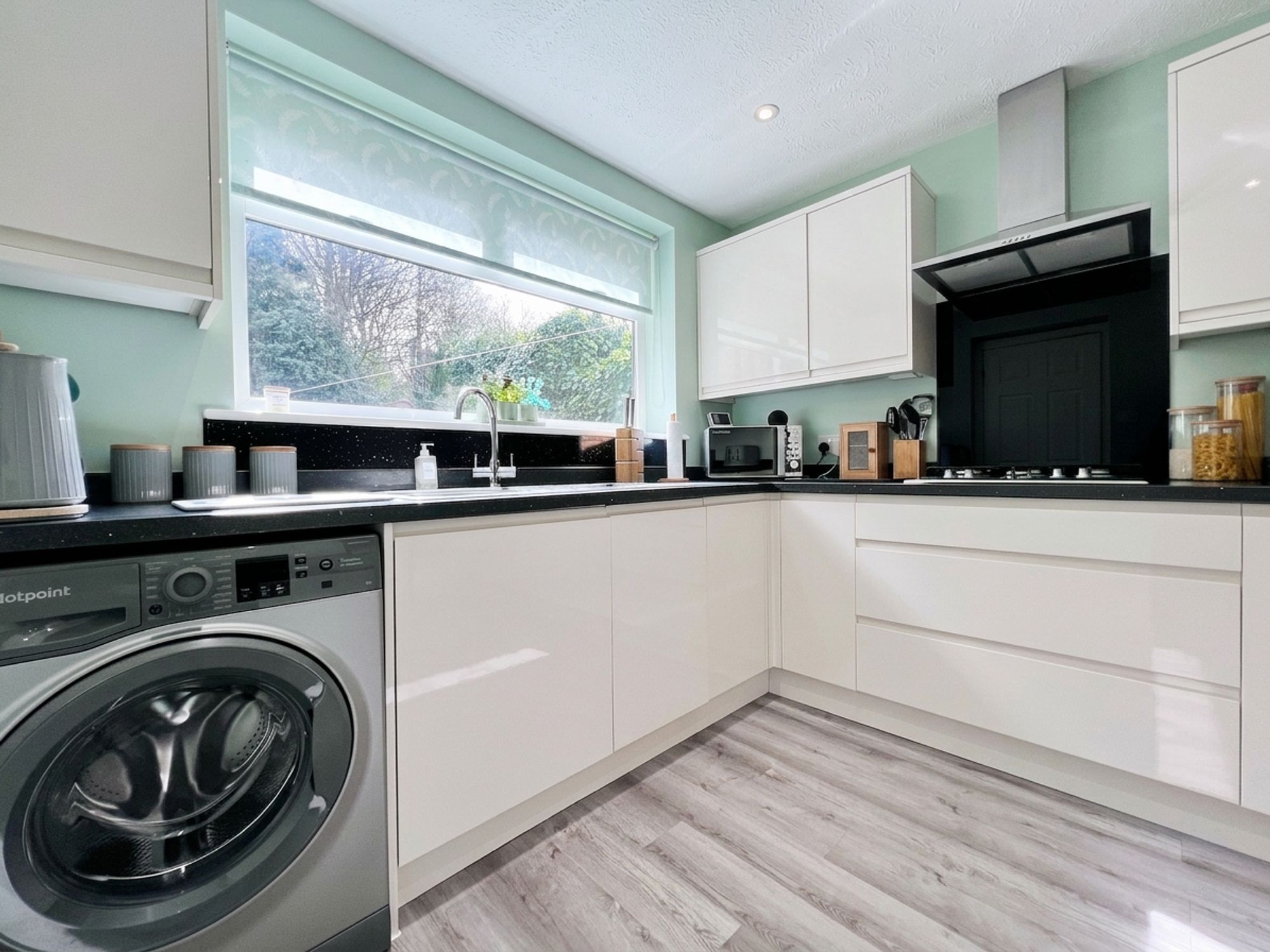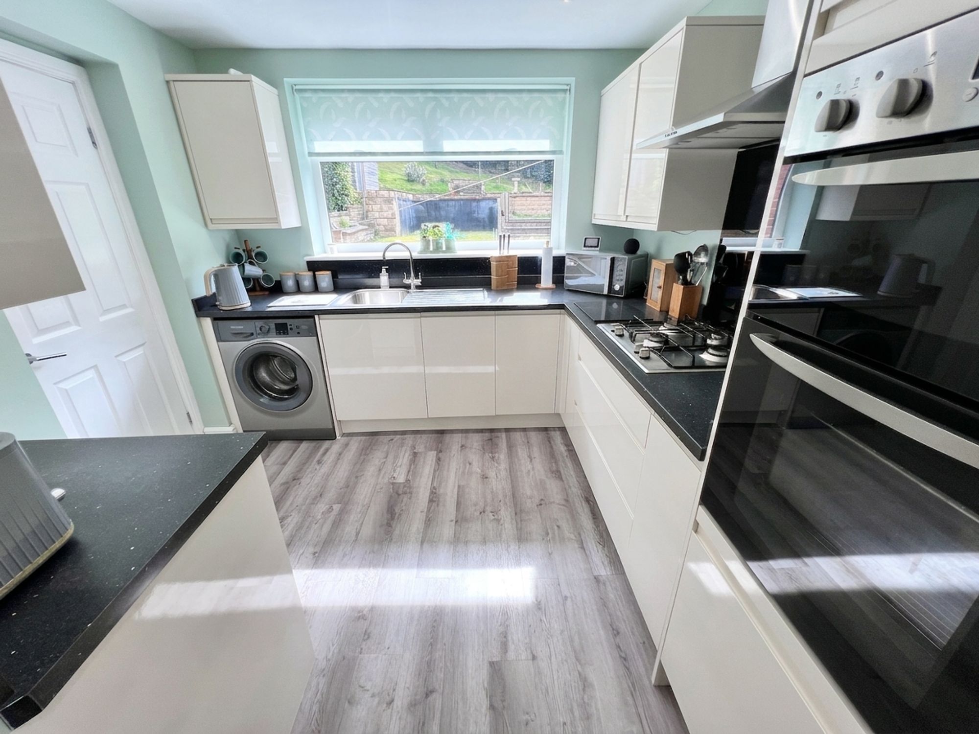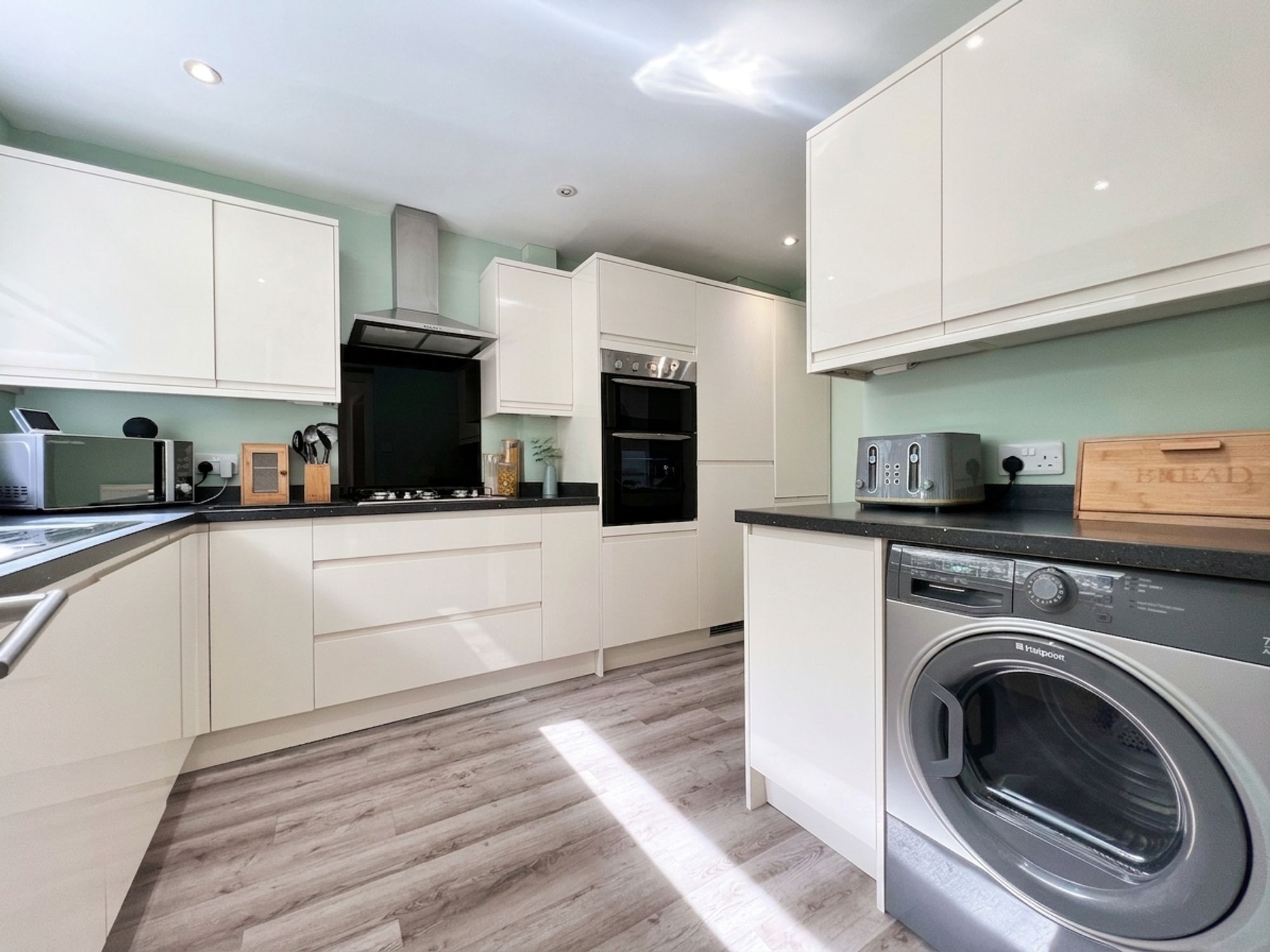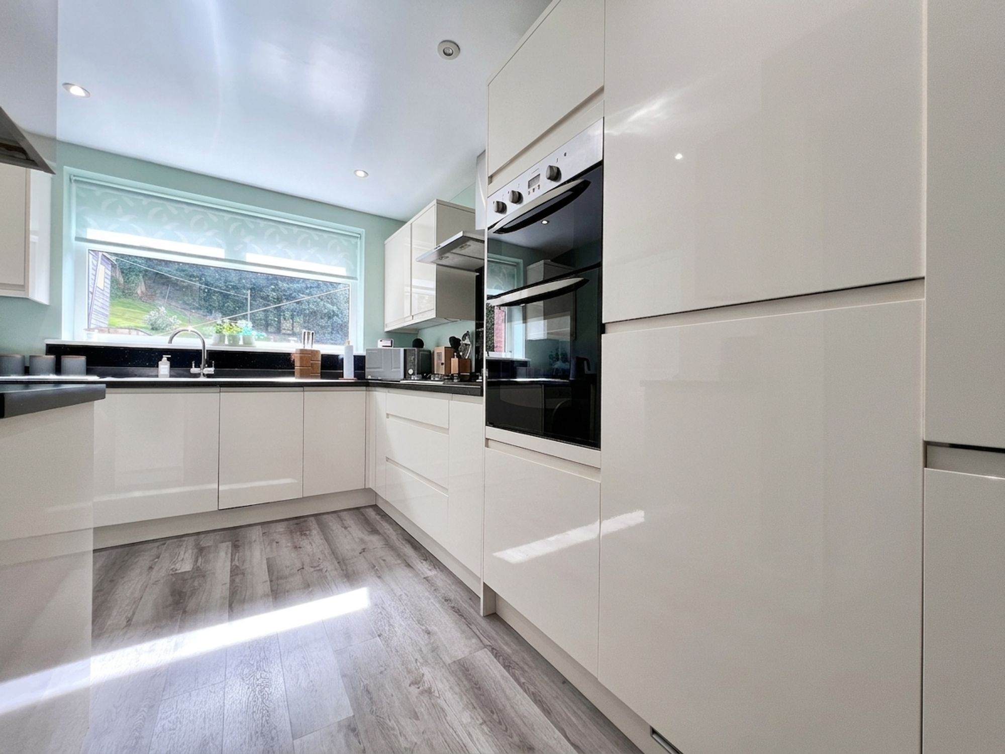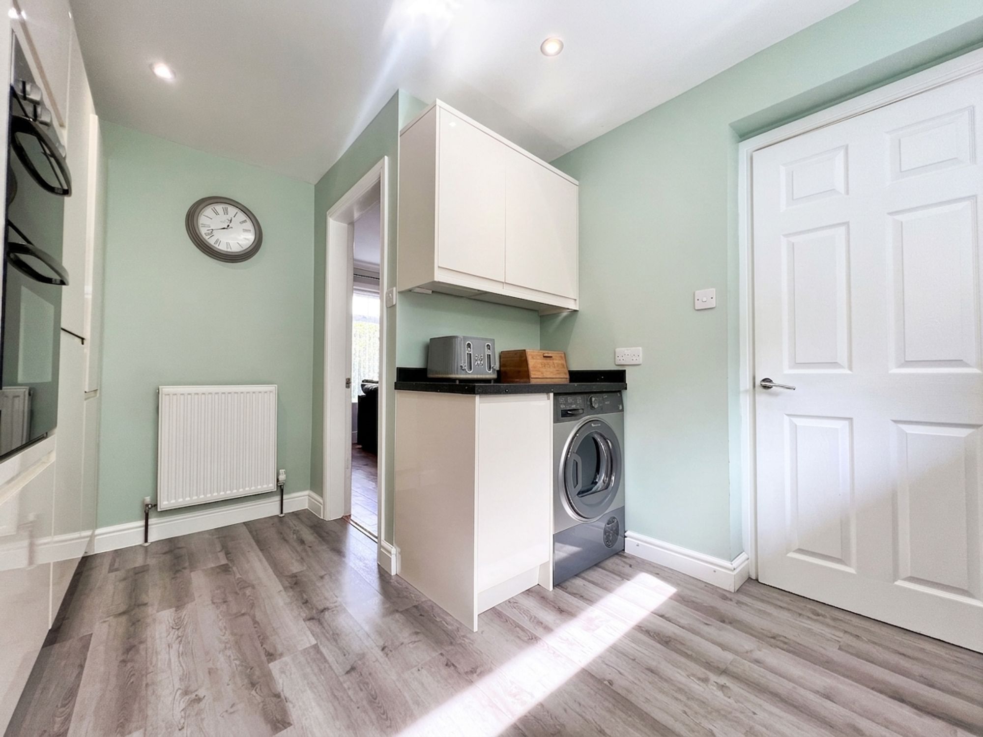 The kitchen is stylishly appointed with a range of contemporary high-gloss handleless units, complemented by contrasting work surfaces to create a sleek and modern finish. Integrated appliances include an electric oven and grill, four-ring gas hob, fridge freezer and dishwasher, along with a stainless steel sink with mixer tap, ideally positioned beneath a picture window framing lovely views over the large rear garden. There is also plumbing for a washing machine and space for a tumble dryer, ensuring the space is both practical and perfectly suited to everyday family living.